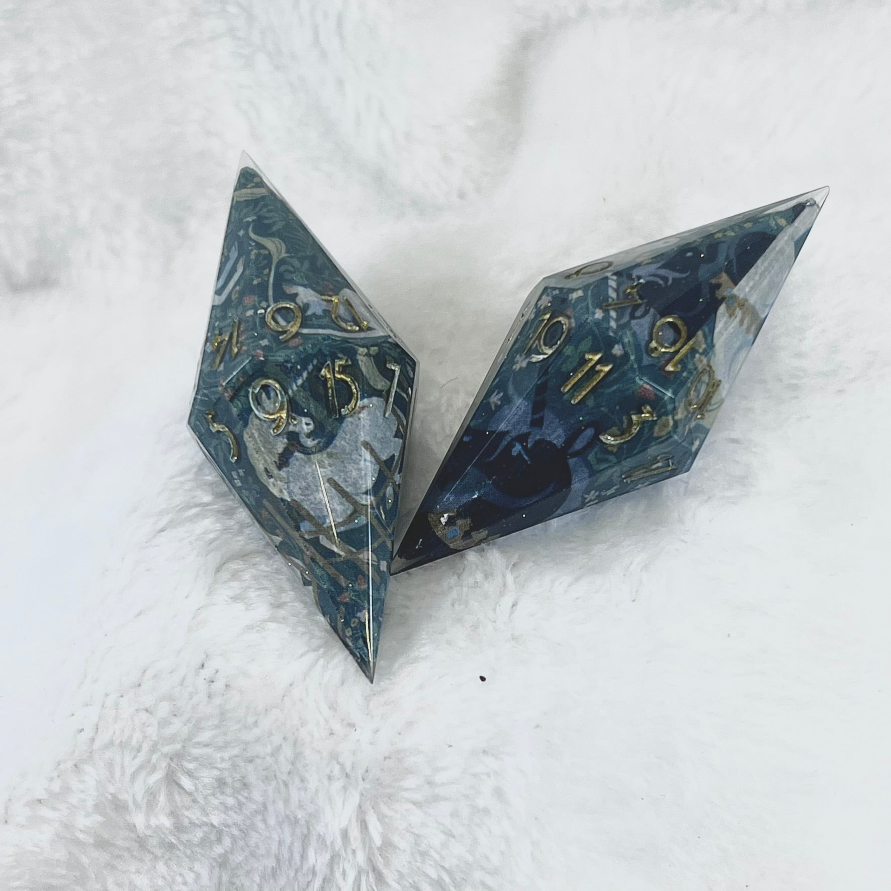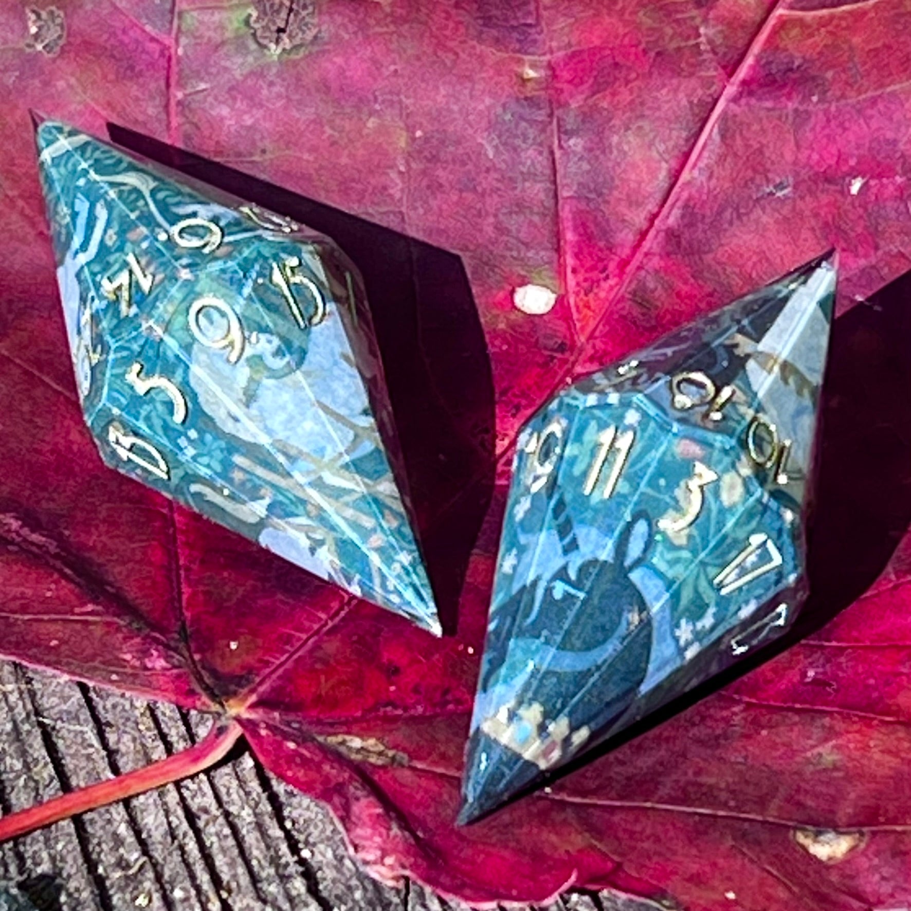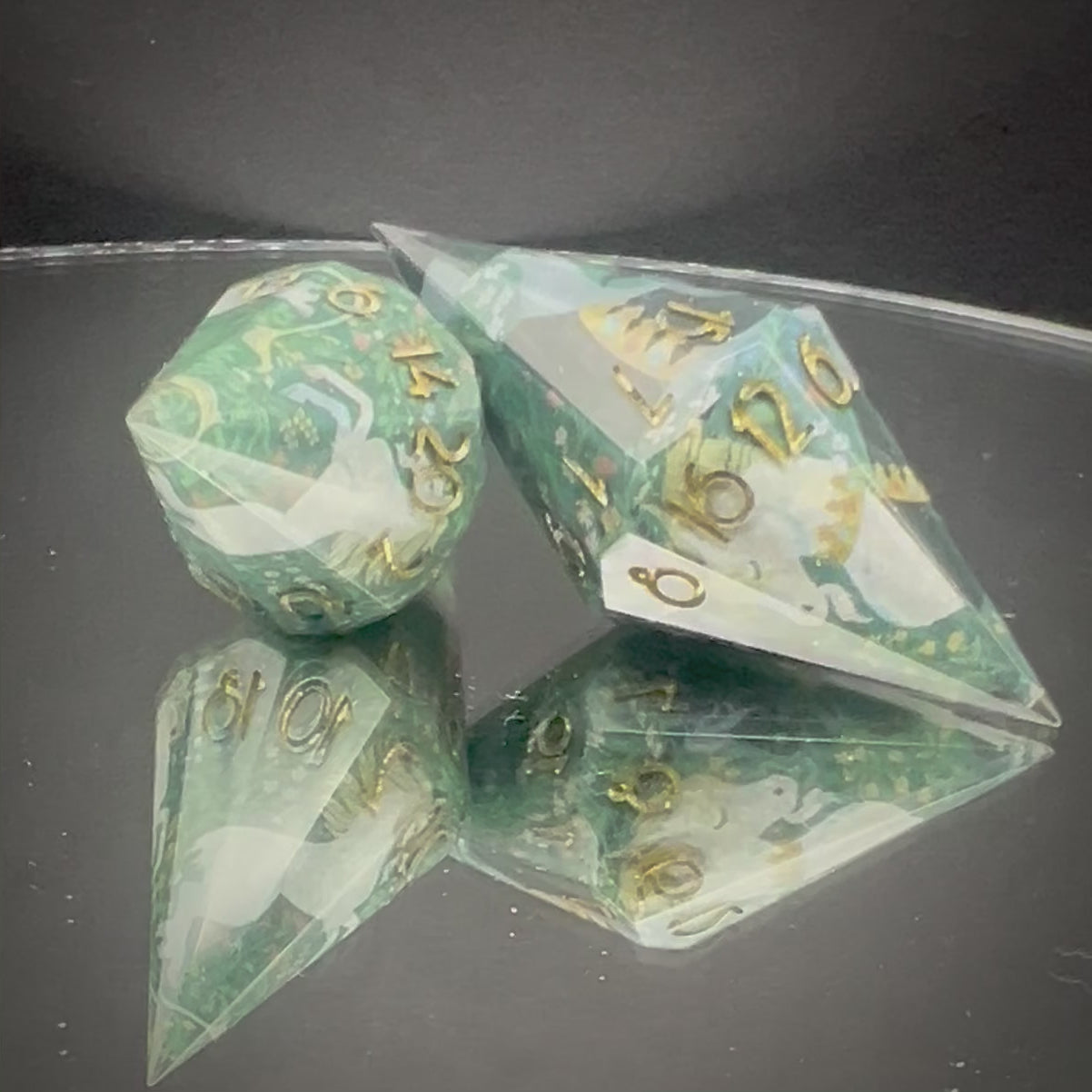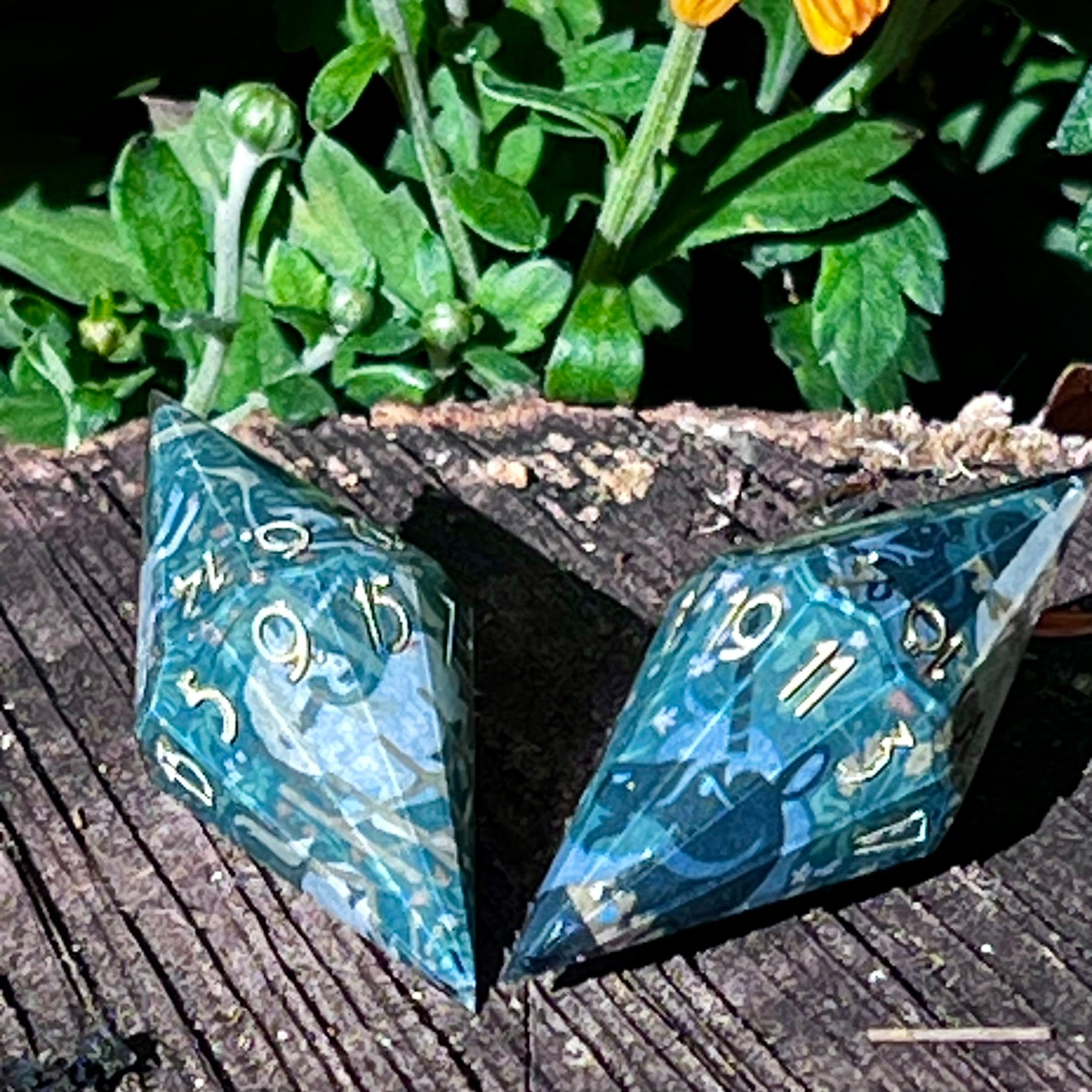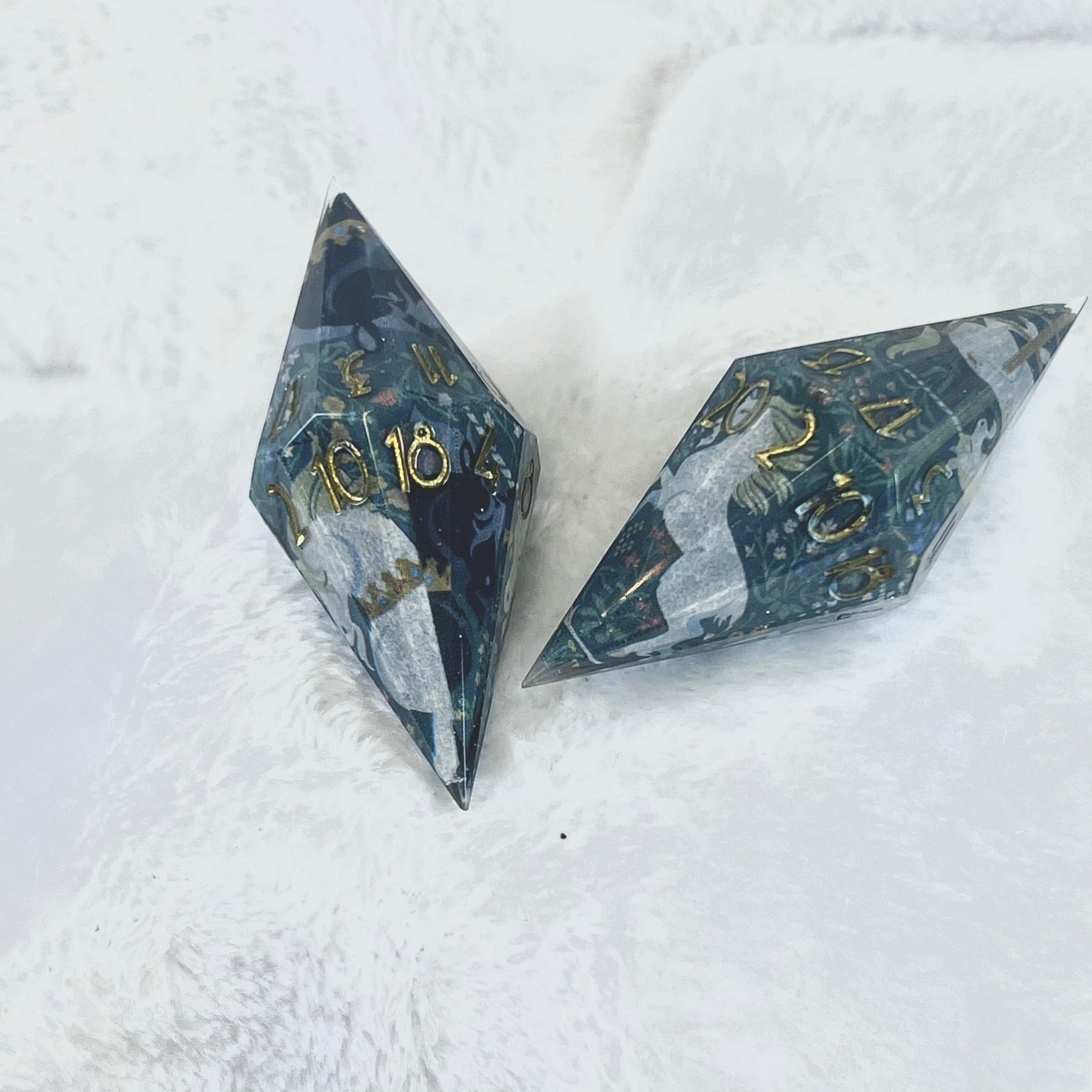 This advantage d20 set tells the story of two unicorns—one trapped, one free. The artwork, designed by Stephne Tate (@quailtea), weaves their tale around each die, showing how a black unicorn liberates her captive counterpart. Just like the two dice rolled together, these unicorns symbolize that often two will succeed where one does not.