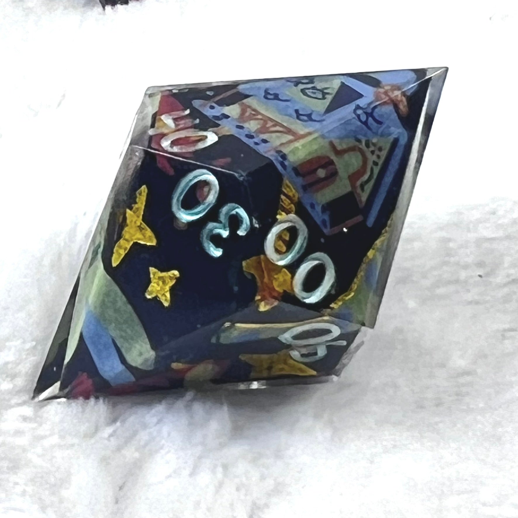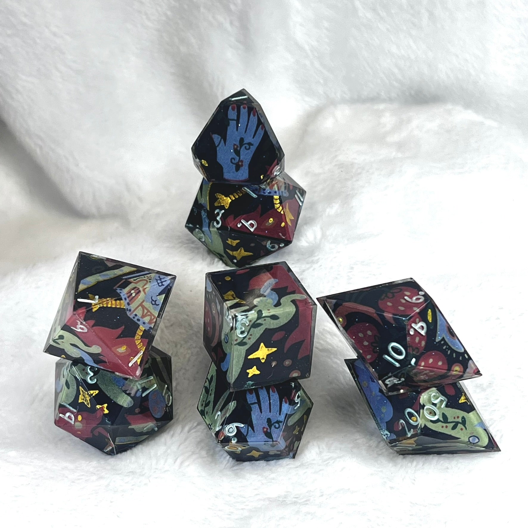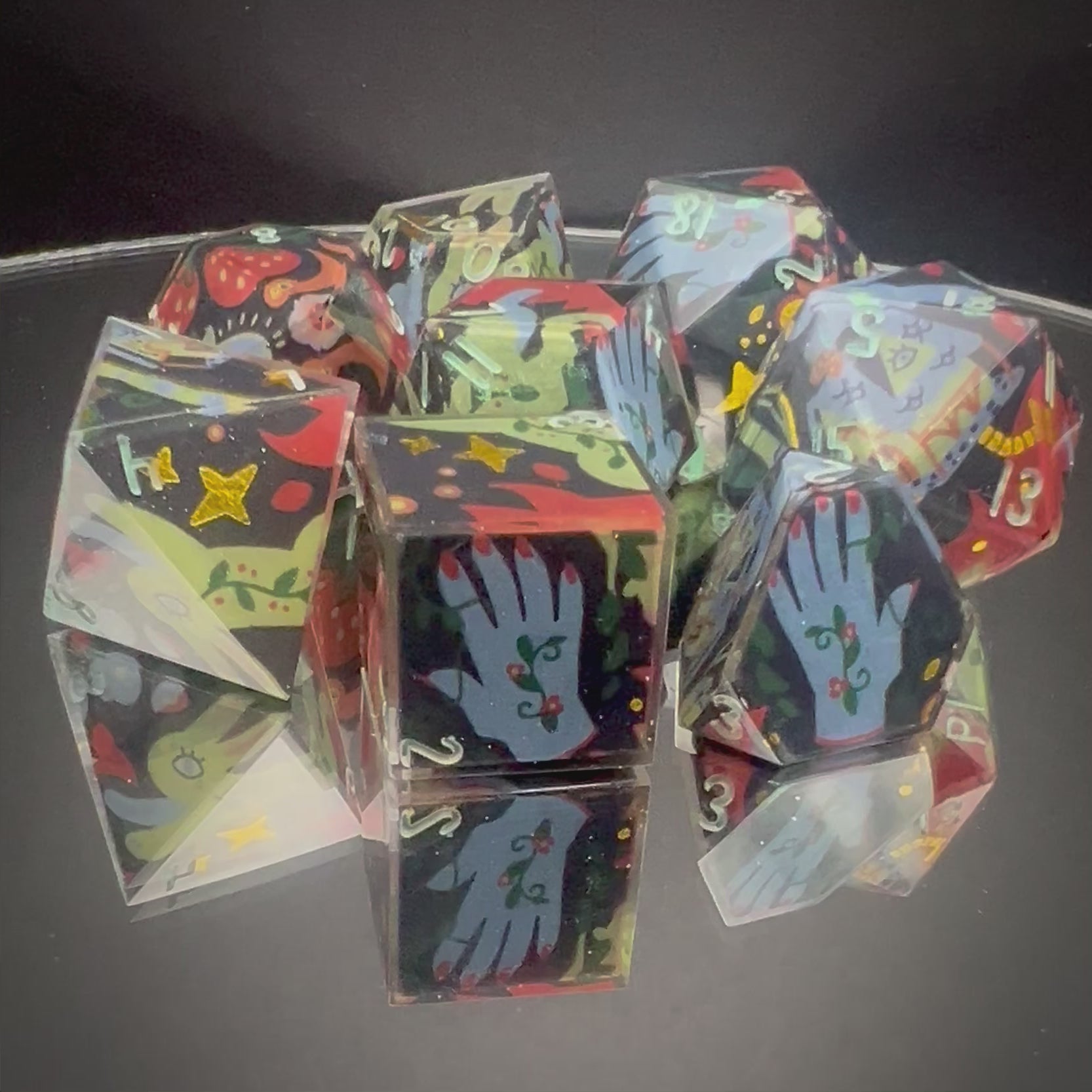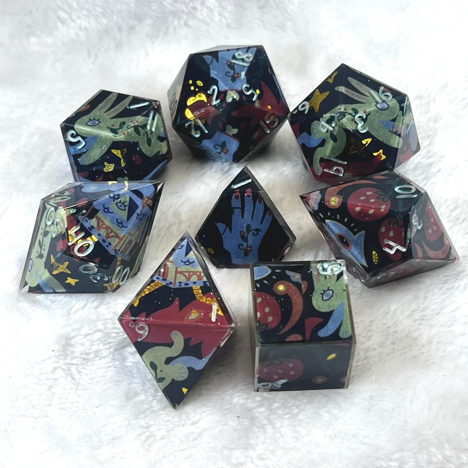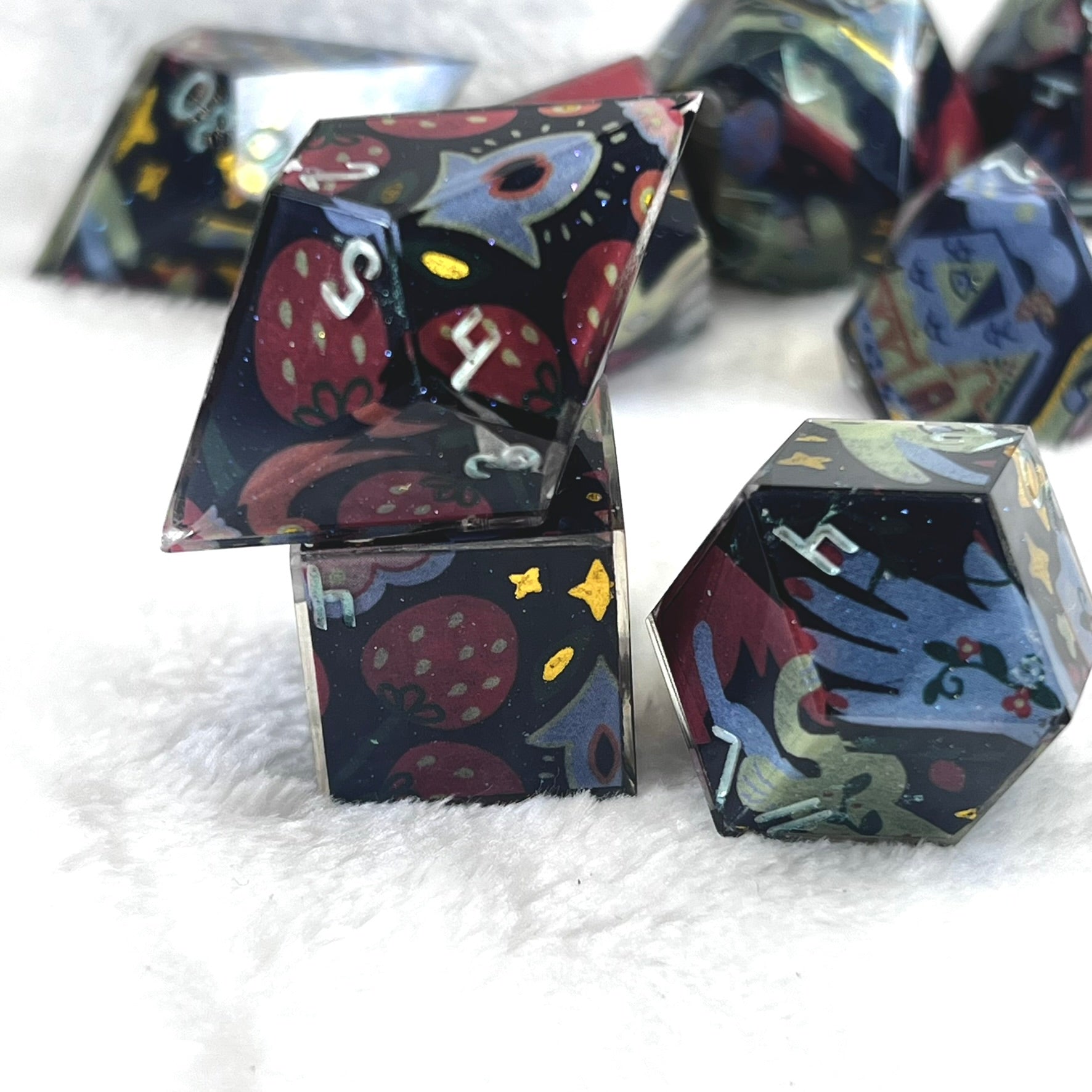 Inspired by the tales of Baba Yaga, this art-view dice set features washi tape (by Nicole Goux and the Washi Station) depicting her famous cottage on chicken legs, a hopping rabbit, and charming strawberries amidst magical hands. The intricate designs bring to life a world where folklore and magic intertwine. Whether you're drawn to the mysterious cottage or the curious rabbit hopping along, this set will add a layer of enchanting storytelling to your game.