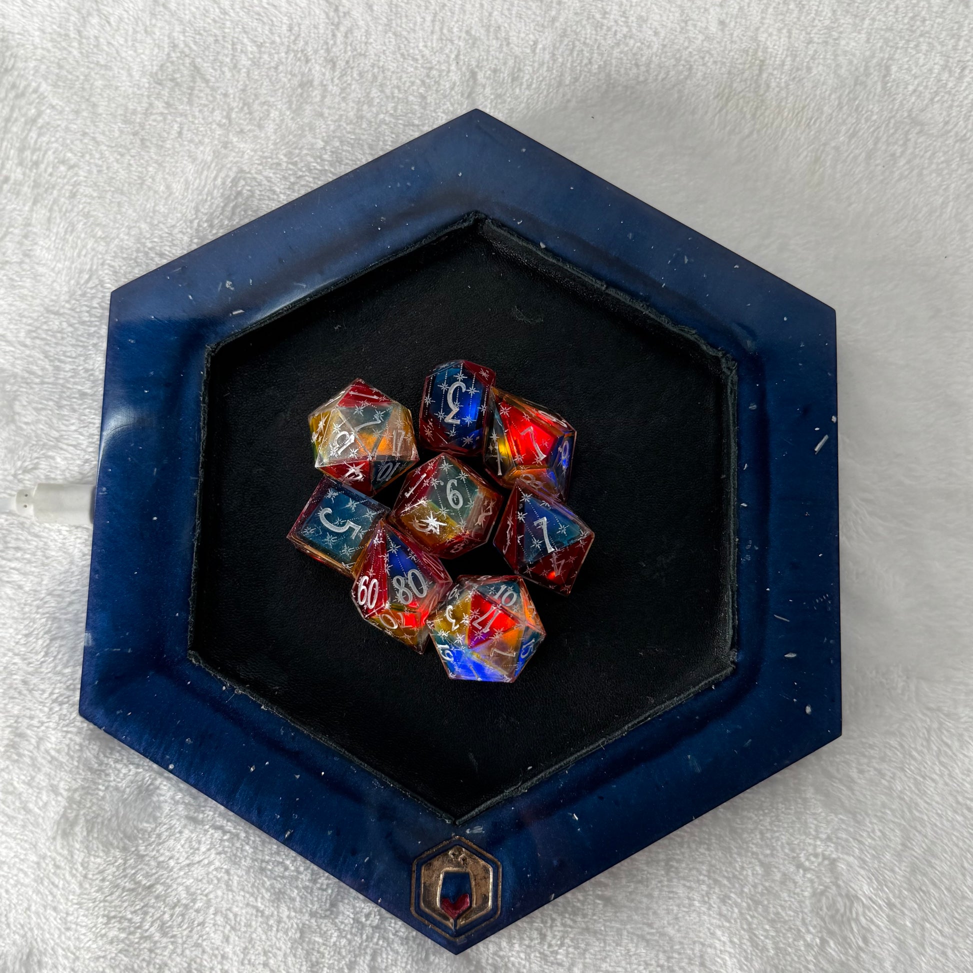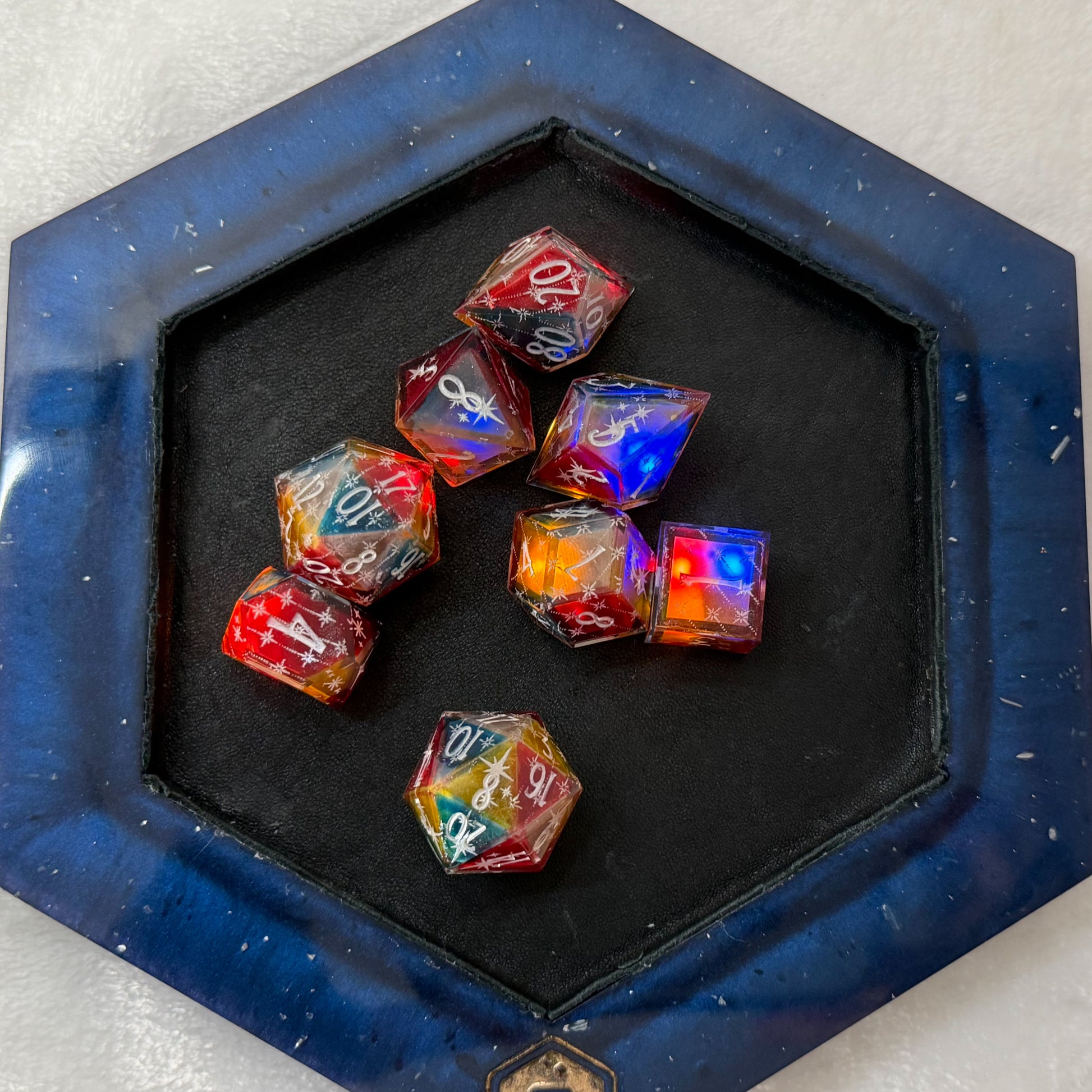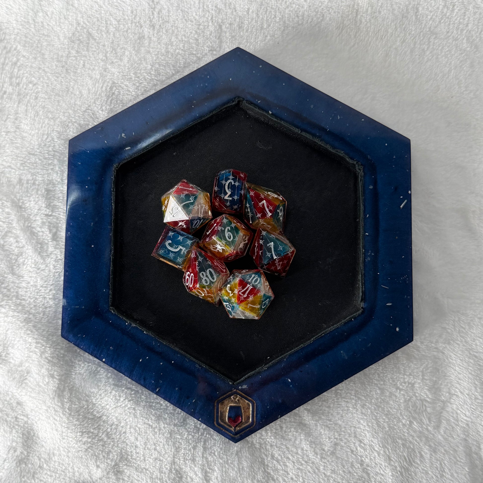 - These are handmade resin dice, and like all handmade things, small variations and surface imperfections may occur. They are cast, sanded, and polished by hand—not mass-produced. The dice tray, too, is cast resin, and goes thru the same polishing process as my handmade dice—though admittedly a bit less rigorously.