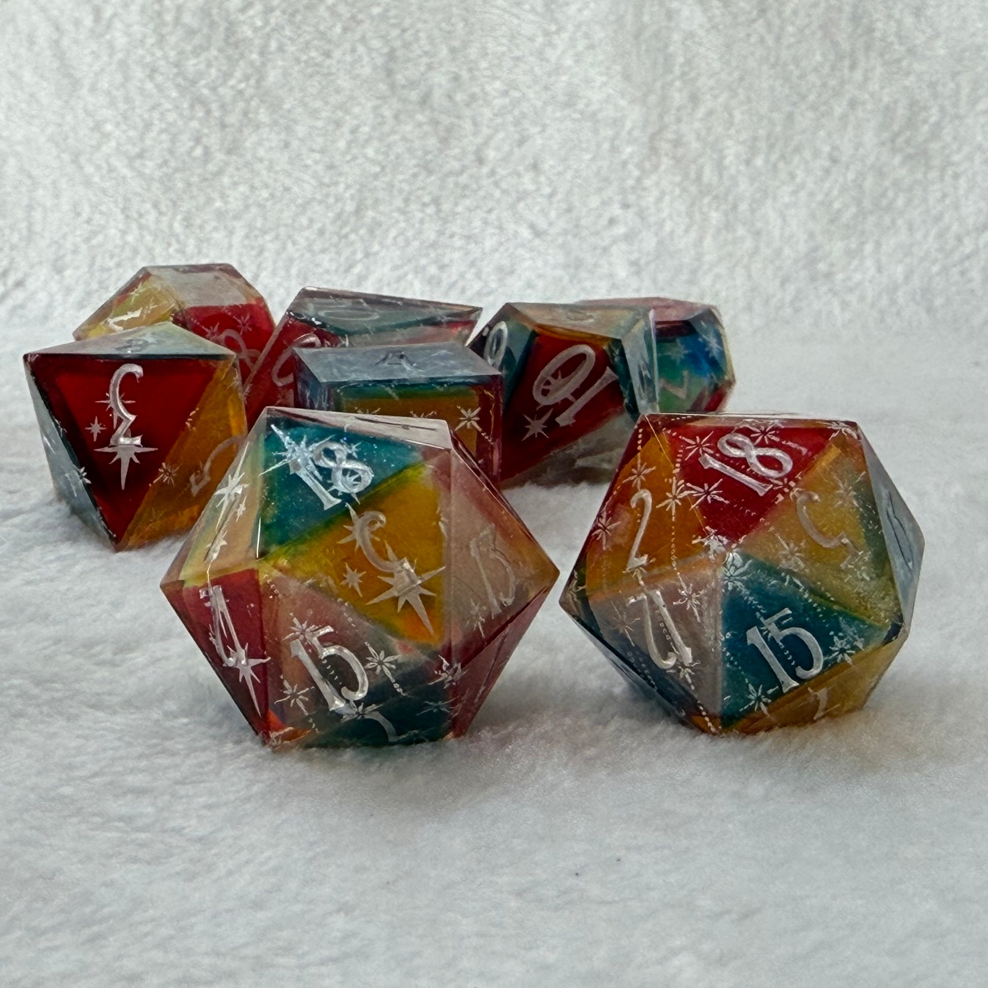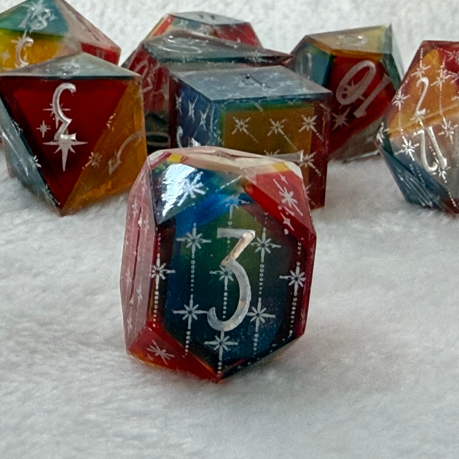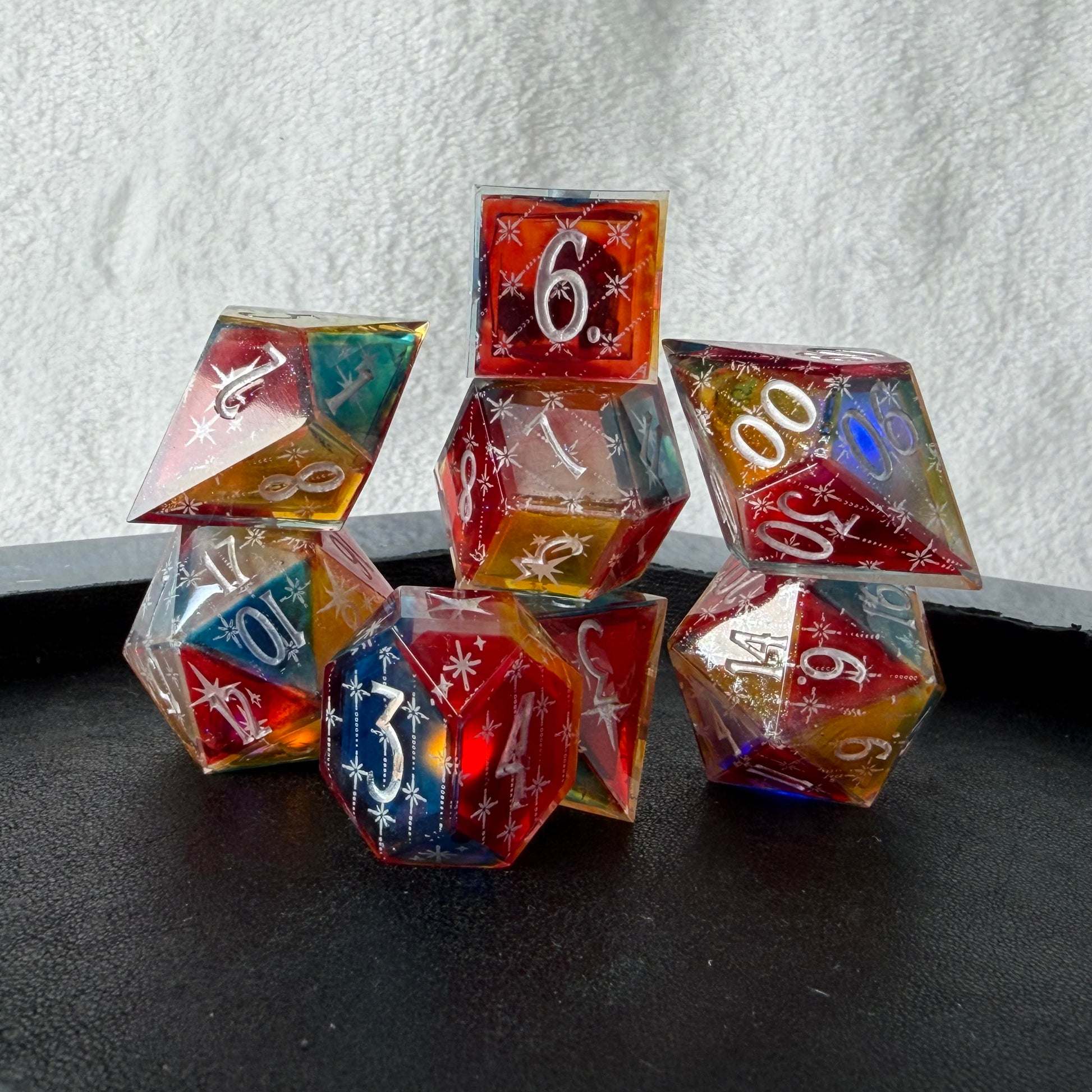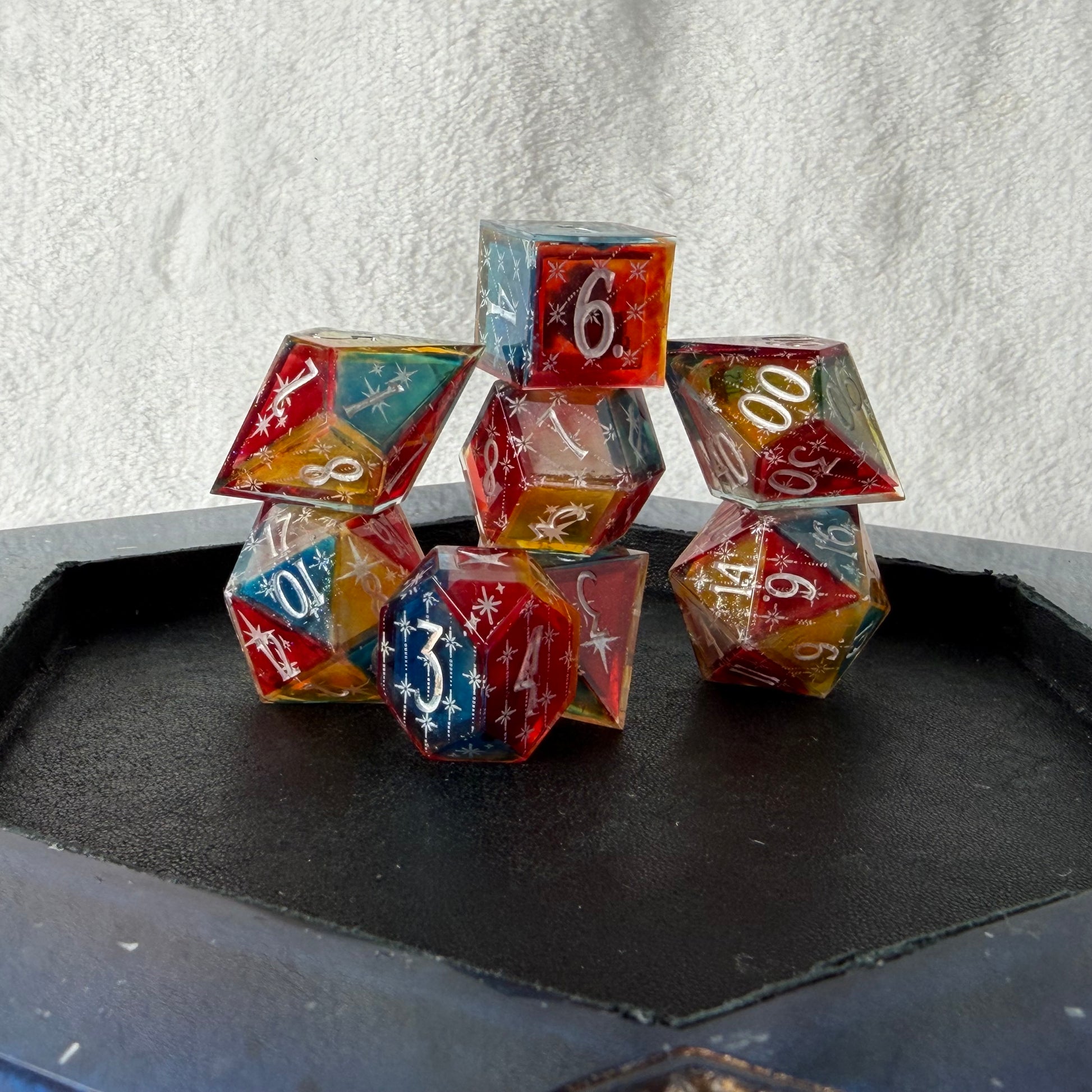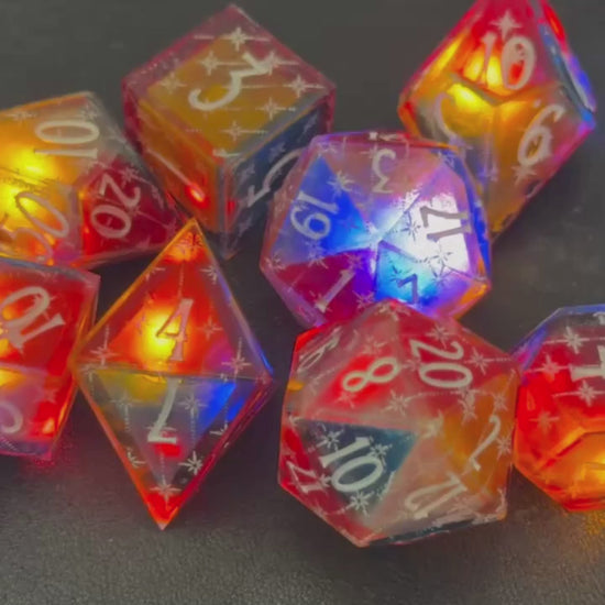 Each face of these dice is tinted with translucent red, blue, yellow, or clear, giving them a subtle parti-color look even before they light up. When rolled on a powered tray, the internal LEDs bring those colors to life, shifting and blending beneath the platinum star details. Bright, playful, and a little theatrical, this set feels like rolling under carnival lights.