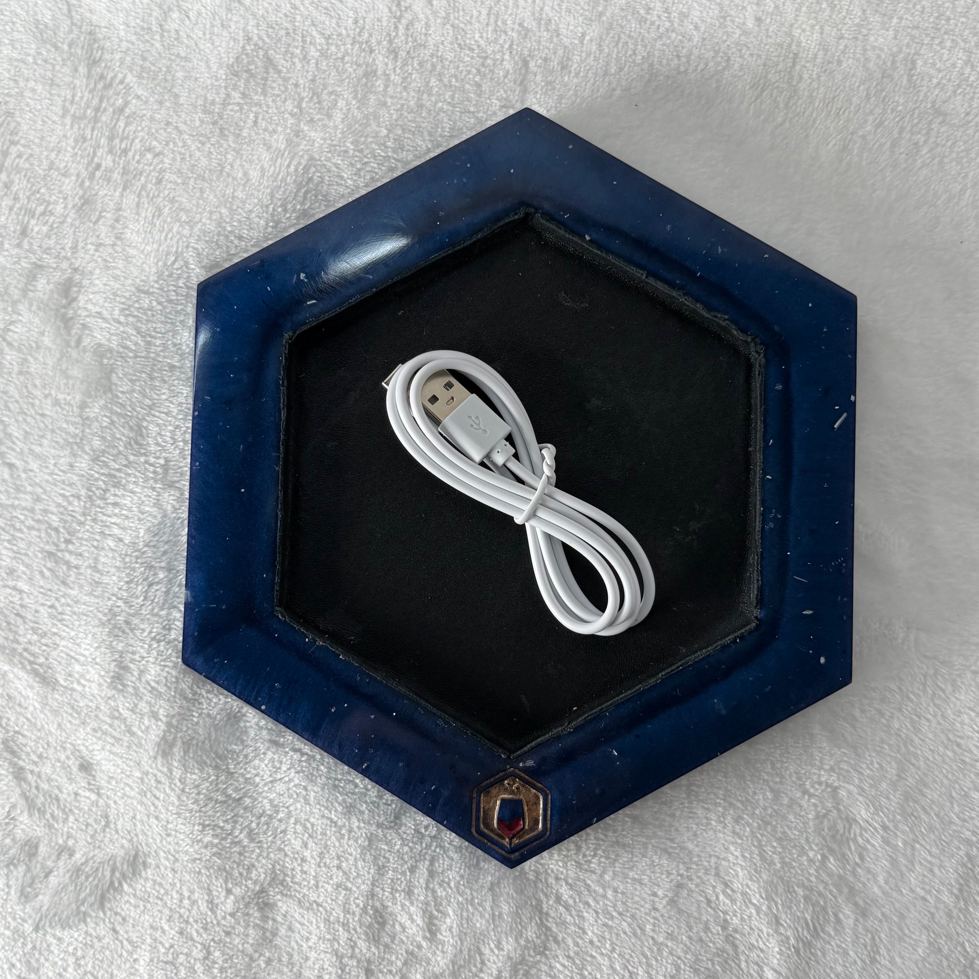 The powered dice tray continues the 'night under the big top' feel. Small flecks of silver glimmer in the midnight blue tray, and the (upcycled) black leather lining hints at something just a little wild.