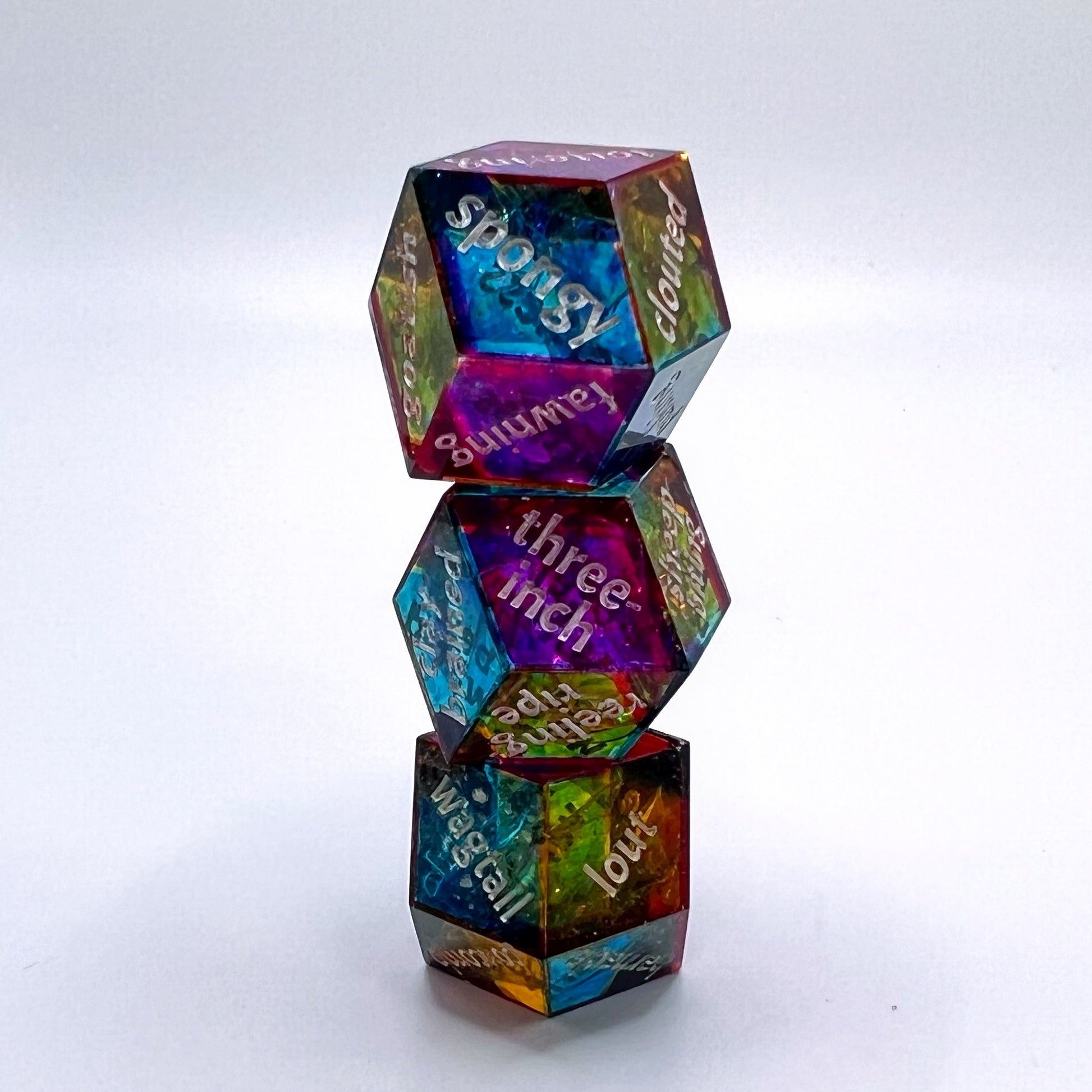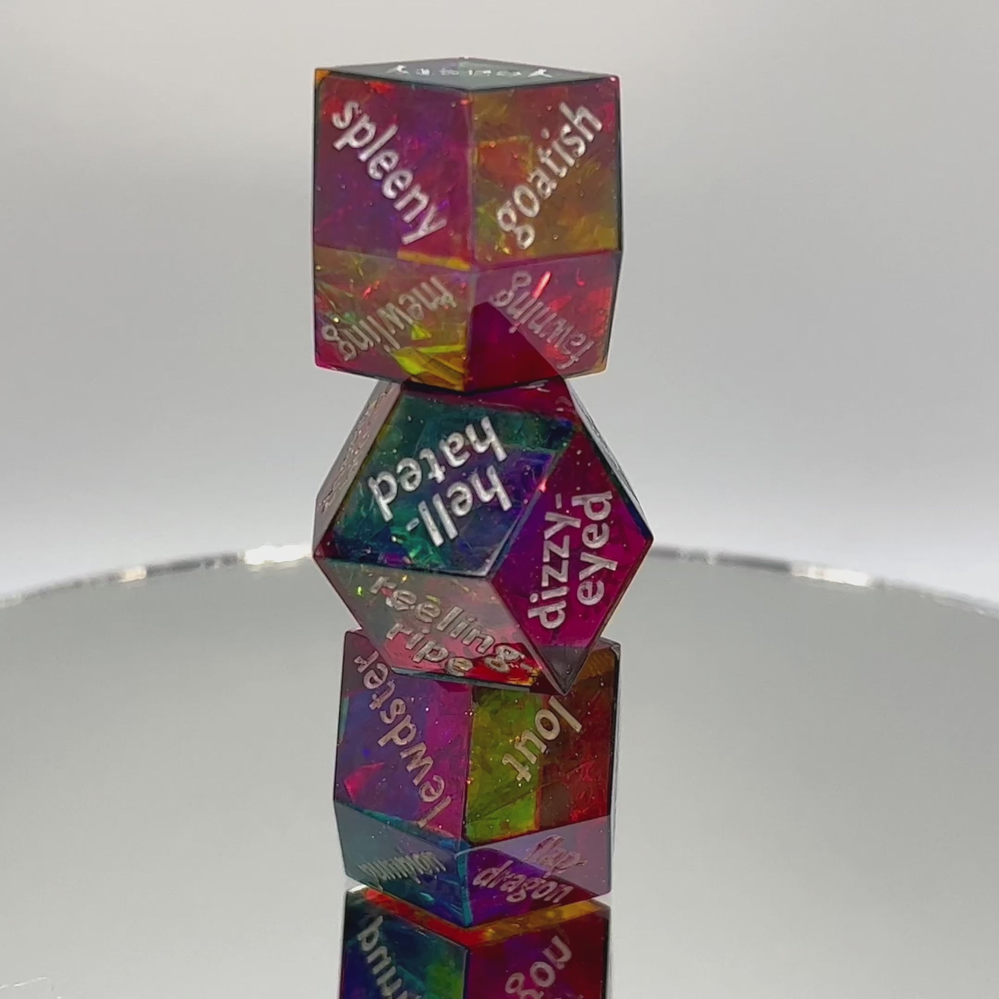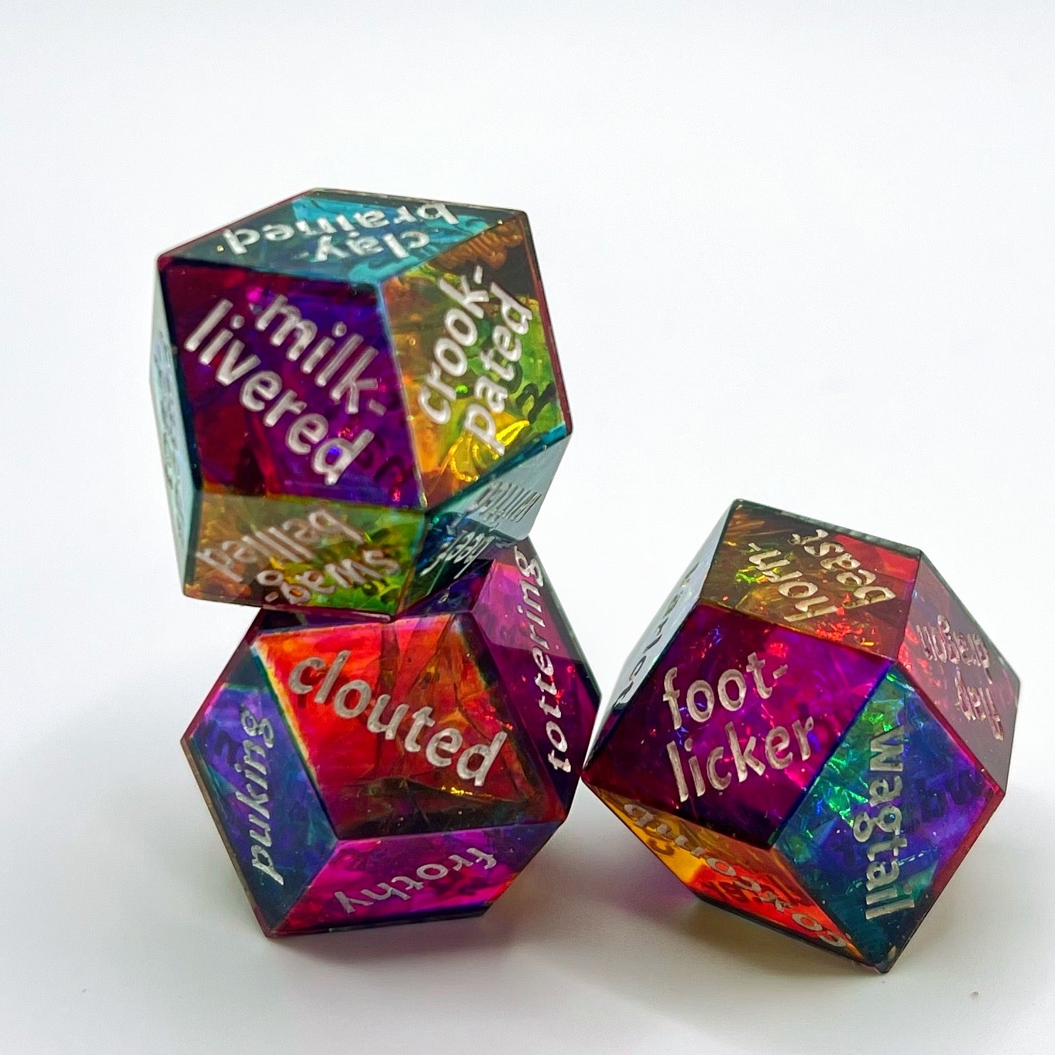 - This set consists of three over-sized (25mm) rhombic d12s. Two of the dice offer adjectives, and the third, nouns, so that when you read them in the right order, you have a fully-formed insult.