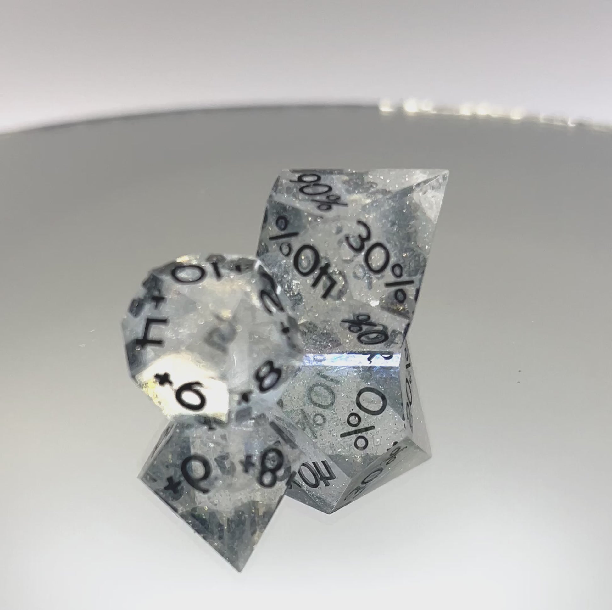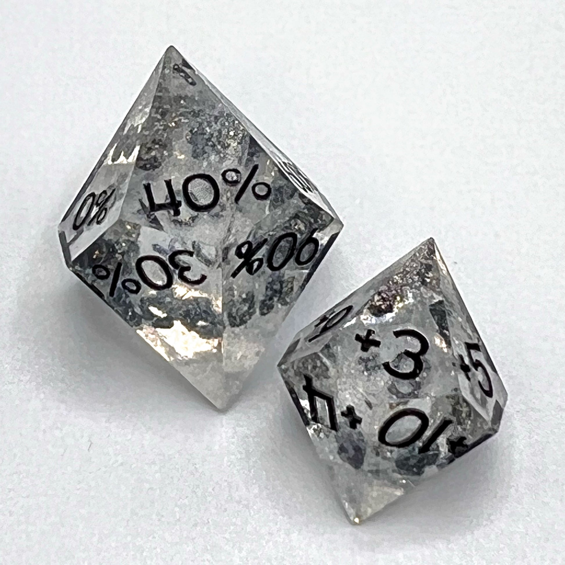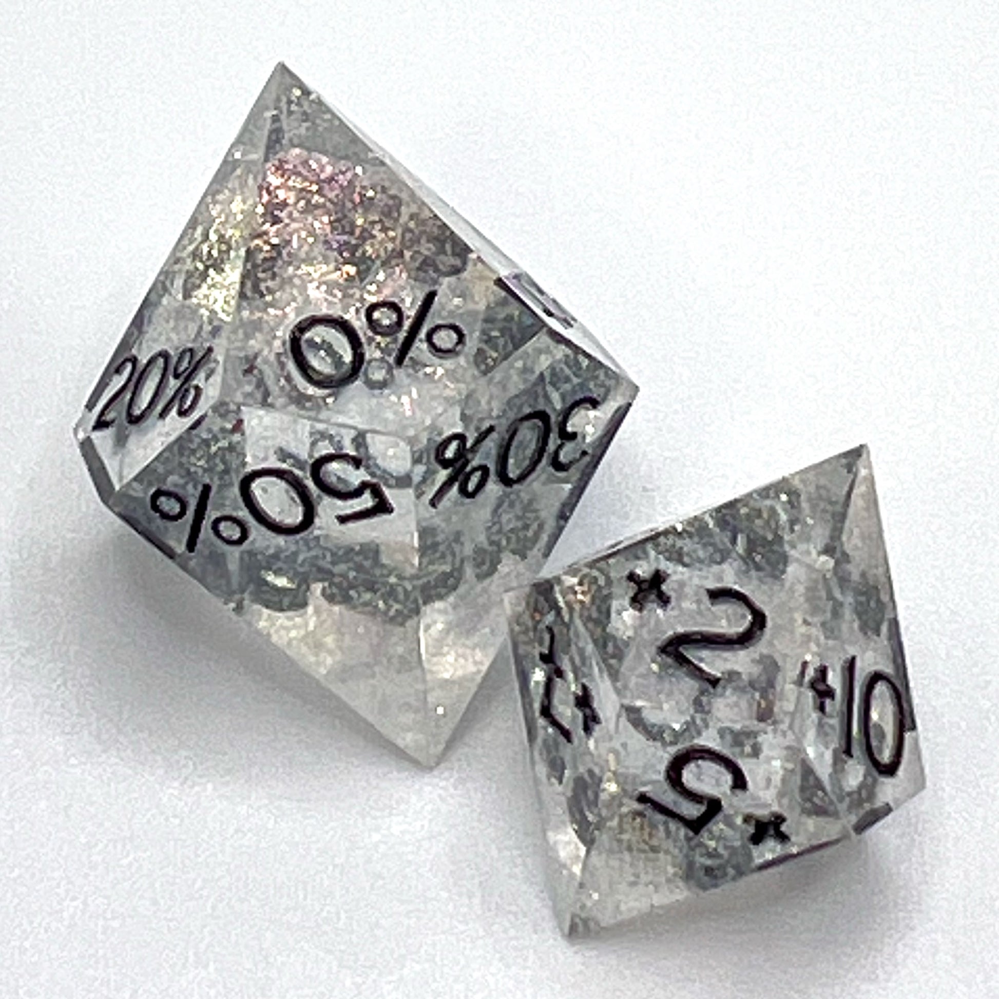 Rosy Nebula combines cosmic elegance with clear-cut rolling. With each turn, watch the dance of pink and gold flecks in clear resin, like stars twinkling in a dusk sky, while the black inked numbers stand out for easy reading. Perfect for players who love a blend of elegance and efficiency in their gameplay.