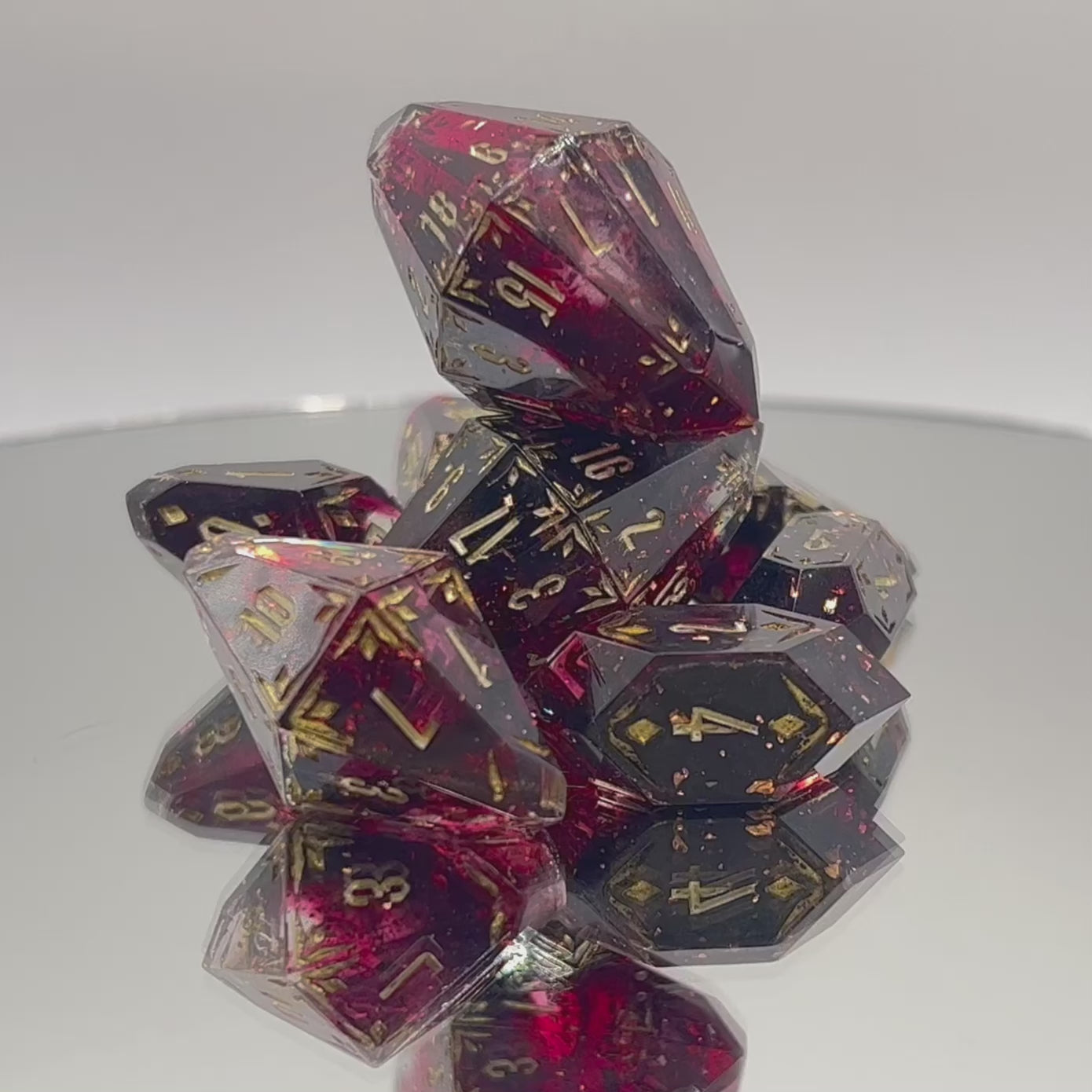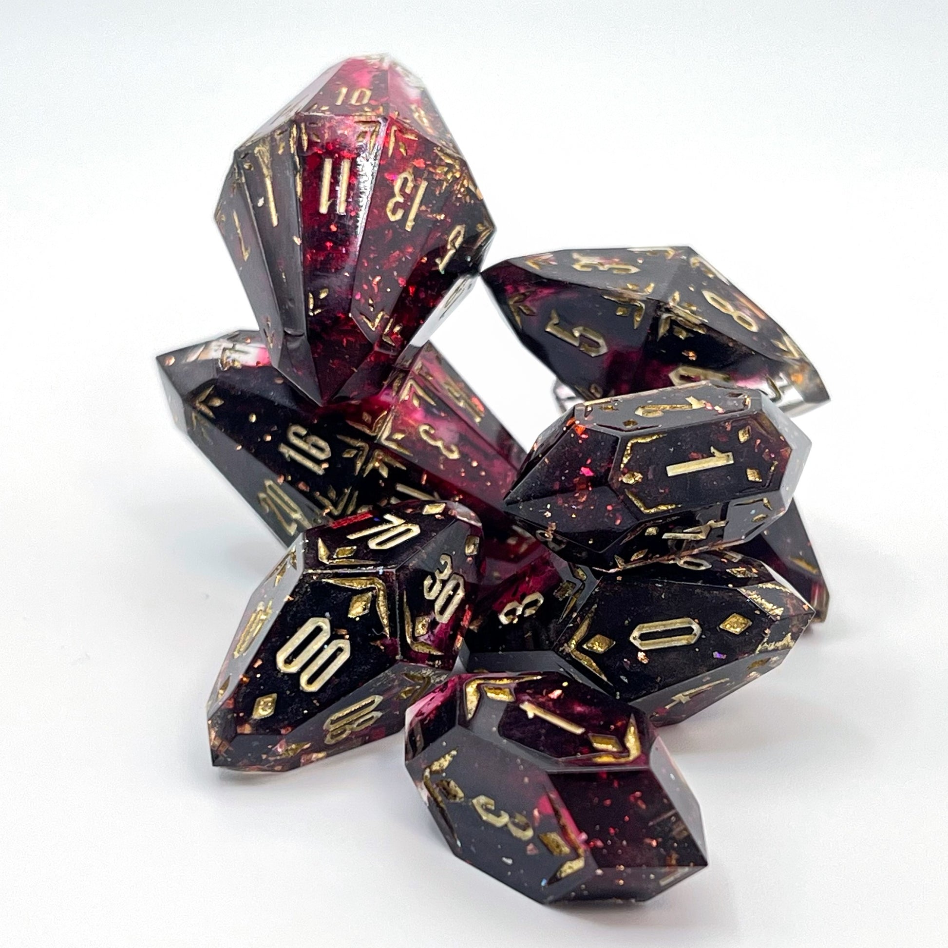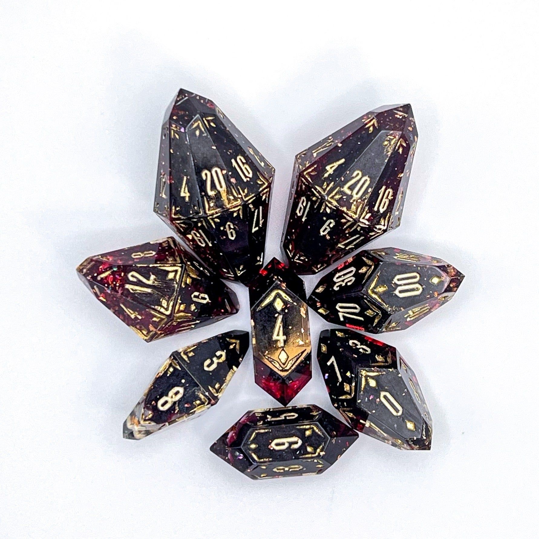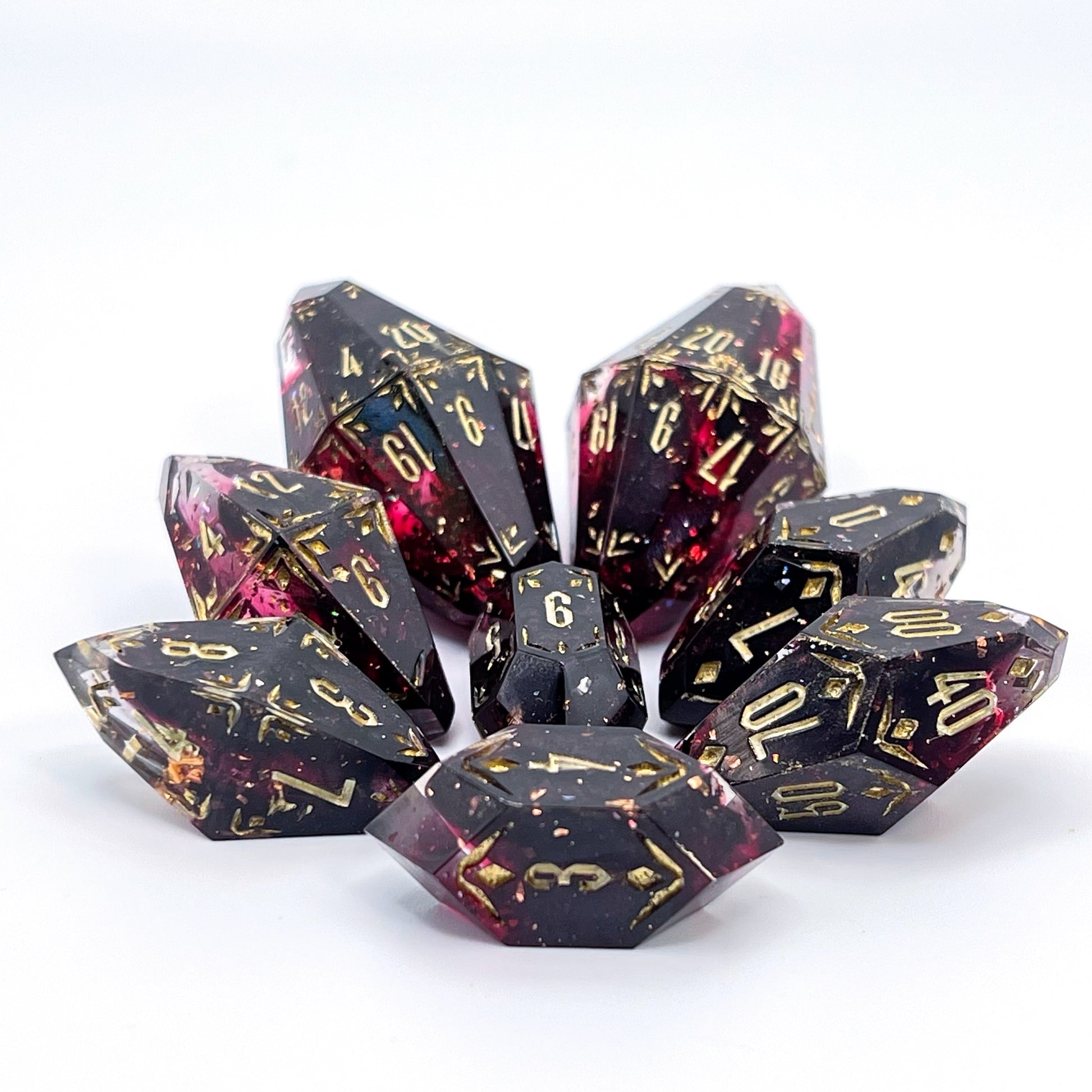 For the character (or player!) who craves refined luxury, these dice deliver! Translucent red hues harmonize with suspended golden flakes, evoking a melodic masterpiece. The intricate gold filigree and multifaceted design compose an enchanting song of elegance with every roll.
