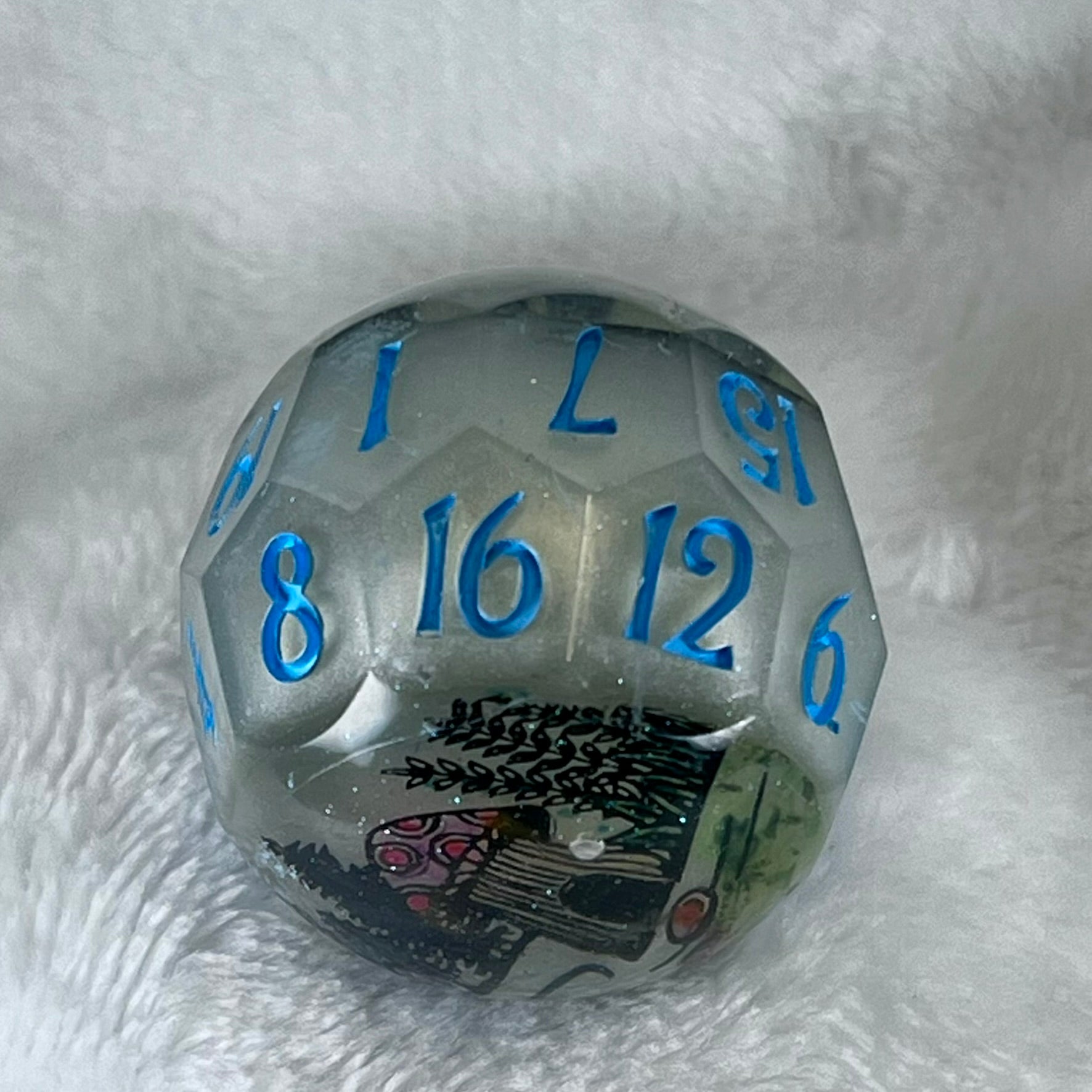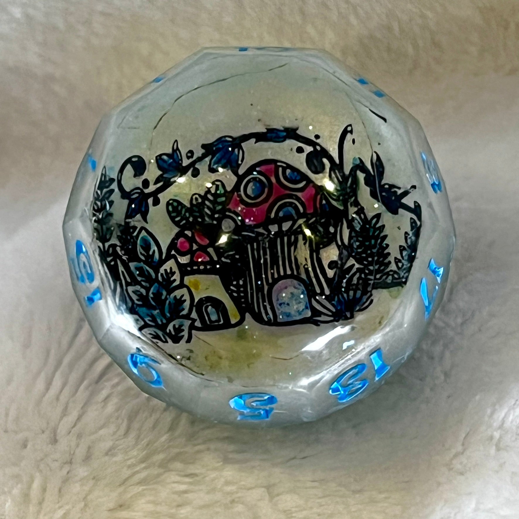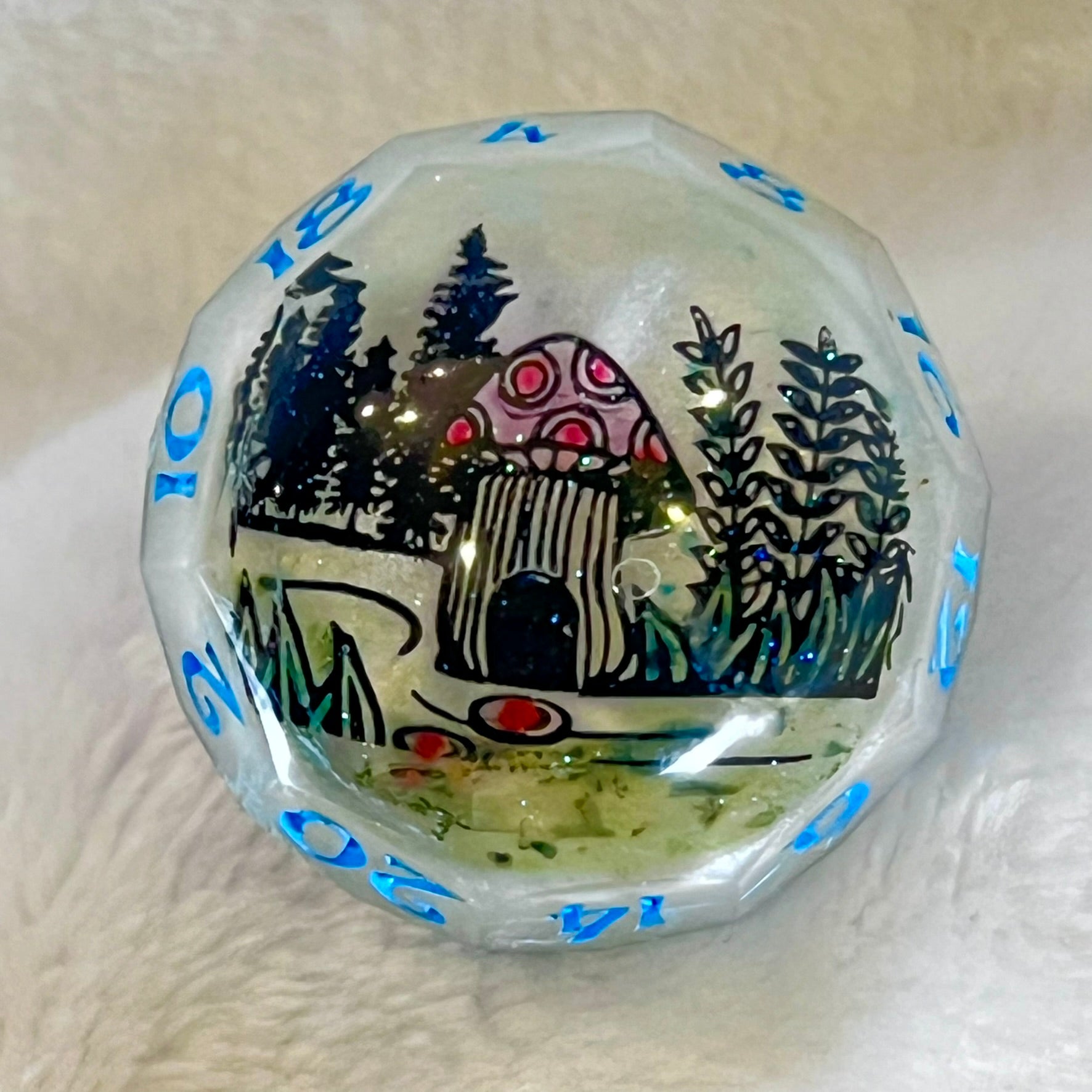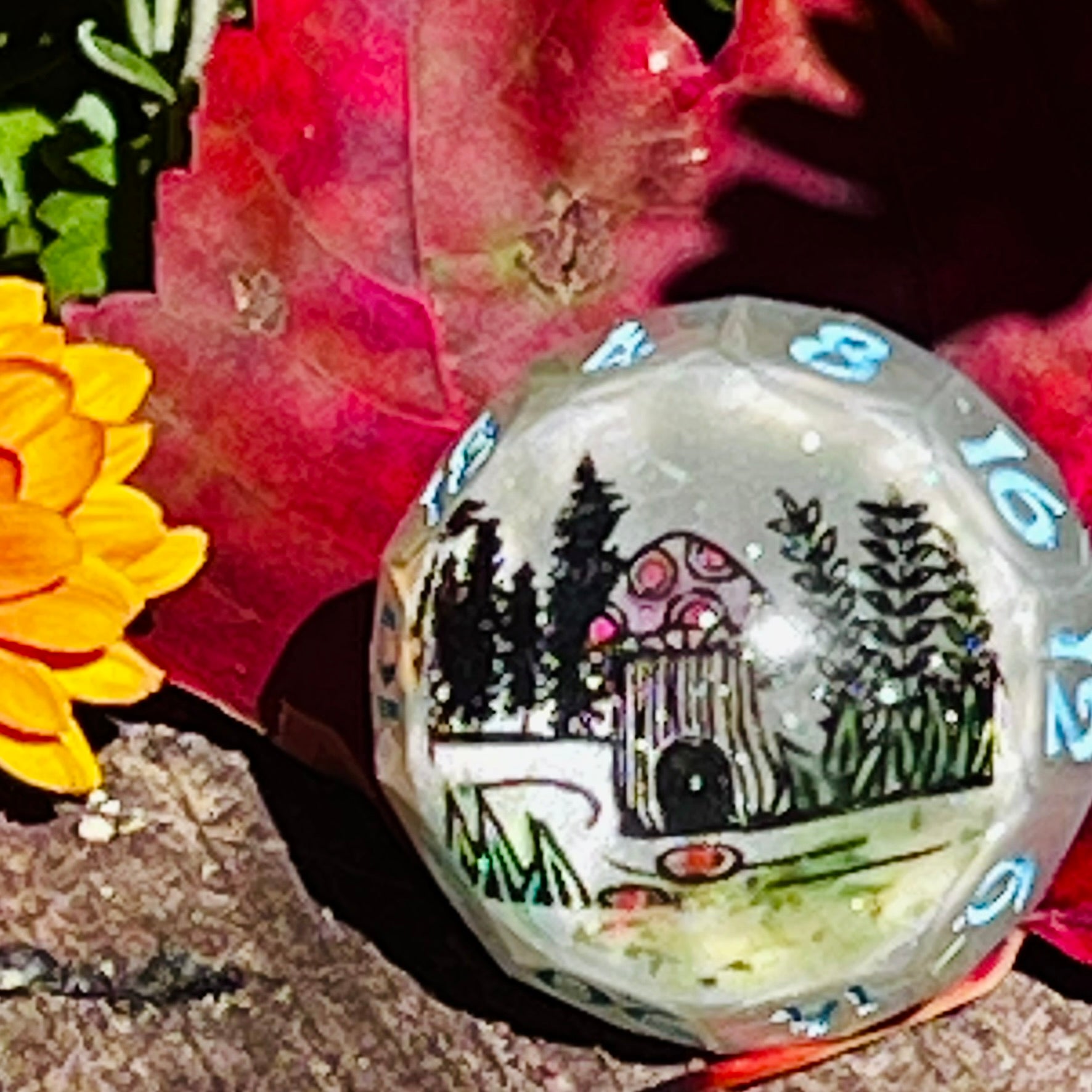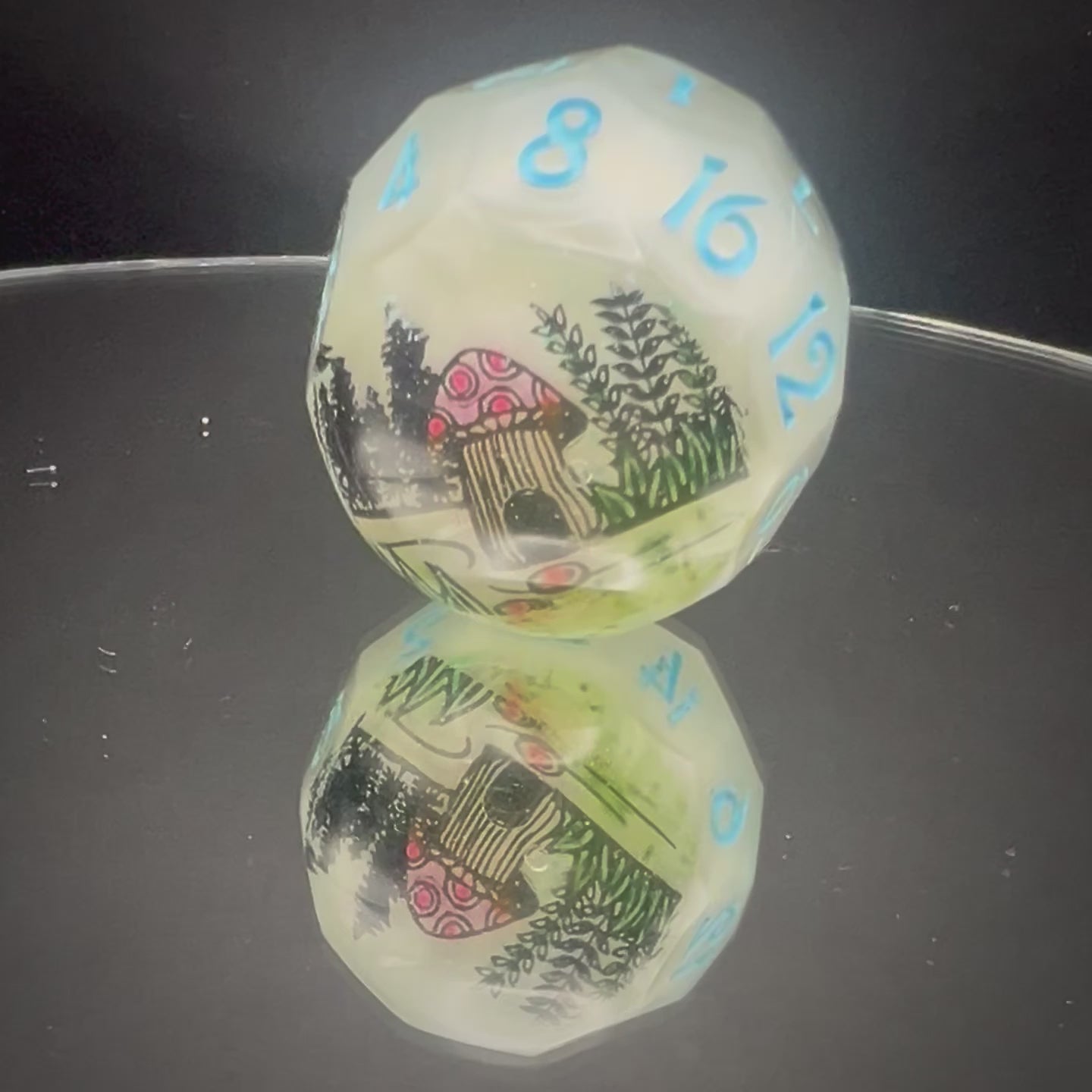 Step into the enchanted woods where fairy houses peek out from under the trees. This jumbo orb die features hand-tinted fairy homes on either side, each one a tiny masterpiece of woodland charm. If you look closely, you might even catch a glimpse of a fairy heading home after a long day at the... forest office? Whether you're rolling for a bit of magic or just enjoying the intricate designs, this die is sure to bring a touch of whimsy to your collection.