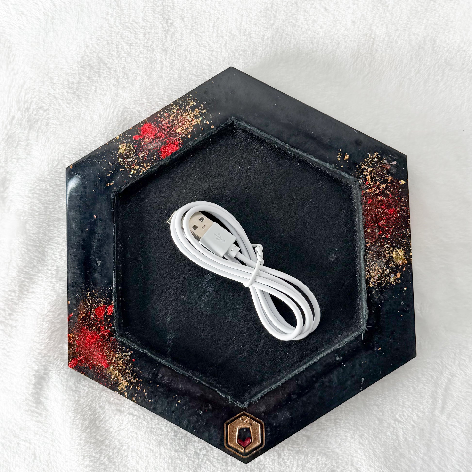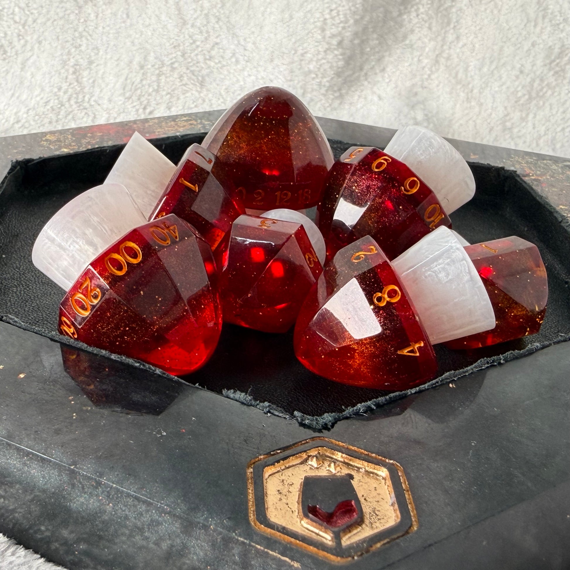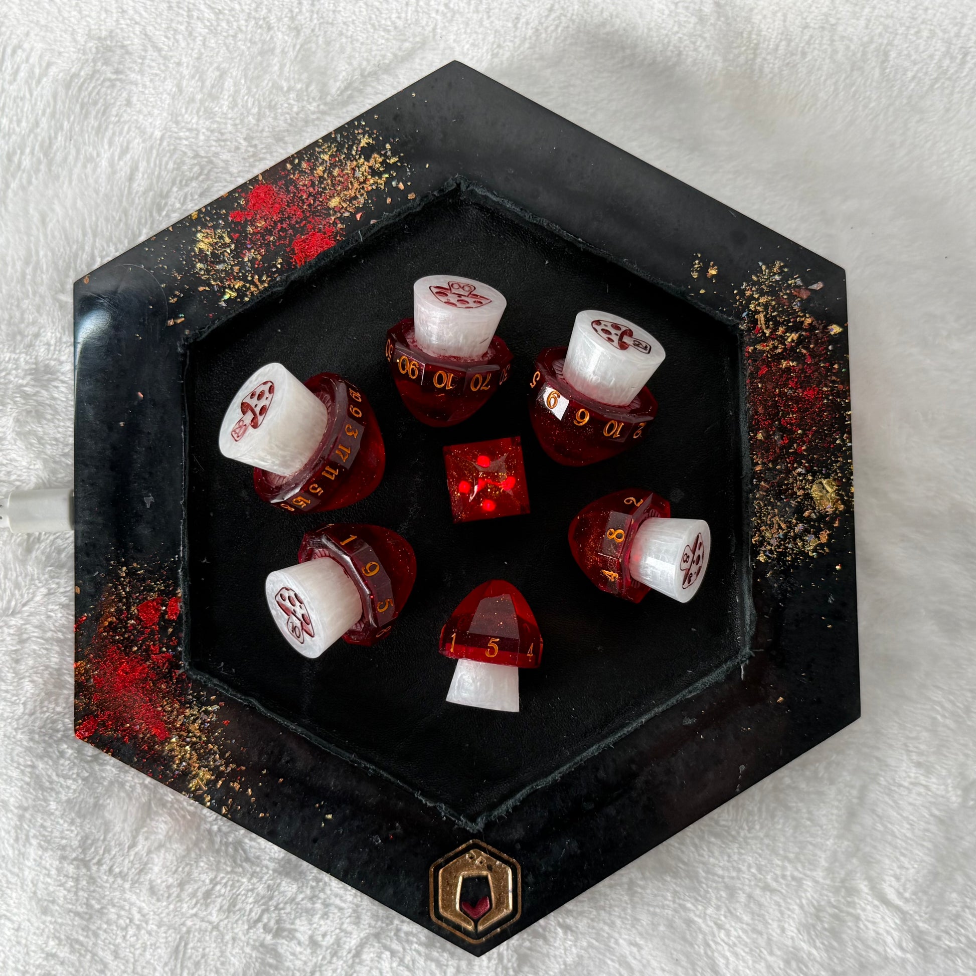 The powered dice tray brings the fire theme home with a black base scattered with red and gold sparkle, like embers caught in ash. With the black (upcycled) leather lining, it lets the warm glow of the mushrooms show without overpowering them.