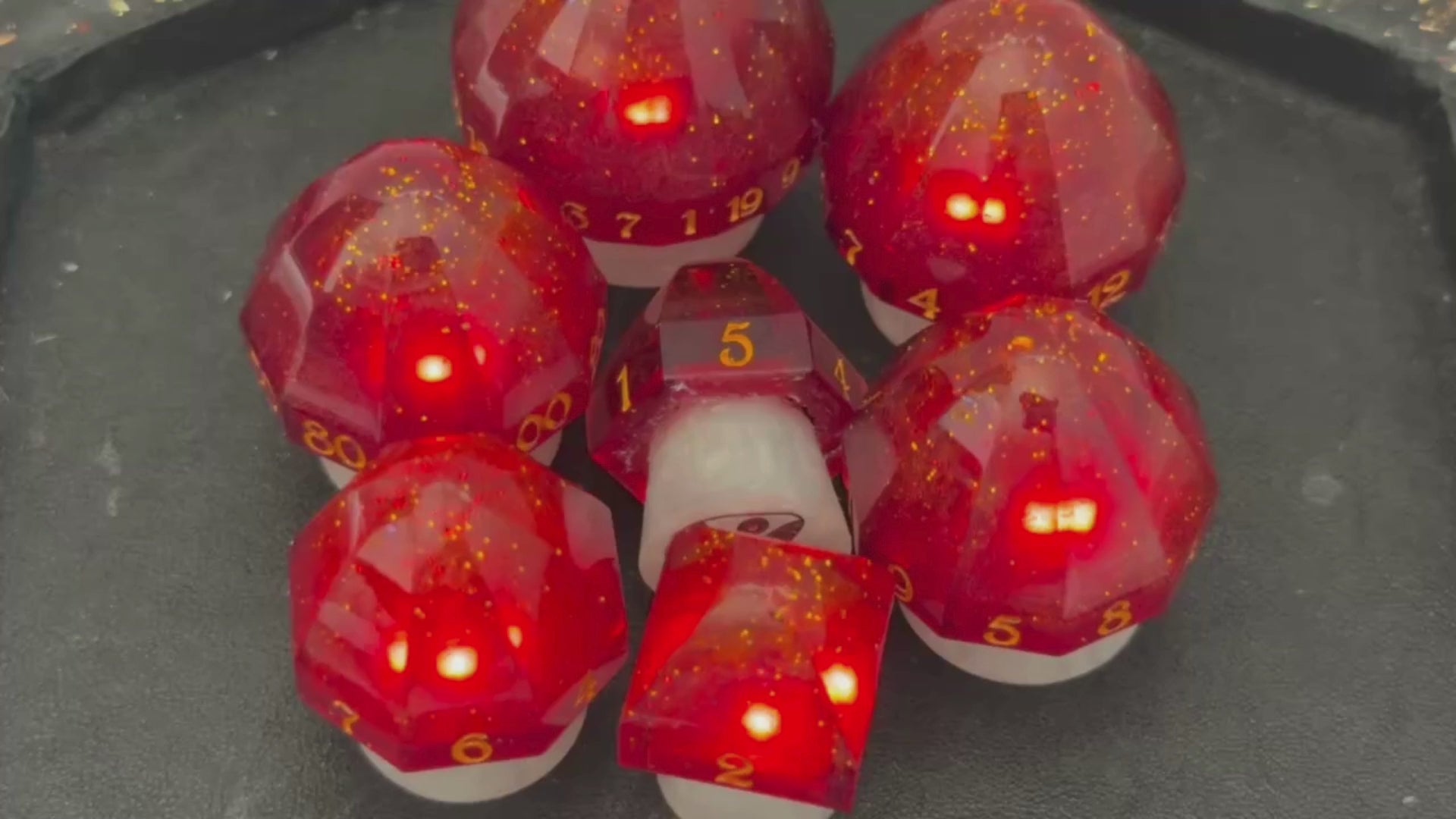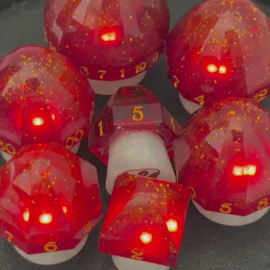 These mushroom-shaped LIT dice glow with a soft ember light when they roll across the powered tray. The red, orange, and gold caps warm up from within, giving each piece the gentle look of a coal that’s just beginning to spark. They’re bright enough to catch the eye without overwhelming it, and they keep their charm even once they settle on the table.