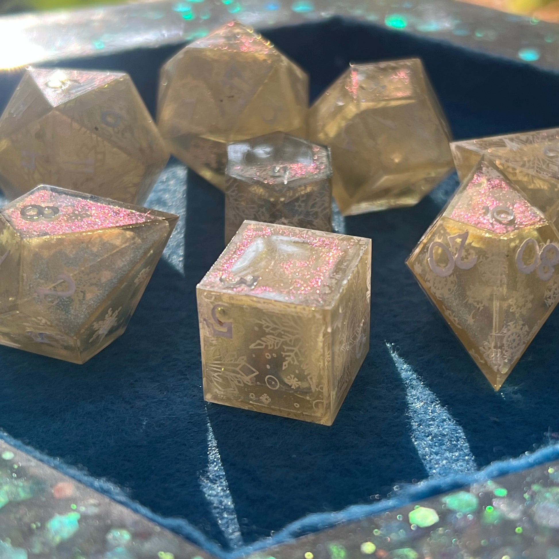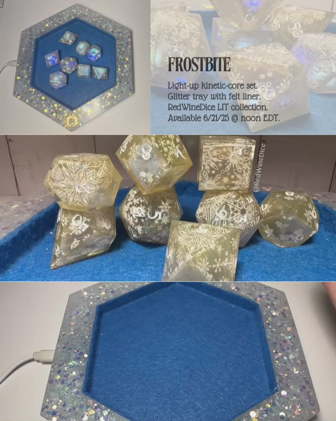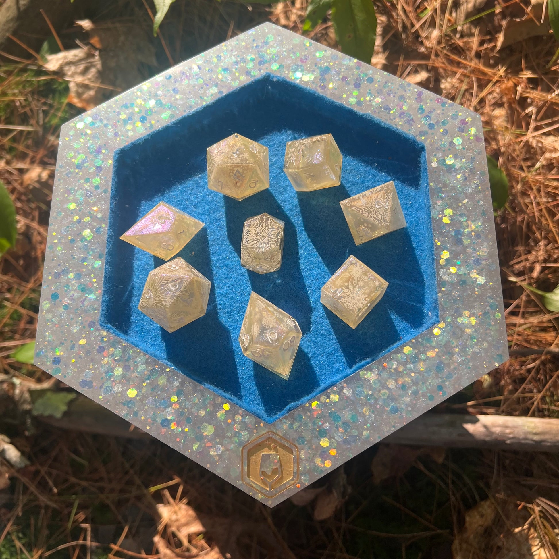 This kinetic-core set glows in frosty shades of blue and white, lighting up with every roll like a snap of ice magic. Snowflakes cover each die, but don’t let their delicateness fool you—the name Frostbite is not just for show. The glitter-trimmed tray reflects the light like sun on a crust of ice, adding one more layer of shimmer to every roll.