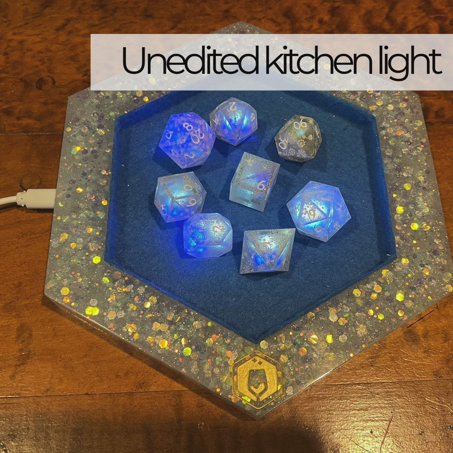 - The dice contain tiny wireless LEDs that light up when they pass near the powered dice tray. Lighting depends on alignment—so while they don’t glow every time, most rolls produce at least a flicker.