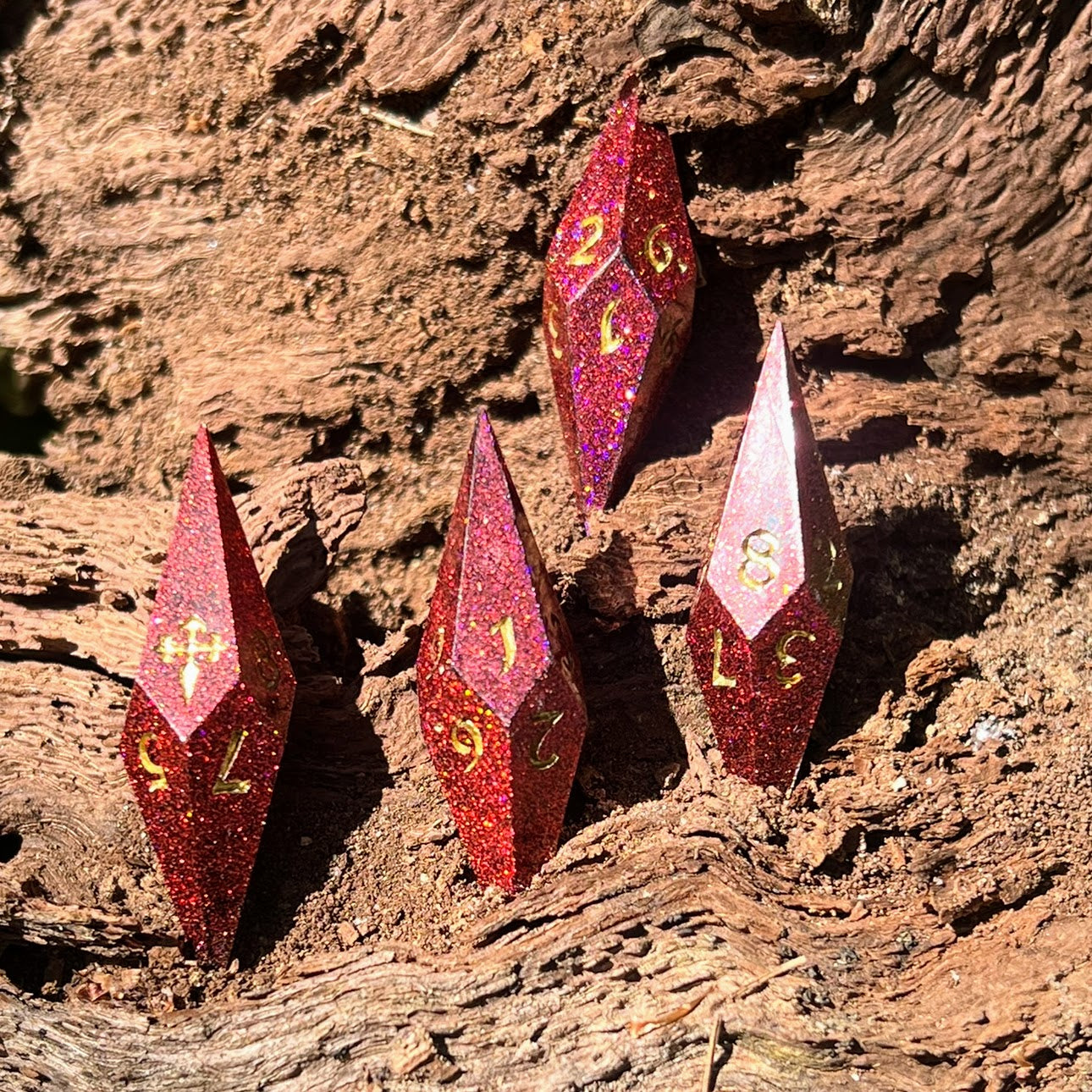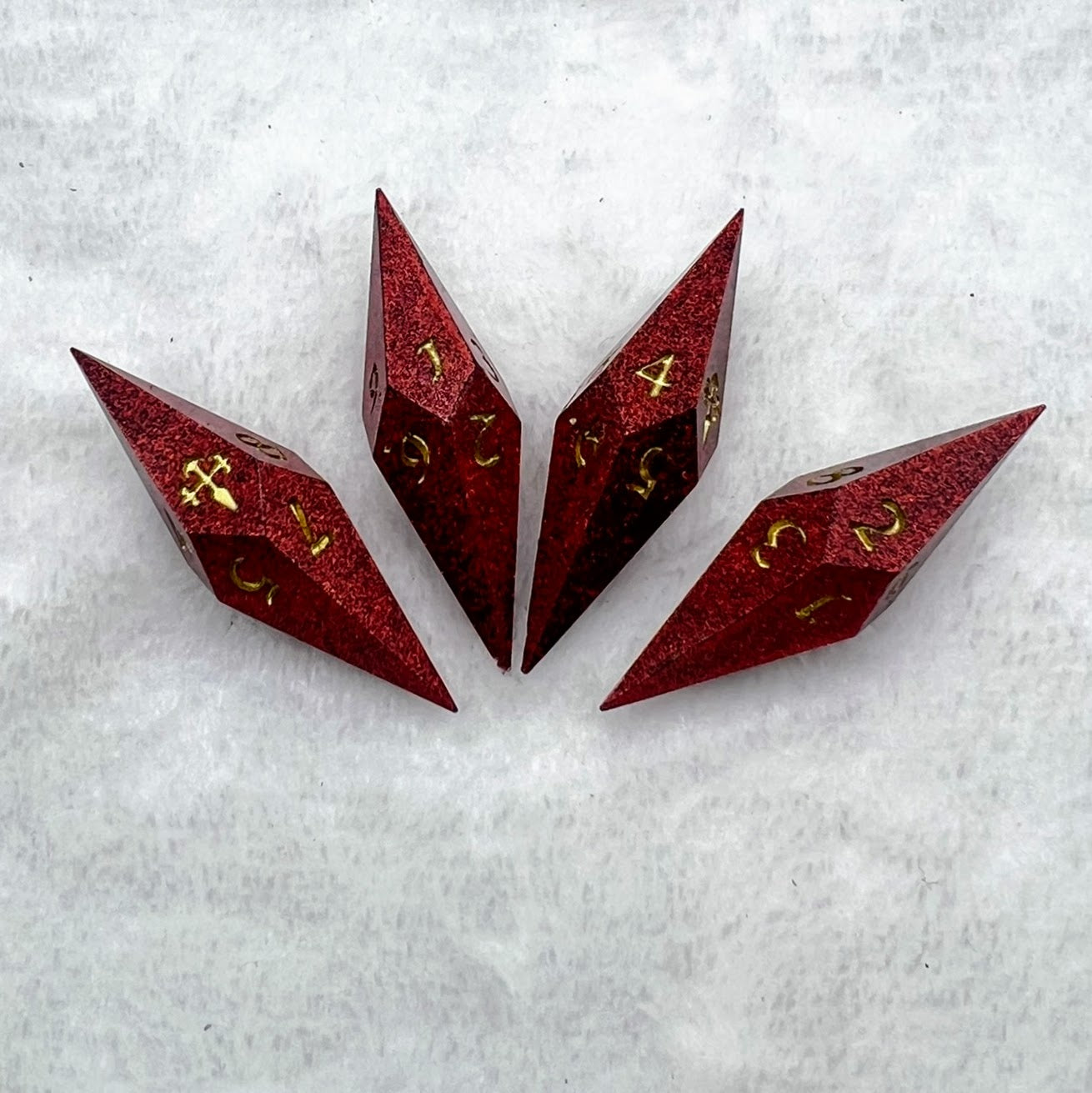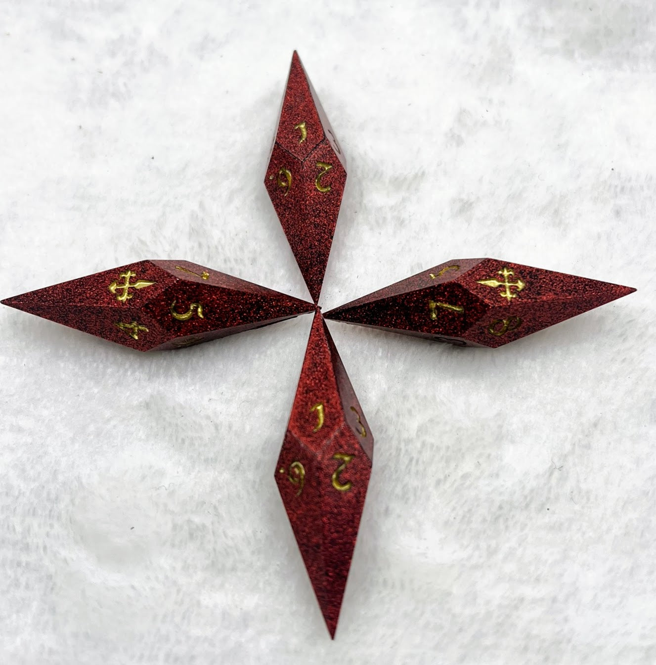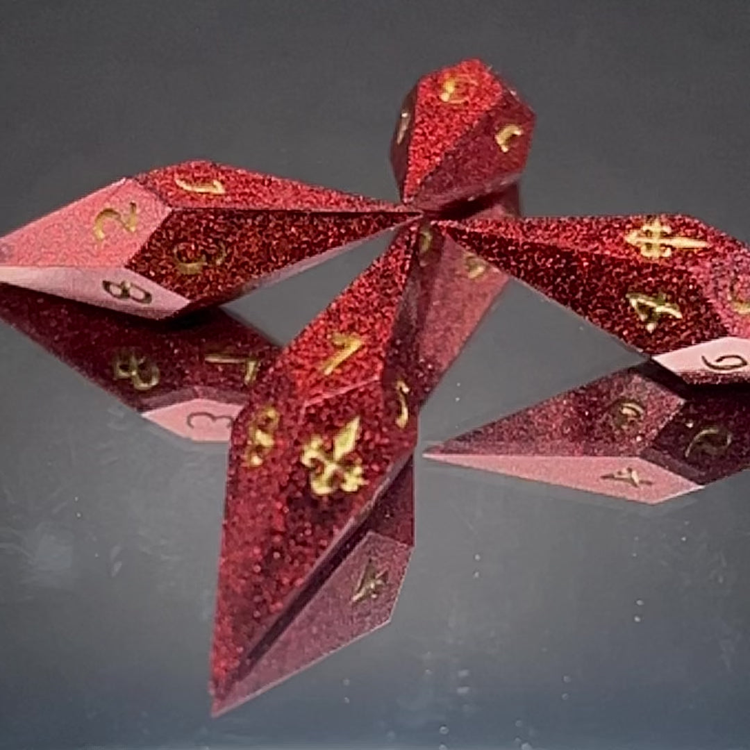 Sharp, shimmering, and steeped in drama, this fang-style d10 set gleams with red glitter and gold ink. Perfect for Vampire the Masquerade or any system that runs on d10s, they’re easy to read, easy to spot, and impossible to ignore.