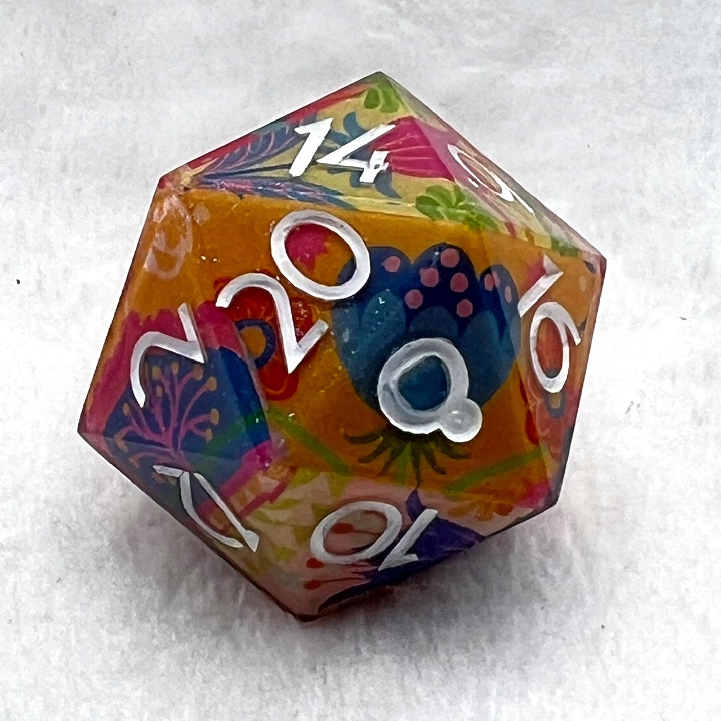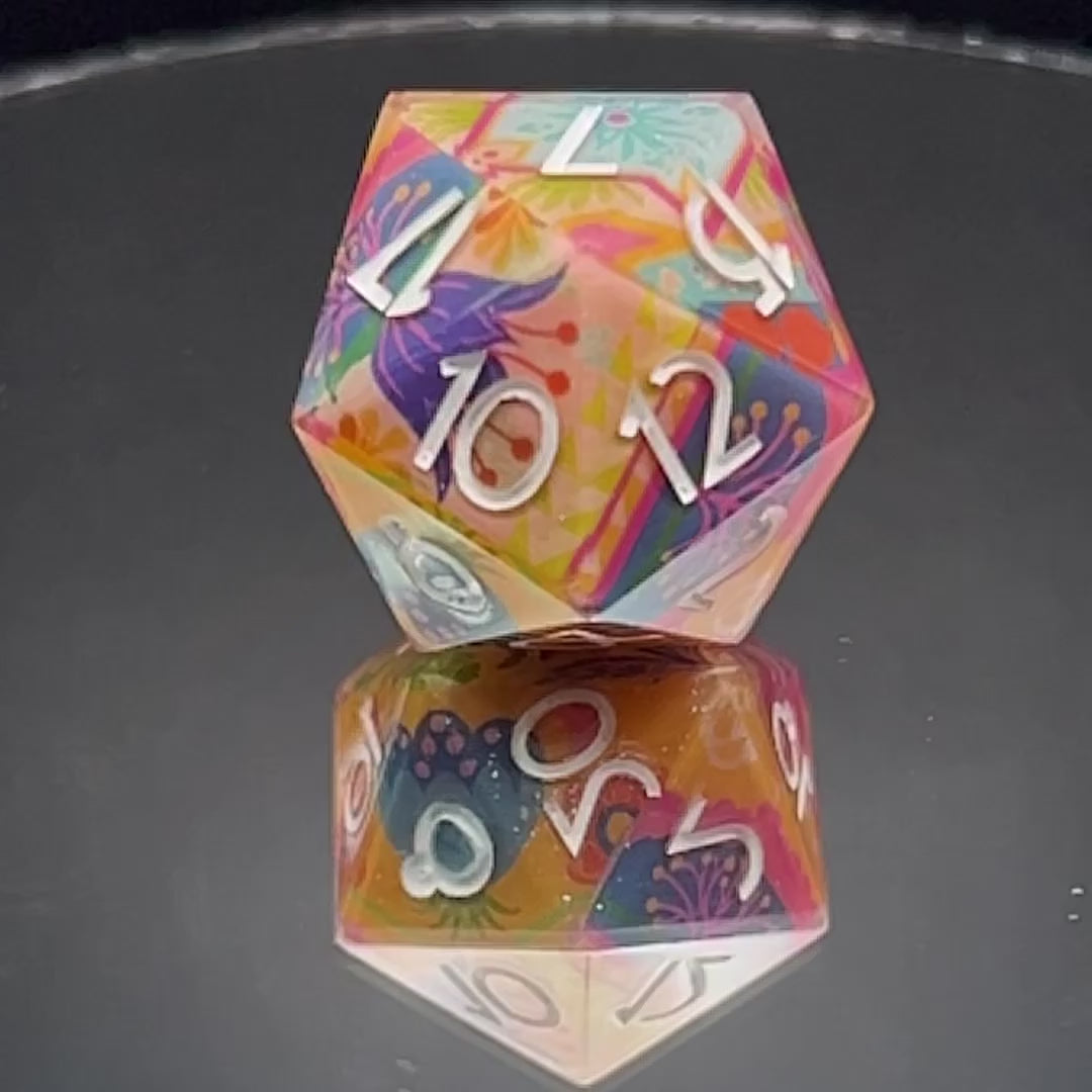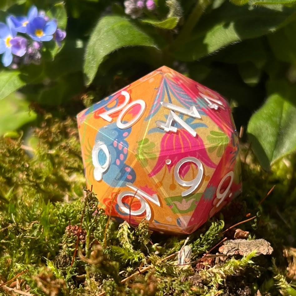Wrapped in Quilted washi by Anoosha Syed / @foxville_art, this d20, inspired by vintage quilt squares, is warm, bold, and just a little bit cozy. Whether you’re crafting spells or cross-stitches, it’s proof that comfort and chaos can share a table.