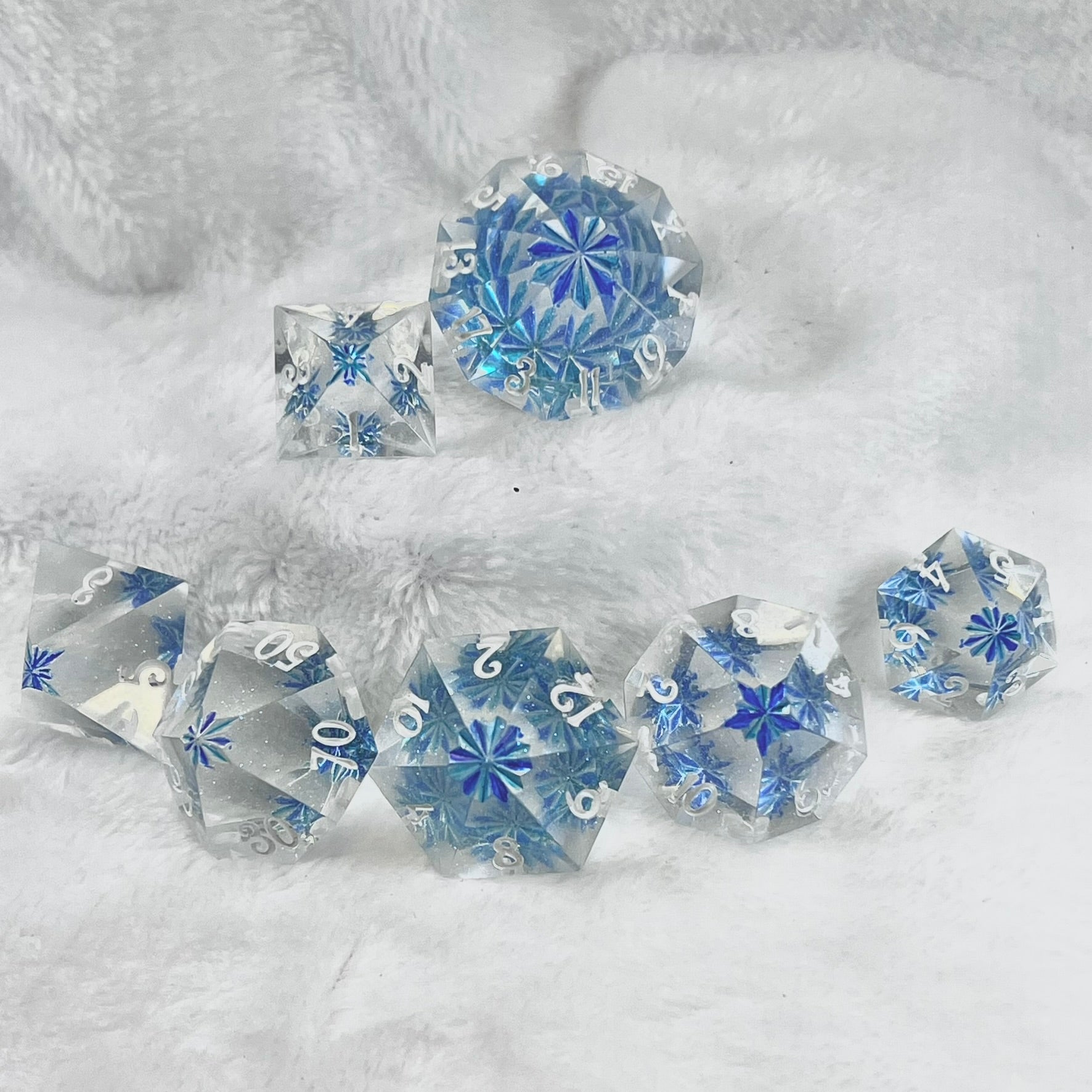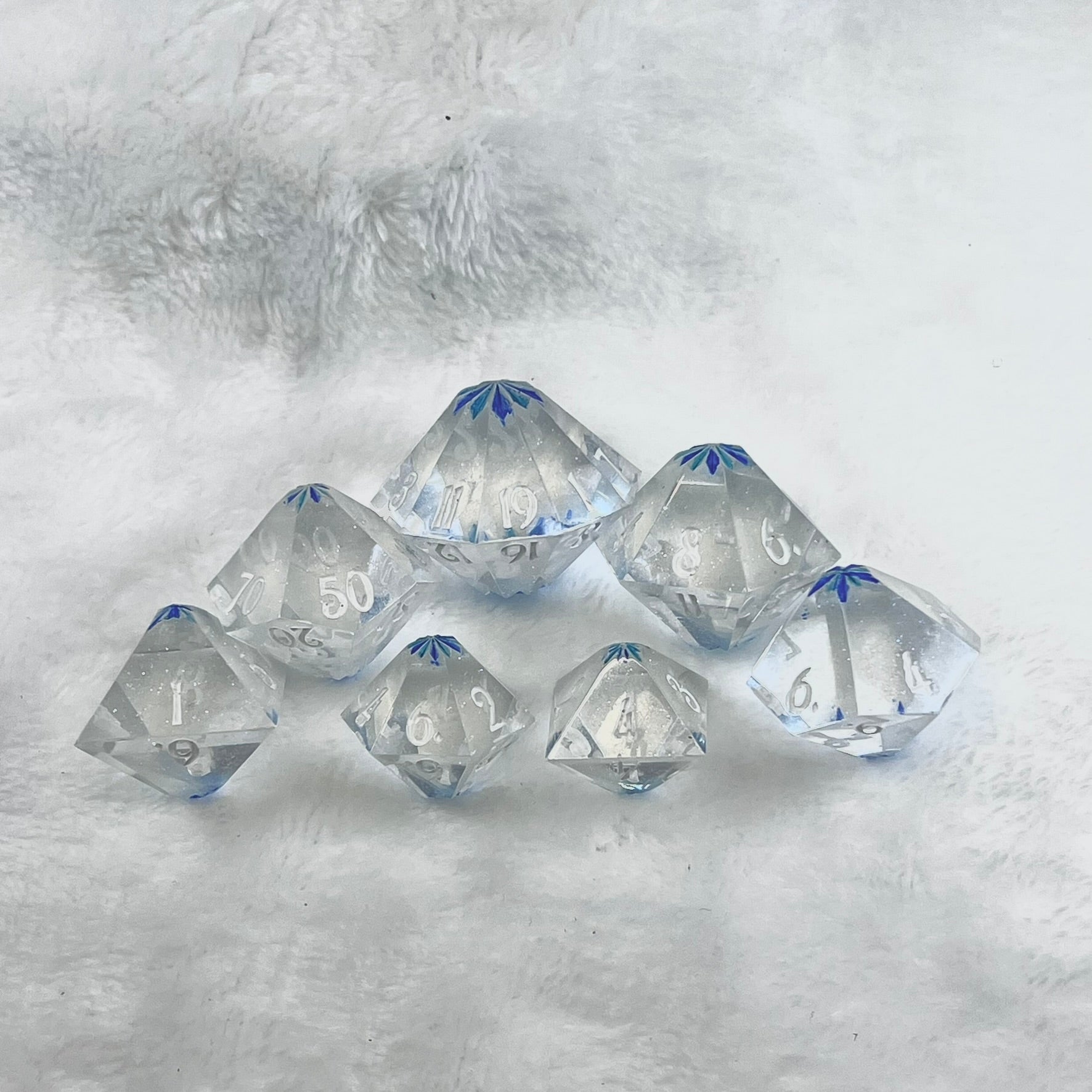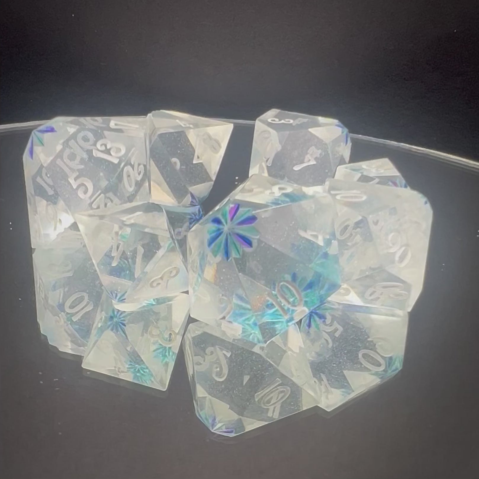 Step into the Hall of Mirrors, where every surface reflects the world back at you in a dazzling array of light. These dice capture that same essence, with clear, glass-like exteriors that reveal intricate patterns of reflection inside. Turn them at just the right angle, and you’ll glimpse the hidden magic within, making every roll an enchanting experience.