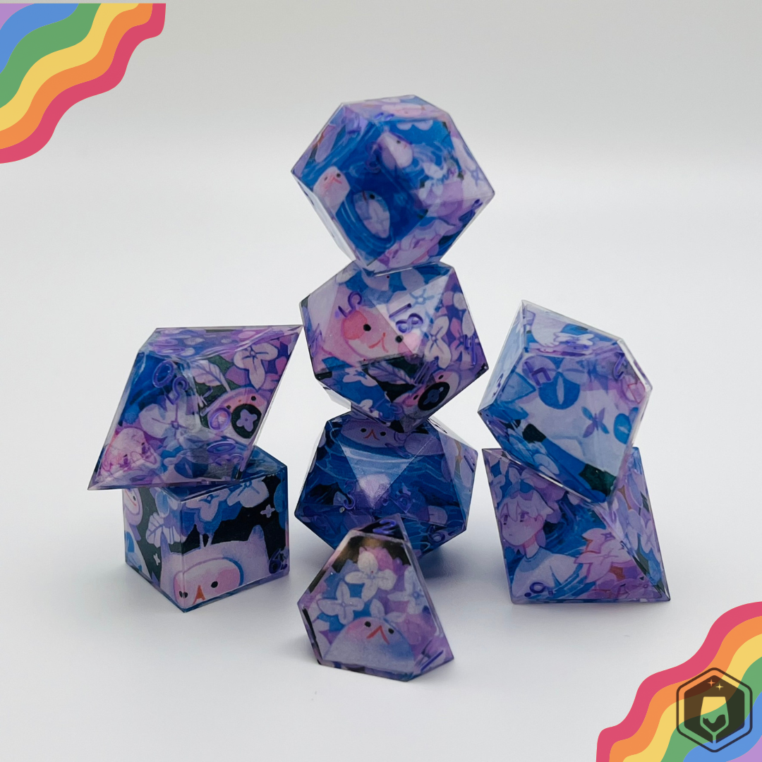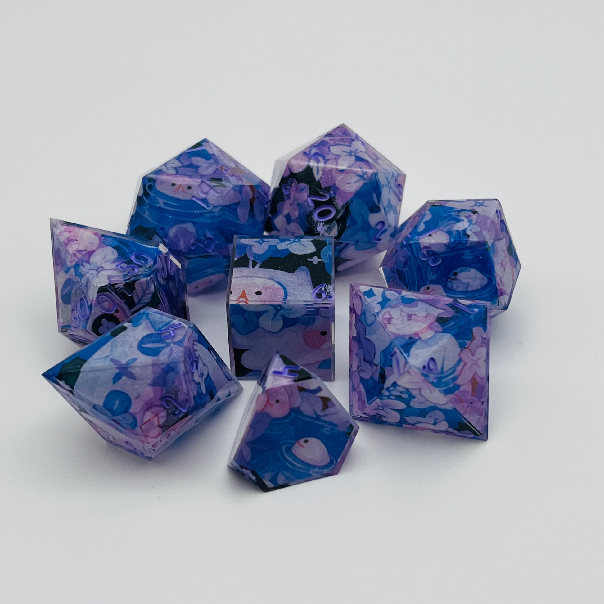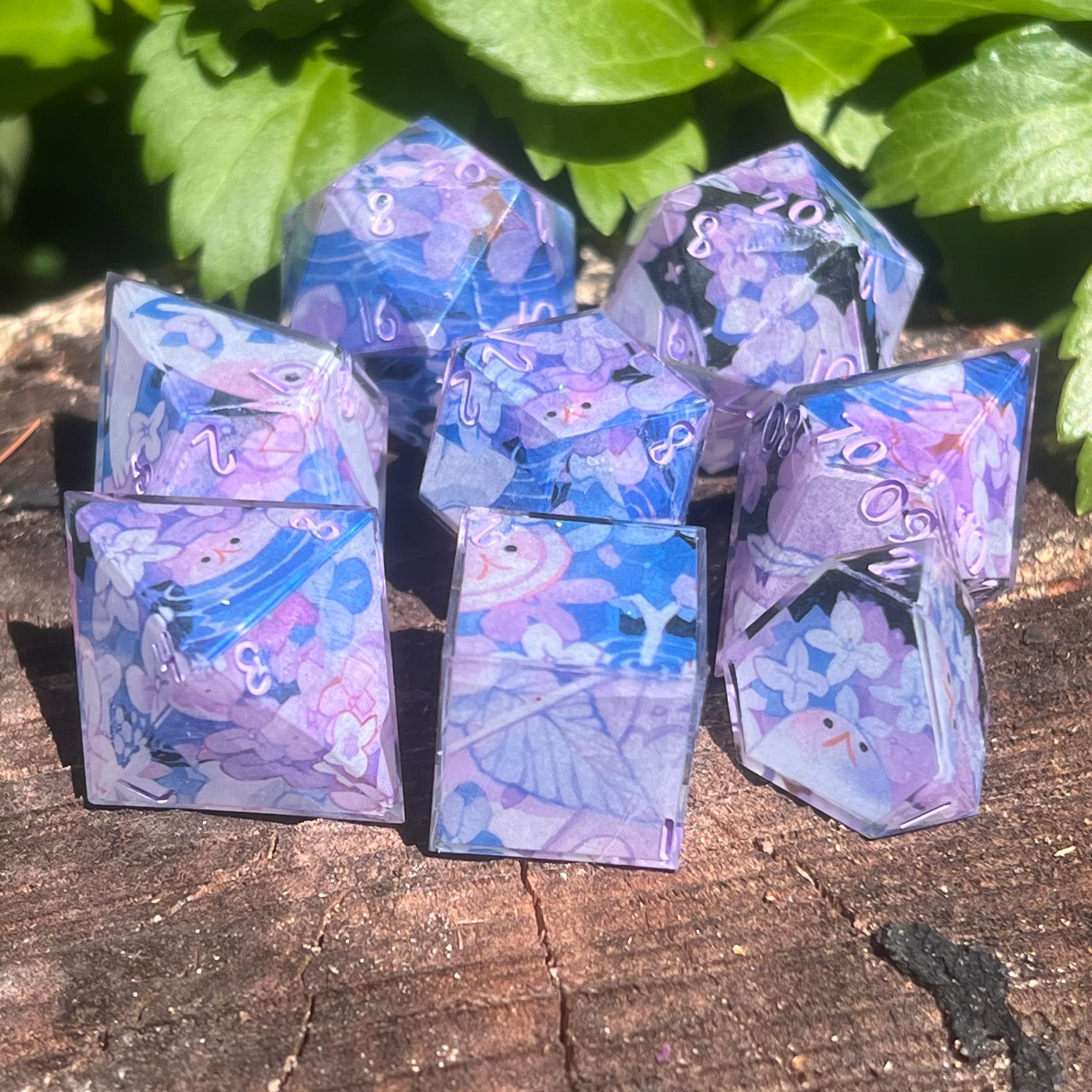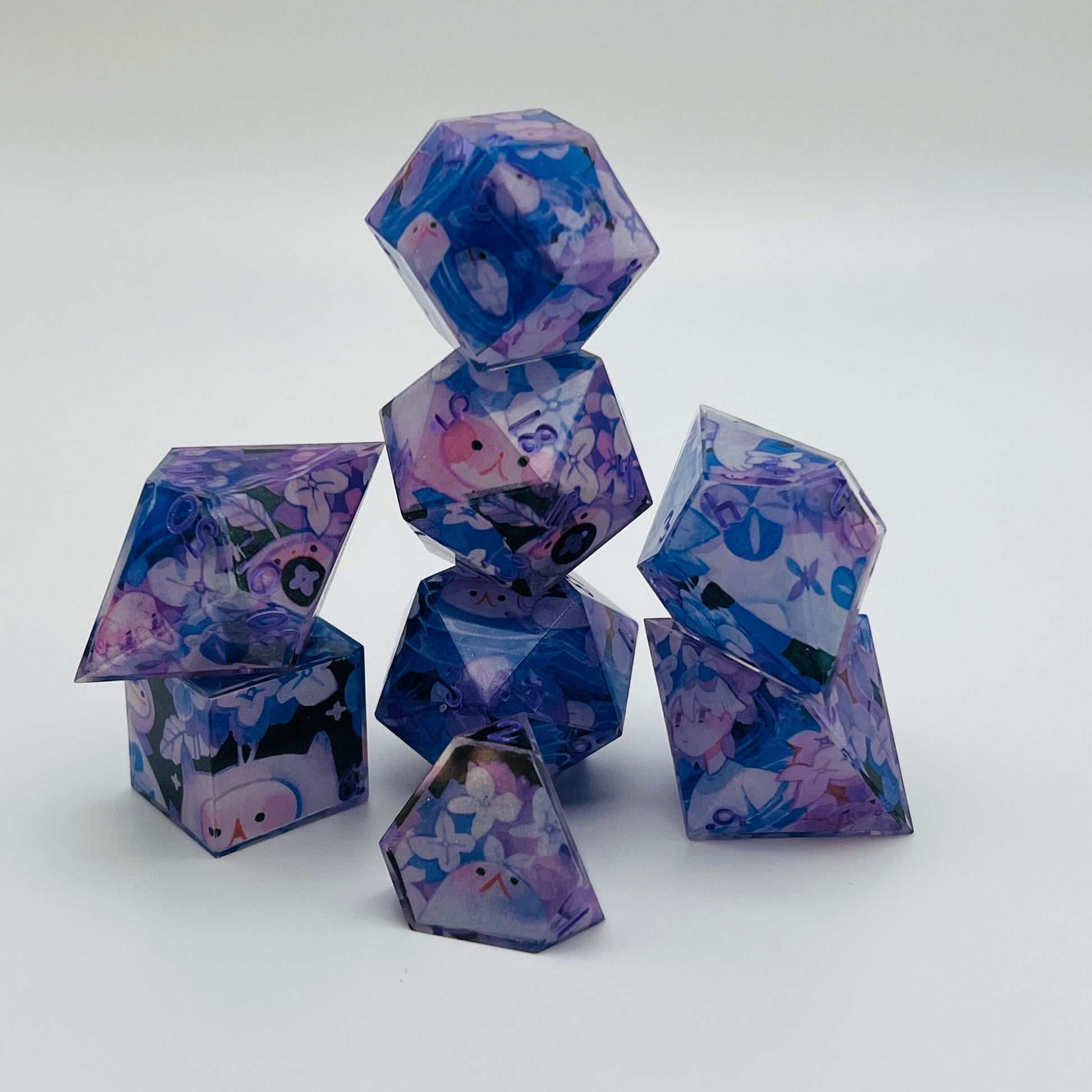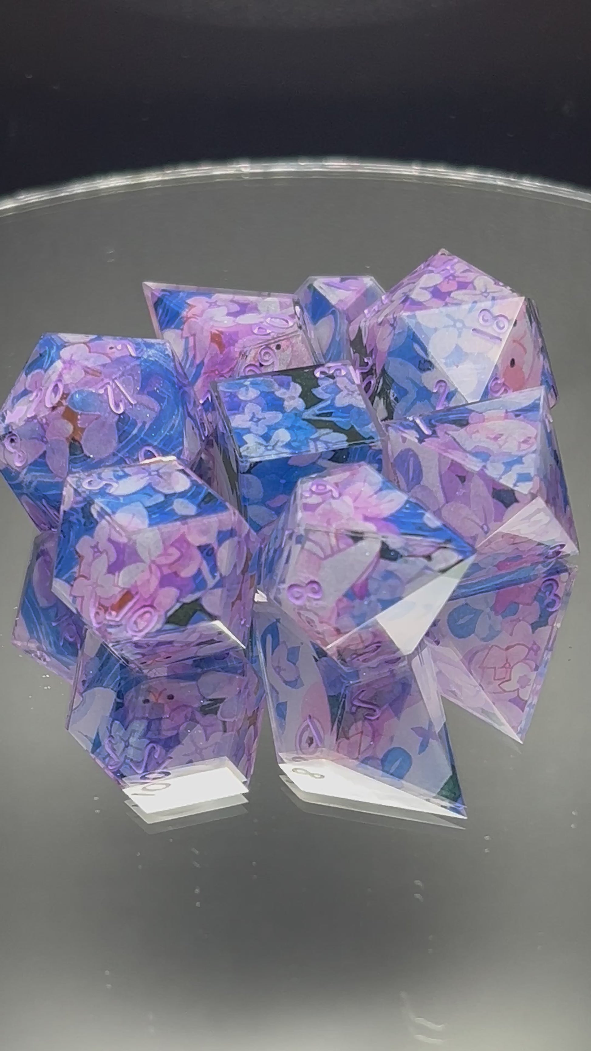 Peek-a-boo! The hydrangea dice are full of surprises with their delicate blue, pink, and purple blooms and tiny faces peeking out. Perfect for those who love a floral twist in their game, or who may be a bit shy about revealing their true self.