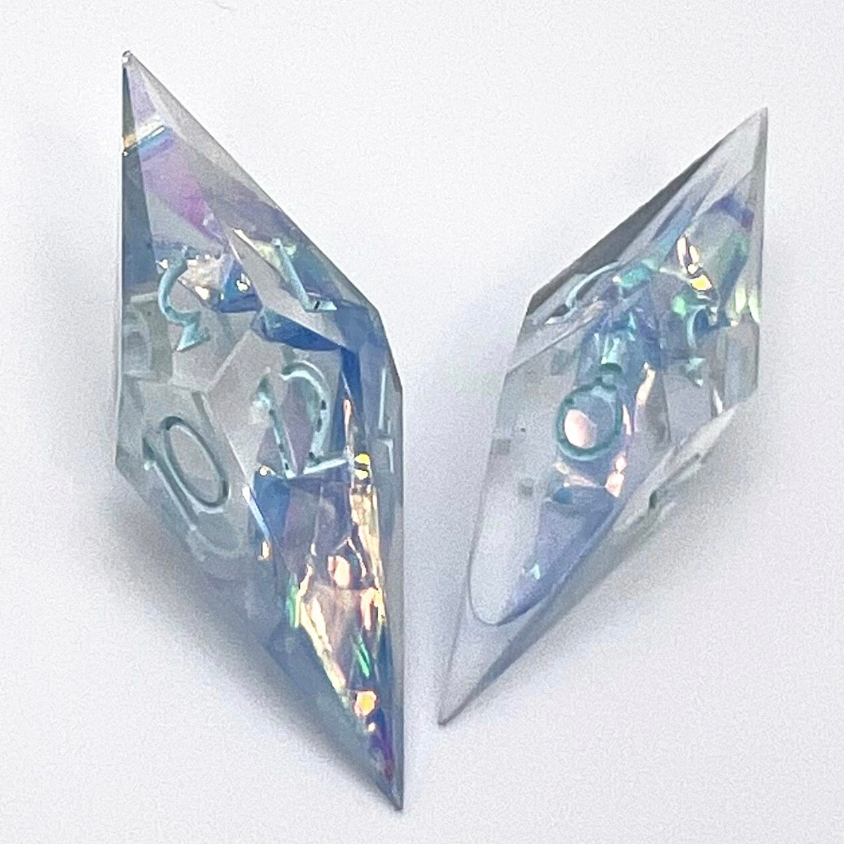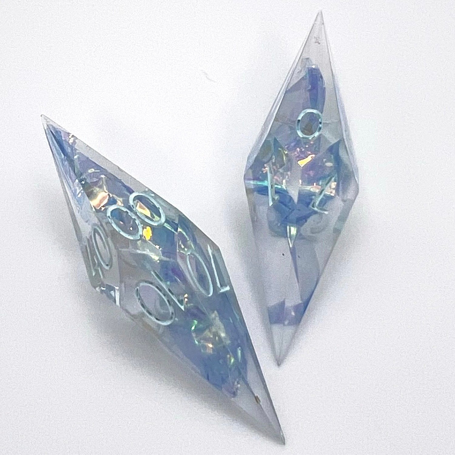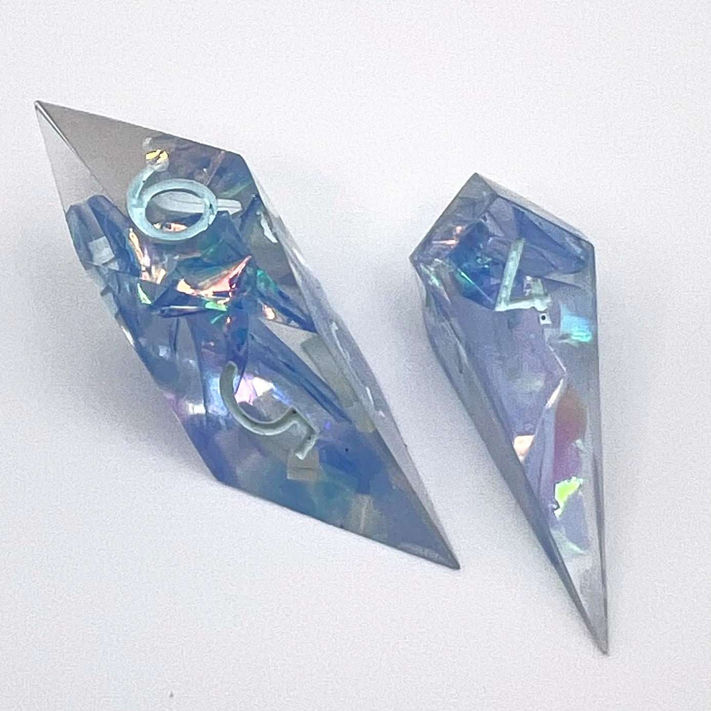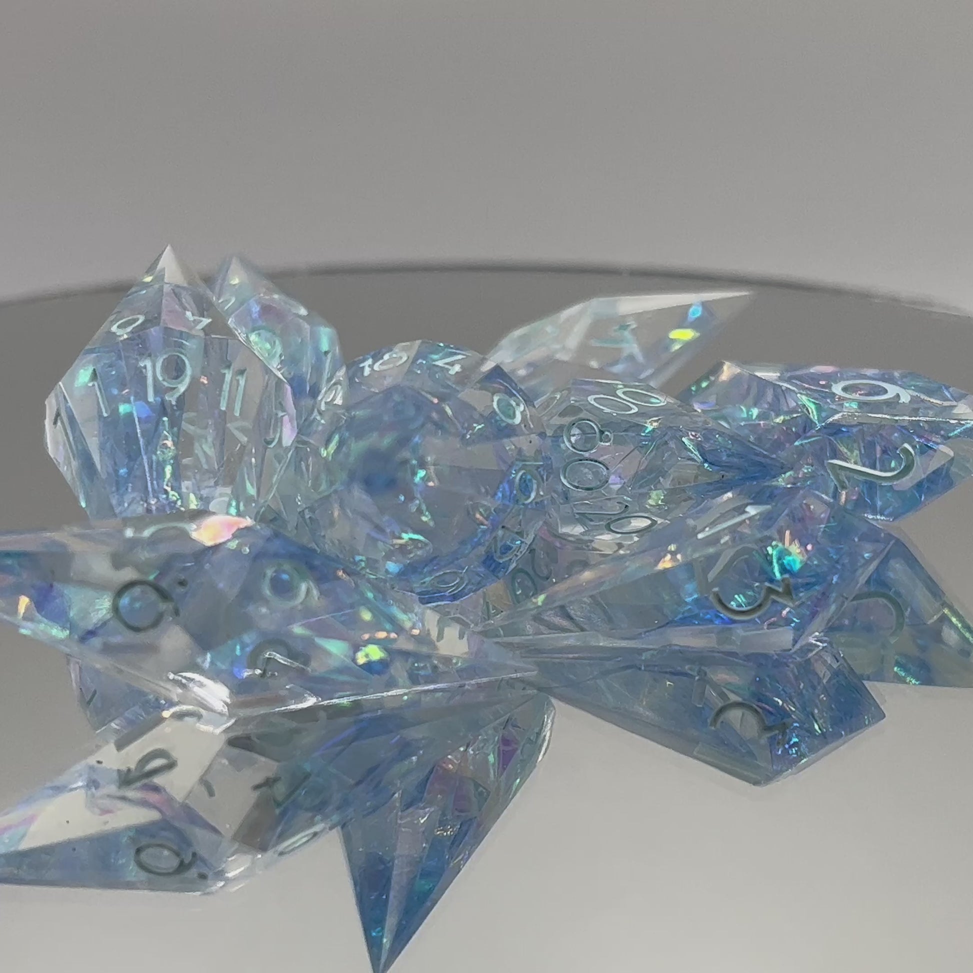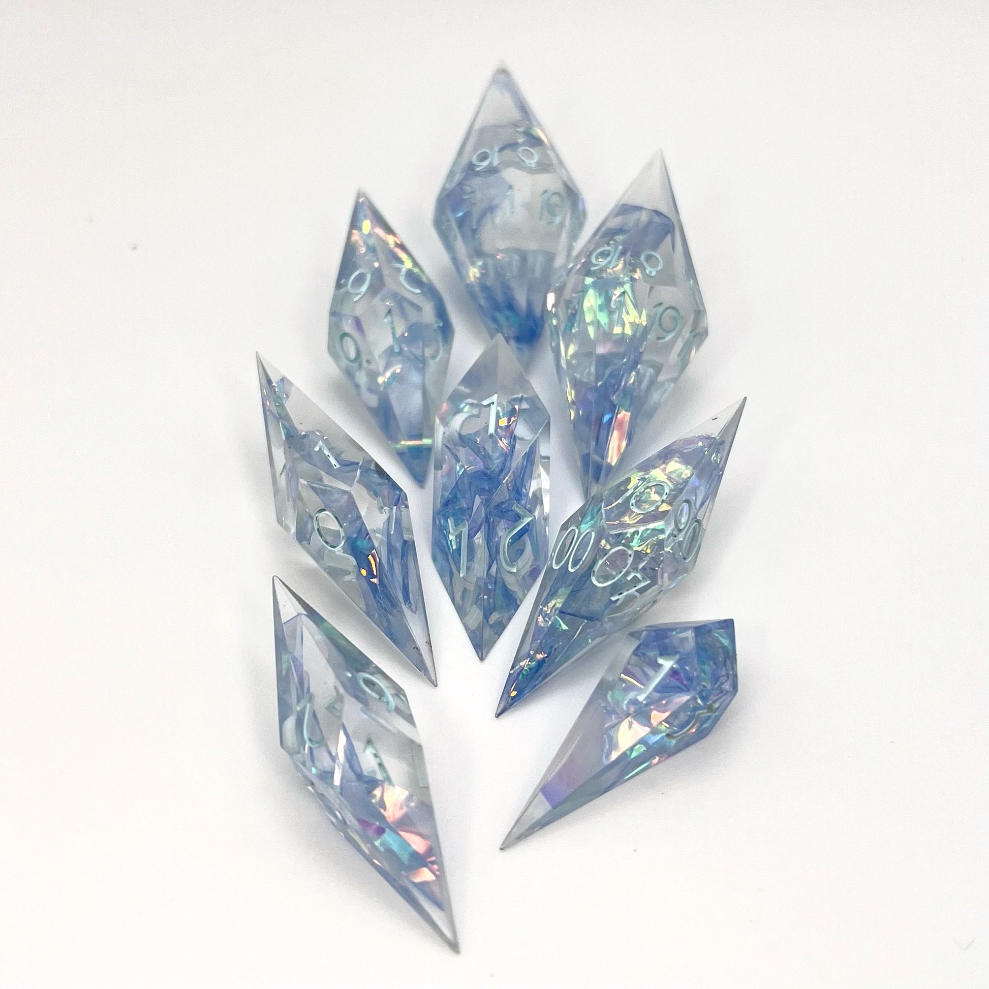 Inspired by the sharpest shards of ice, photos don't capture the sparkle of these ultra-stabby dice. Clear resin tinted ever so slightly blue hints at their icy nature, but it’s the way light dances inside them that truly reveals their magic.