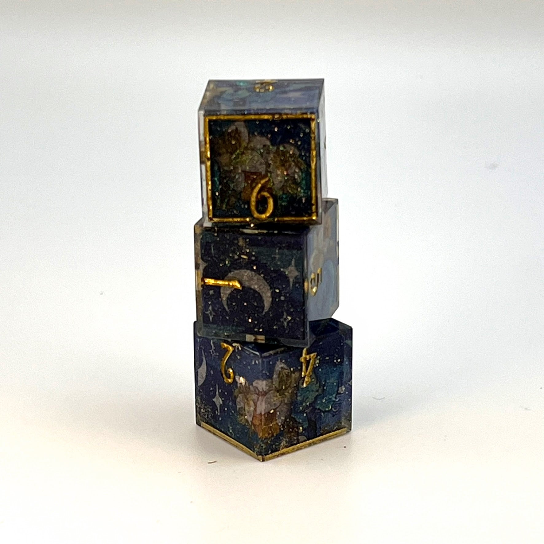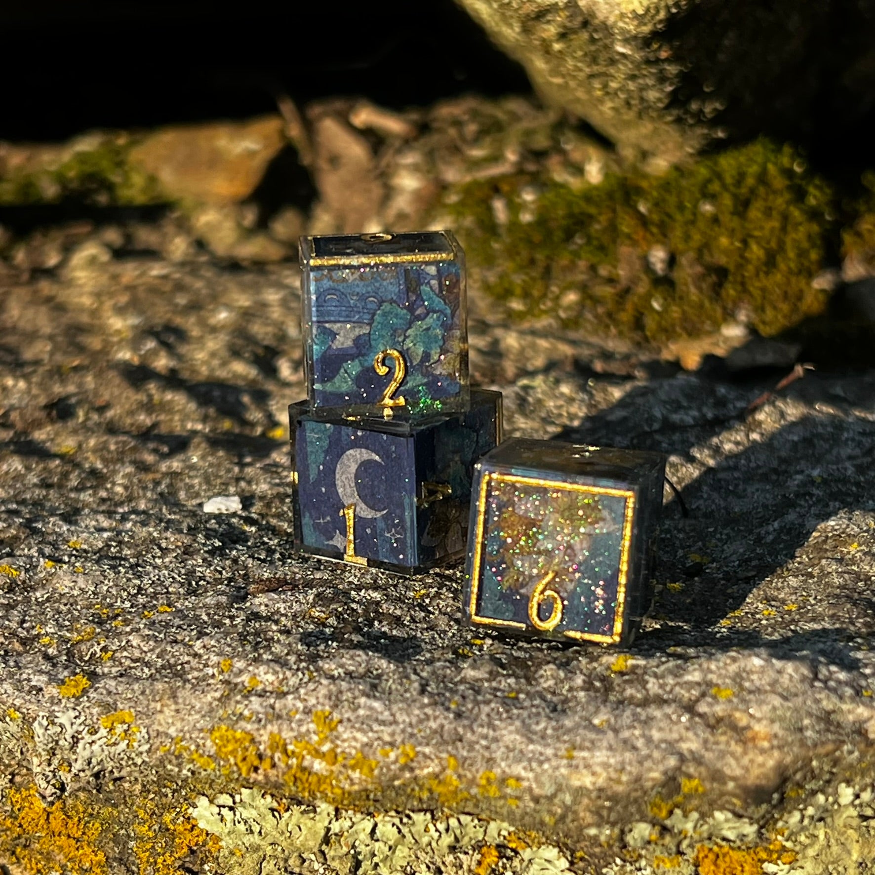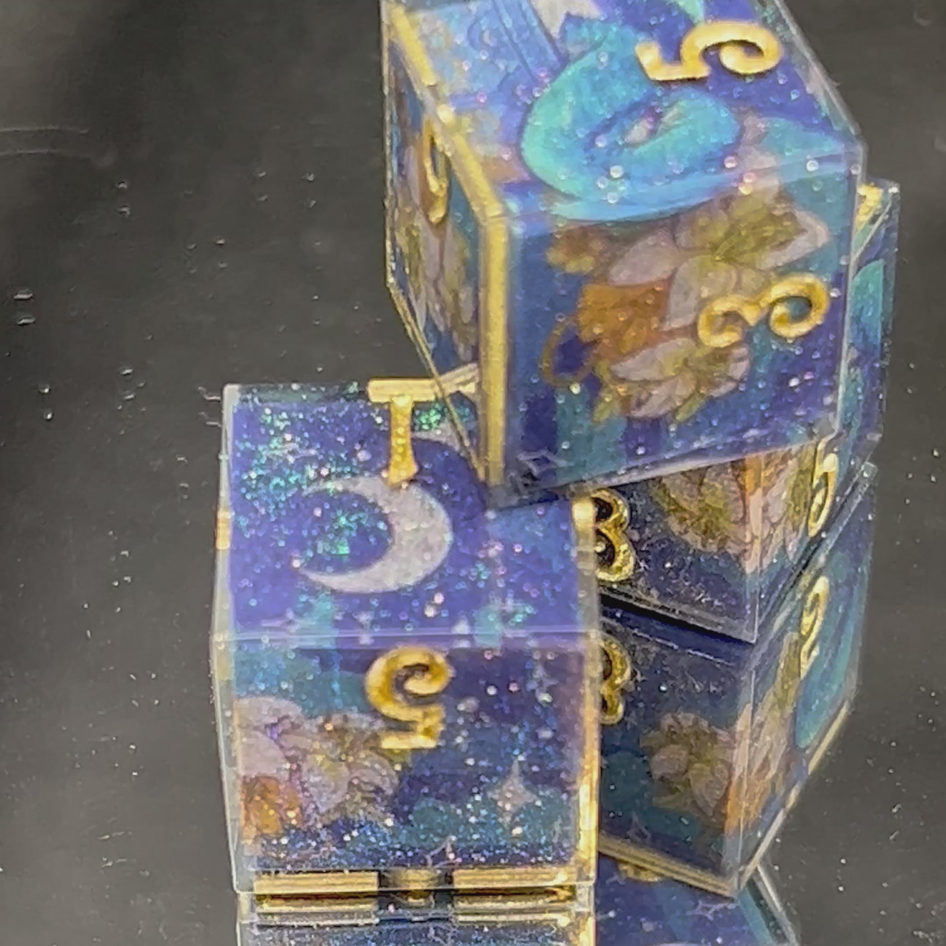 Even dragons need a break! These dice capture the serene moment when tiny dragons drift off in their teacup beds, surrounded by glitter that twinkles like stardust. Created with Sleepy Dragons Teacup Dragons washi by Sophiralou, they will add a touch of whimsy, sparkle, and comfort to your next game.