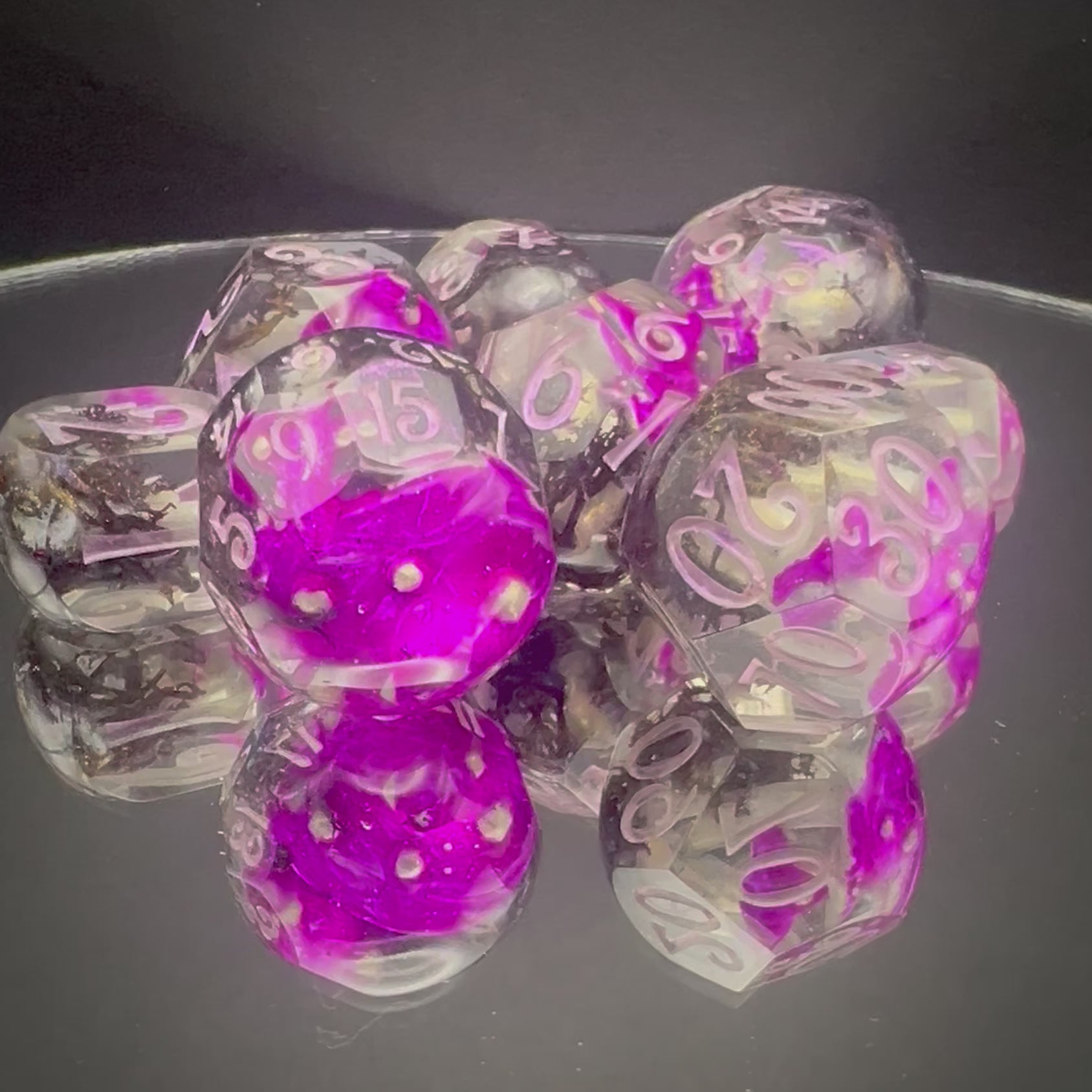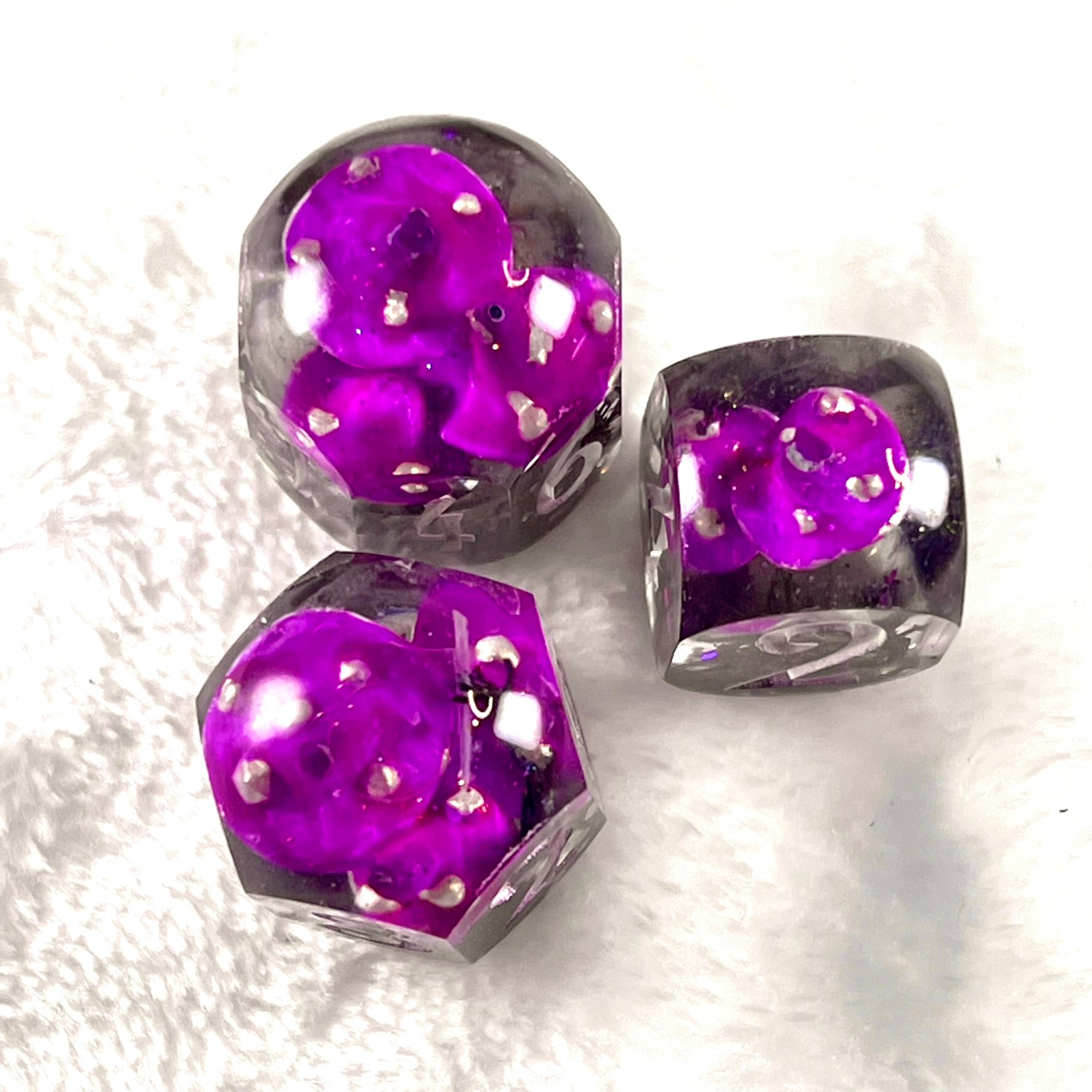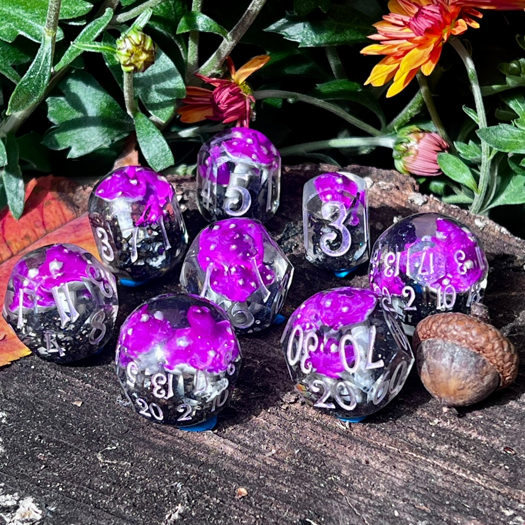 Rumors speak of a grove hidden deep in the forest where purple mushrooms grow in the dark undergrowth, brimming with mystical energy. This orb set brings that tale to life, with each die containing hand-painted mushrooms thriving in black moss. The unique shape of the orbs feels just as magical in hand, giving you the perfect tool for any arcane adventures.