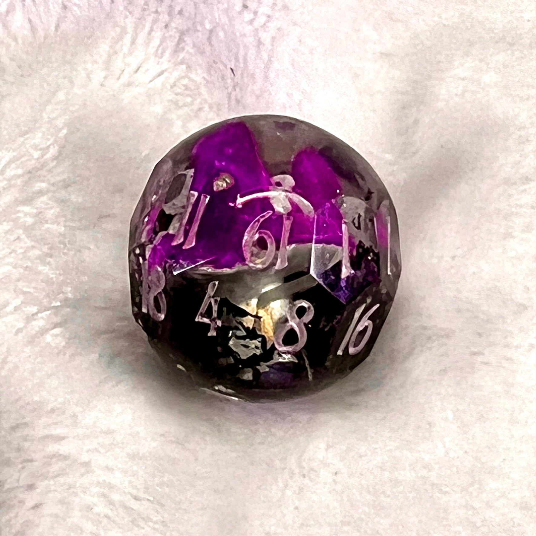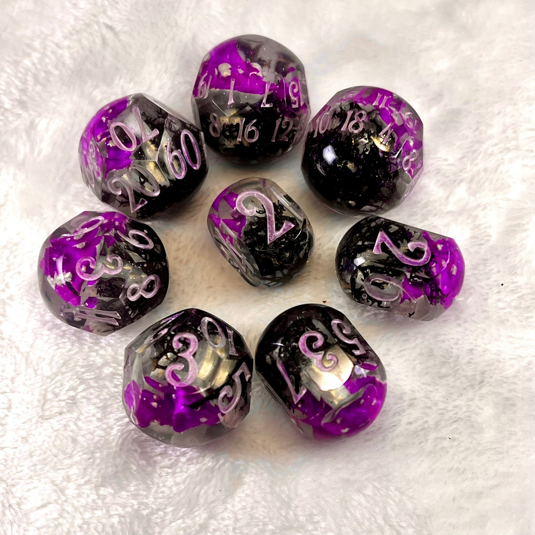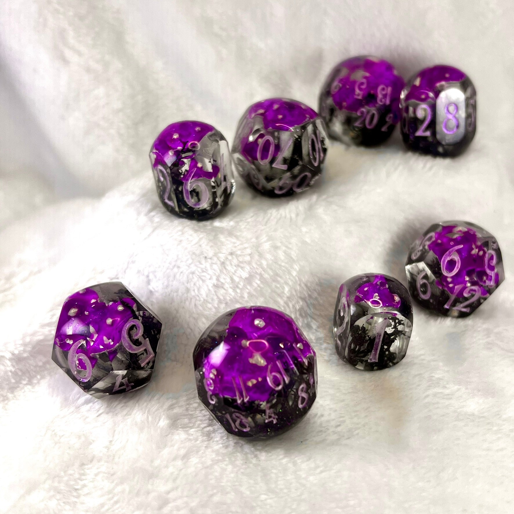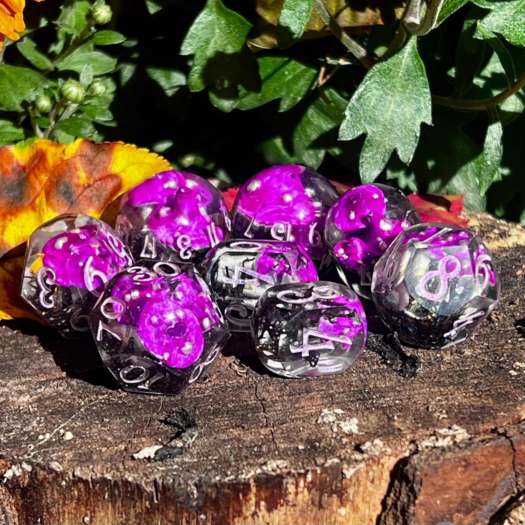 Rumors speak of a grove hidden deep in the forest where purple mushrooms grow in the dark undergrowth, brimming with mystical energy. This orb set brings that tale to life, with each die containing hand-painted mushrooms thriving in black moss. The unique shape of the orbs feels just as magical in hand, giving you the perfect tool for any arcane adventures.
