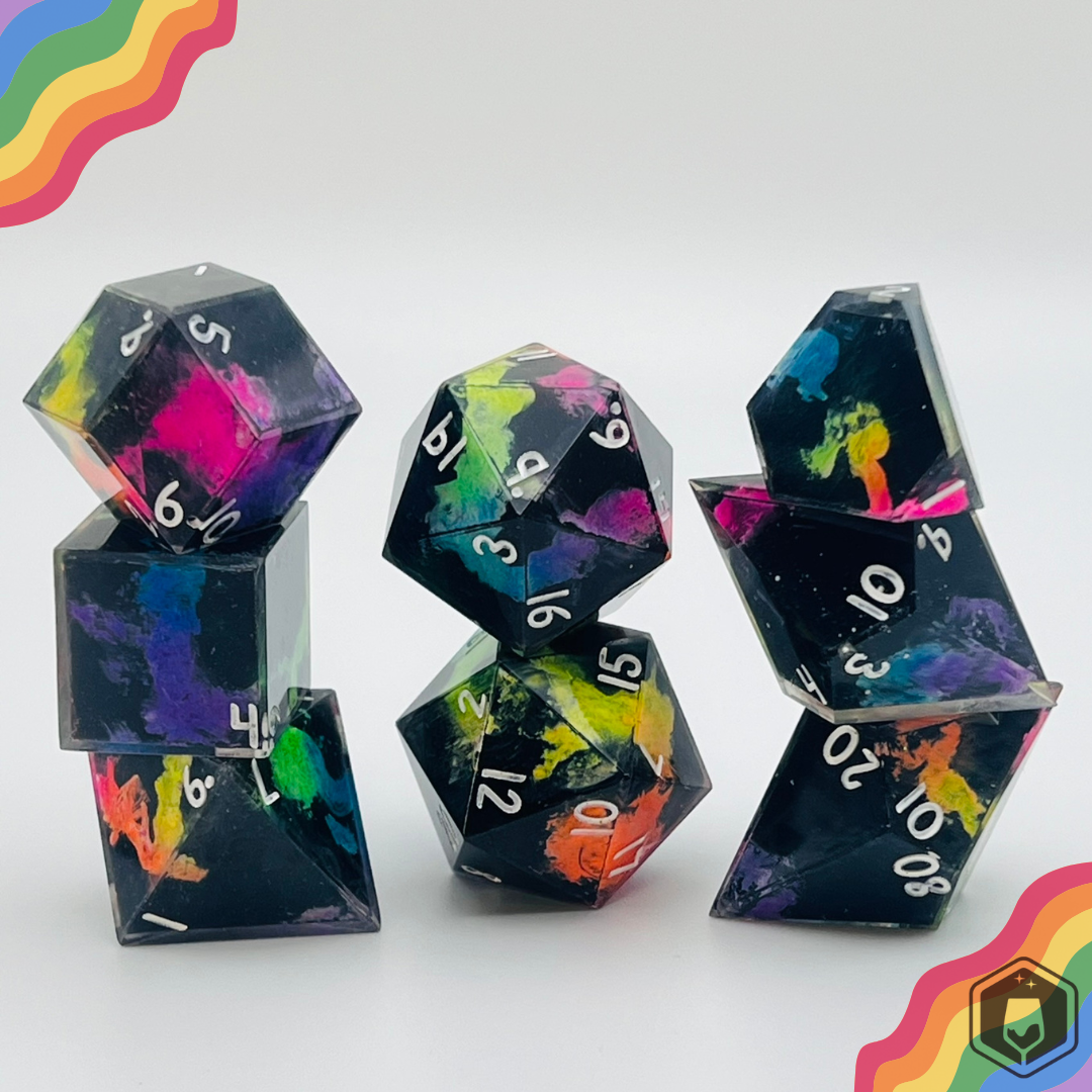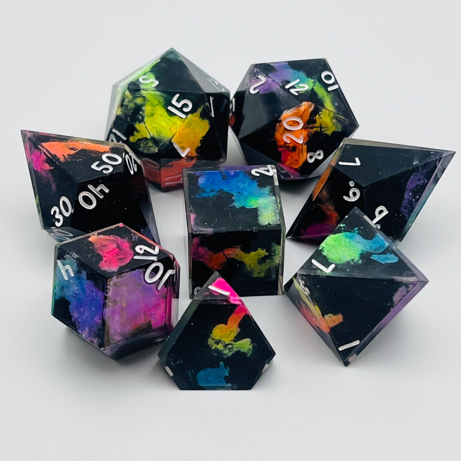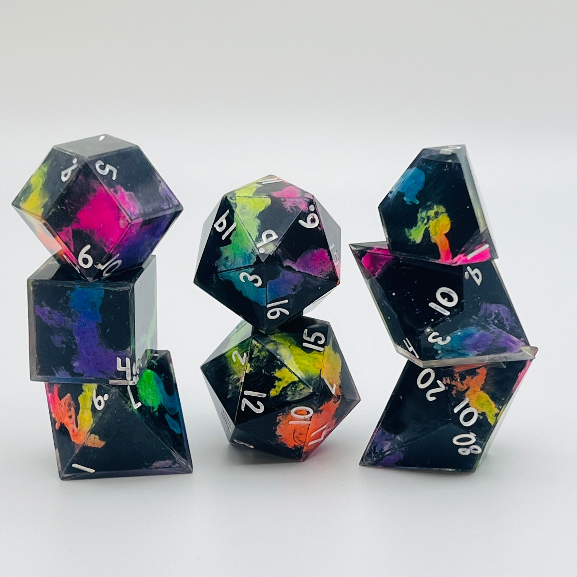 Embrace the haze of mystery with these black dice, highlighted by swirling neon smoke. Every roll begs the question "If the smoke is neon, what color is the fire?"