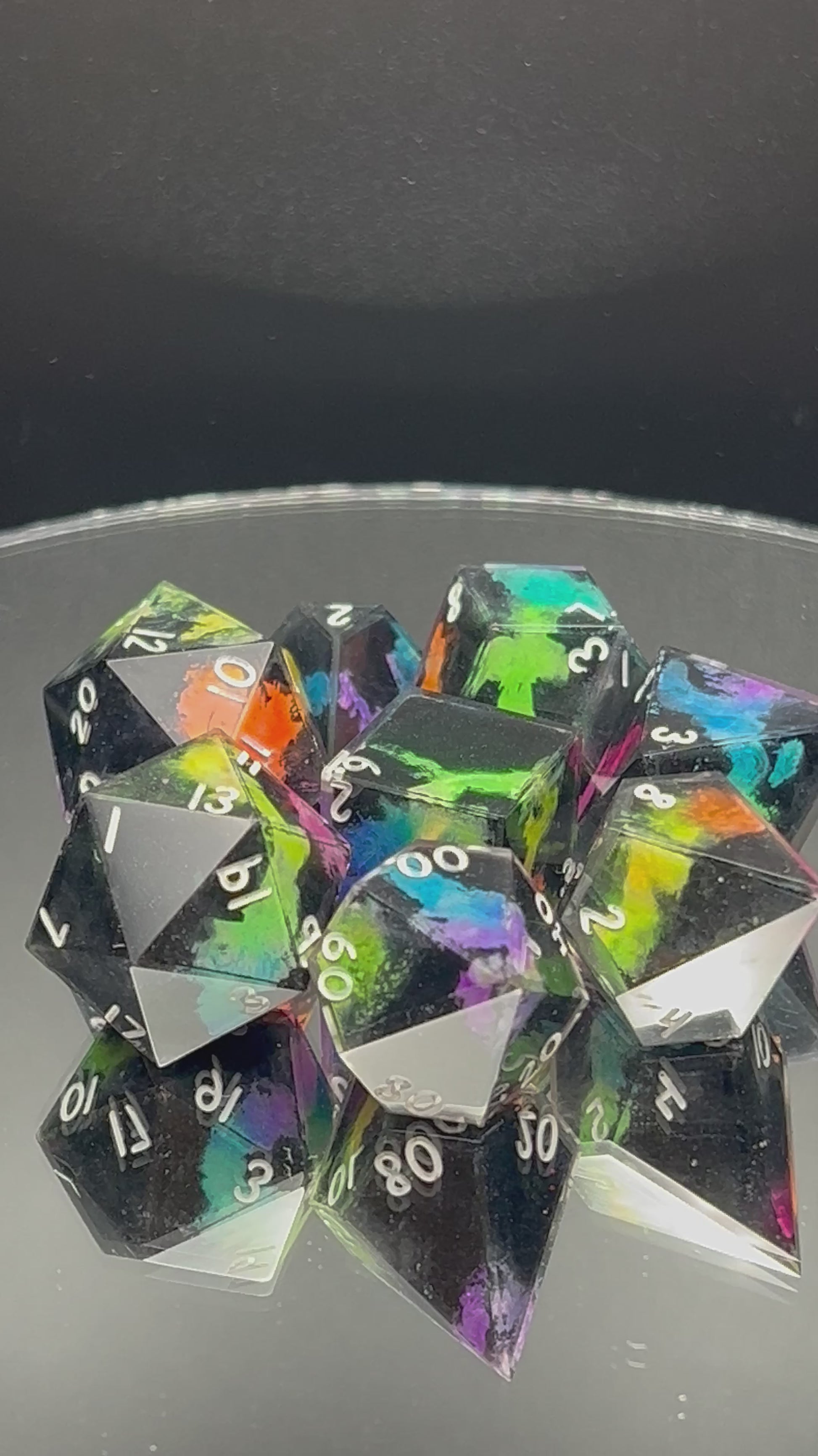 - This is an art-view-style set. The dice are slightly over-sized and the numbers are intentionally small and out of the way, so that you can better see what’s inside. If having your rolls visible from across the table is important to you, these may not be the dice for you.