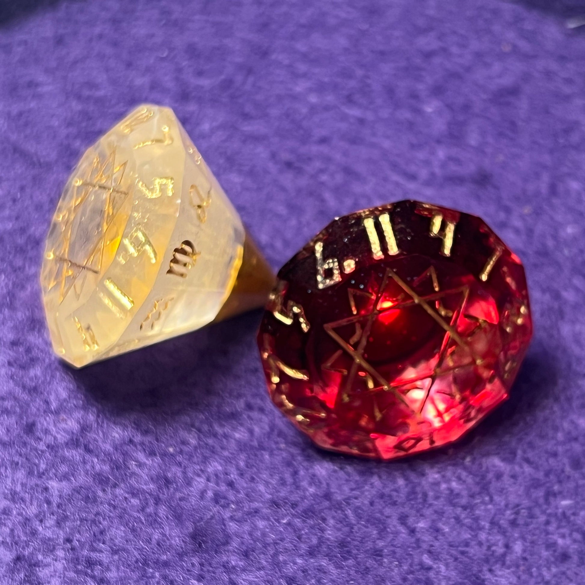 This d12 pair is all about contrast—one ruby red, one clear gold. Each die has a single centered LED that lights up when rolled on the powered tray. The shape catches and reflects the light beautifully, especially at the heart of the 12-pointed starburst design on the top face. Each die also features zodiac symbols around the edge.