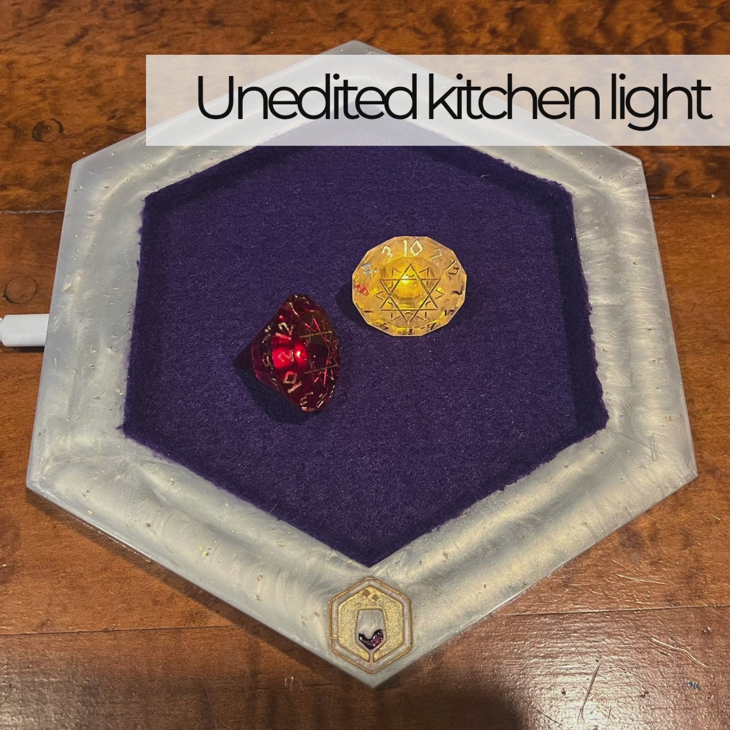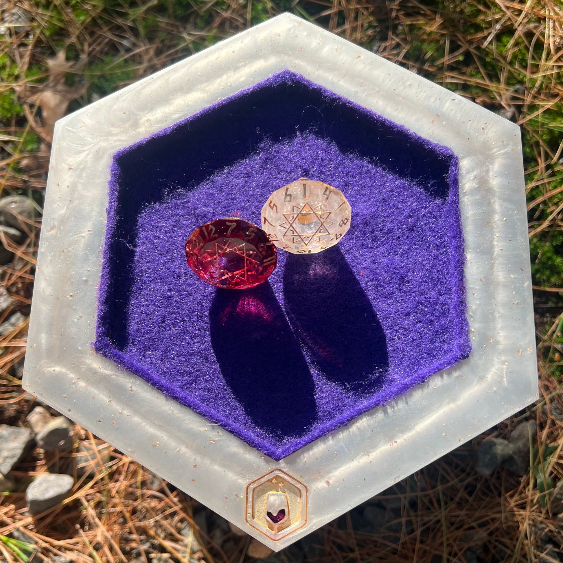 - These are handmade resin dice, and like all handmade things, small variations and surface imperfections may occur. They are cast, sanded, and polished by hand—not mass-produced. The dice tray, too, is cast resin, and goes thru the same polishing process as my handmade dice—though admittedly a bit less rigorously.
