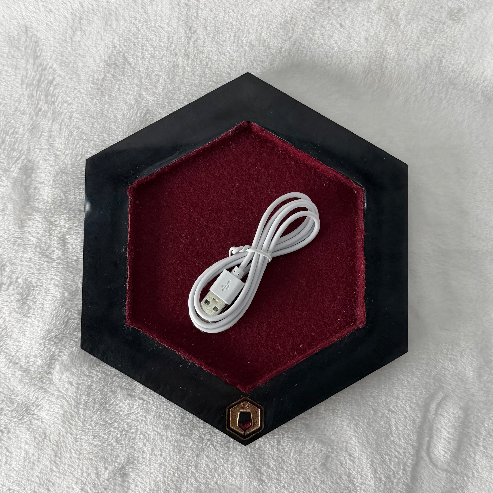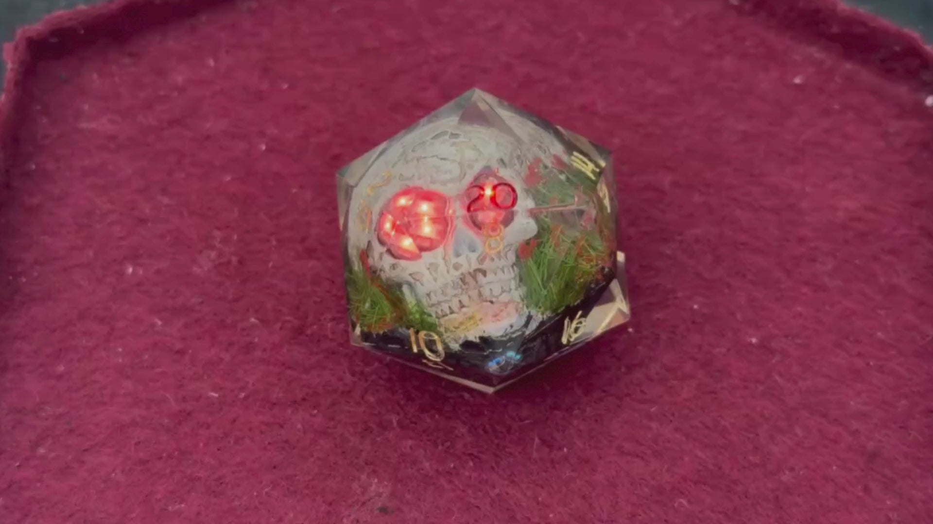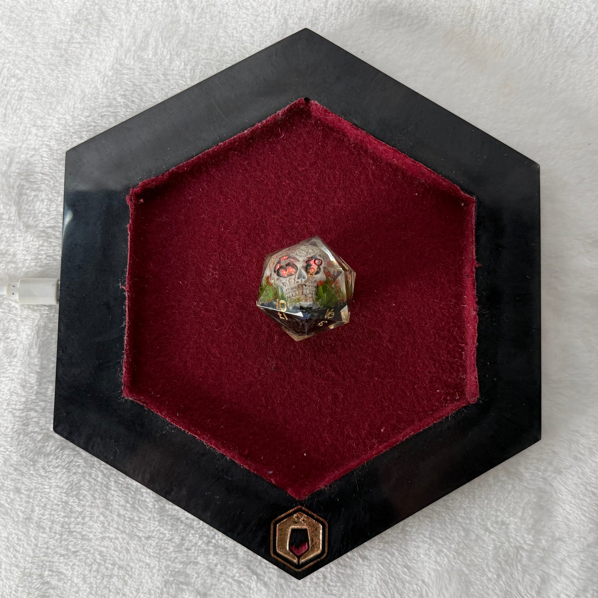 The powered dice tray is cast in black resin with a deep burgundy felt liner, giving Old Five-Eyes a backdrop that suits his eerie glow. The felt keeps rolls quiet while letting the red light feel just a little more ominous.