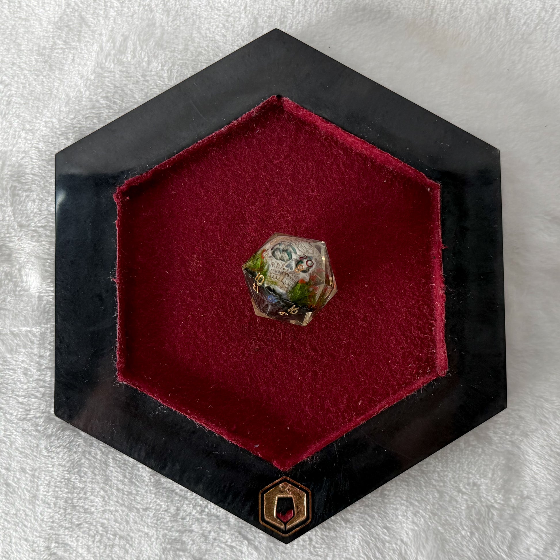 These are handmade resin dice, and like all handmade things, small variations and surface imperfections may occur. They are cast, sanded, and polished by hand—not mass-produced. The dice tray, too, is cast resin, and goes thru the same polishing process as my handmade dice—though admittedly a bit less rigorously.