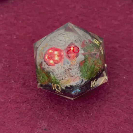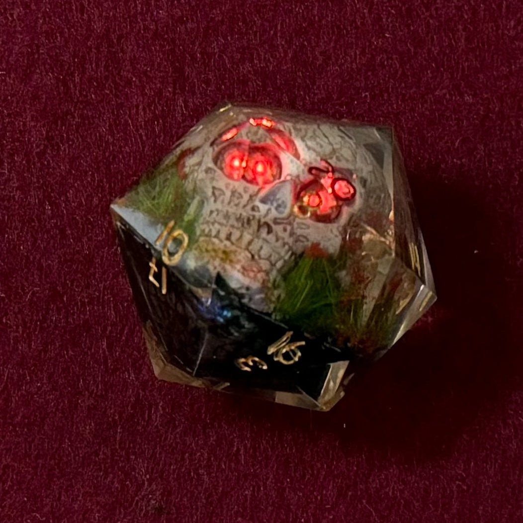 Is that skull looking at you funny? Maybe! Old Five Eyes gets his name from the five glowing pupils that appear to shine from one of his eyes. (Actually, the effect is because he didn't settle correctly in the mold, but I wouldn't tell him that.) His stare may be lopsided, but he still rolls well and makes a great pick for players who enjoy dice with a little character baked in.