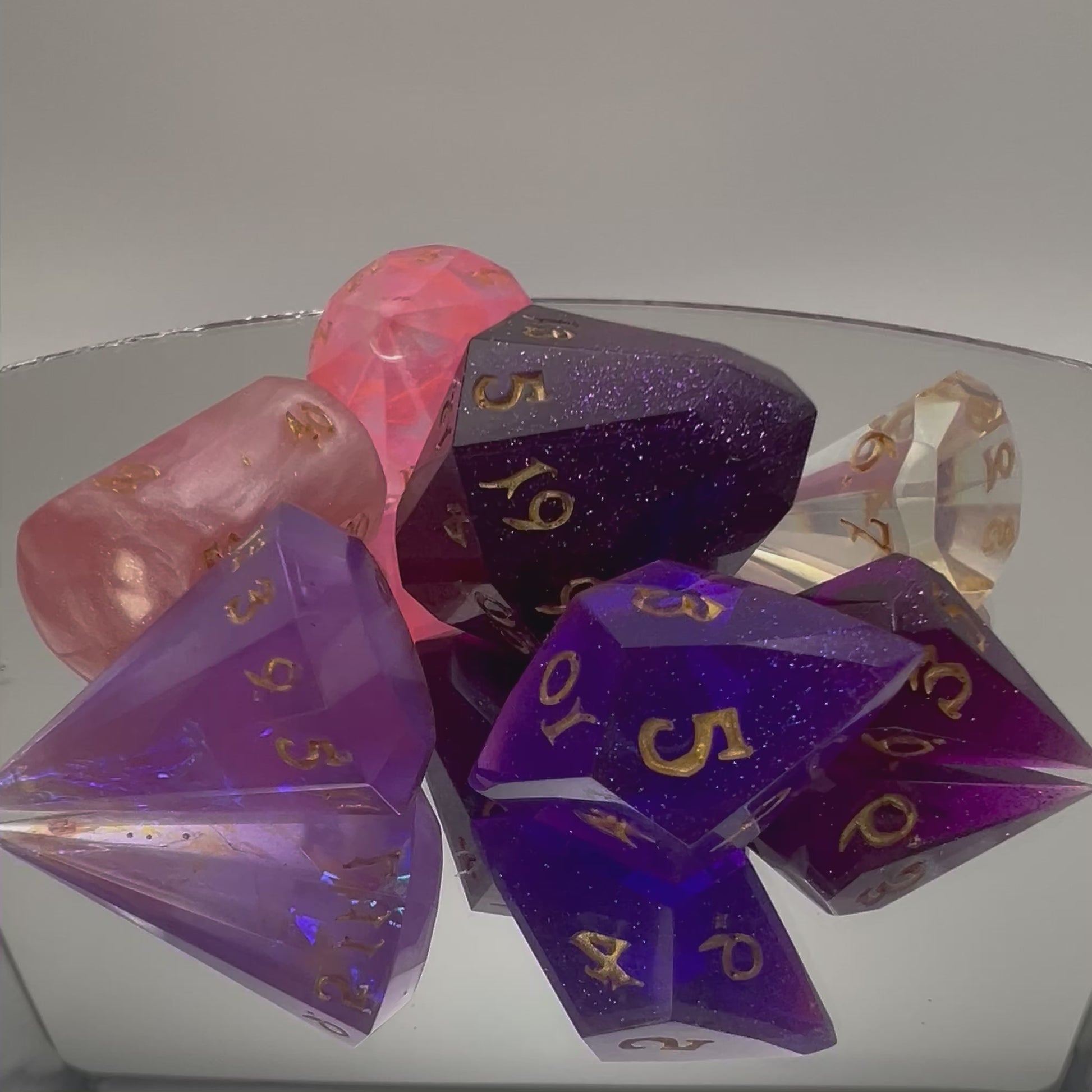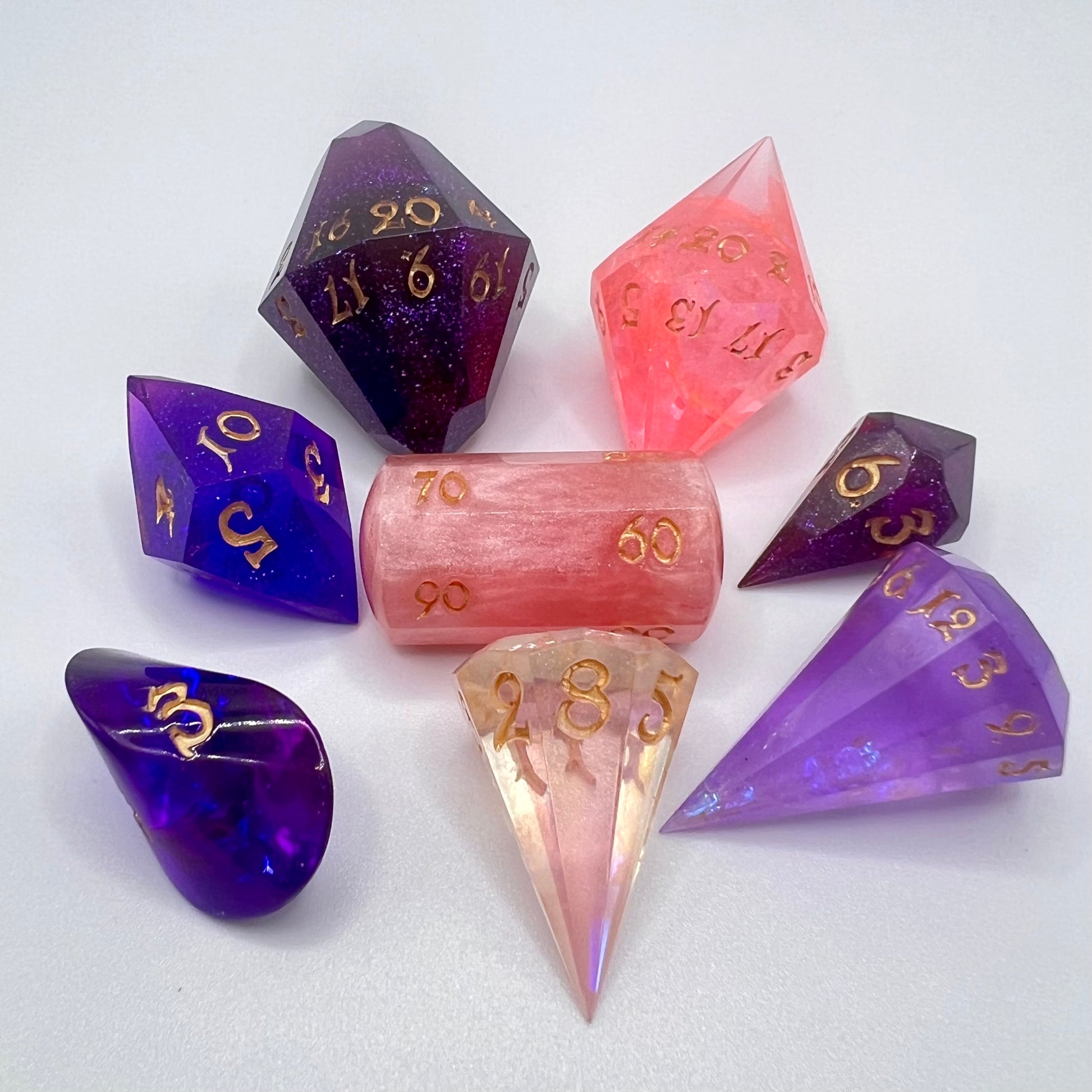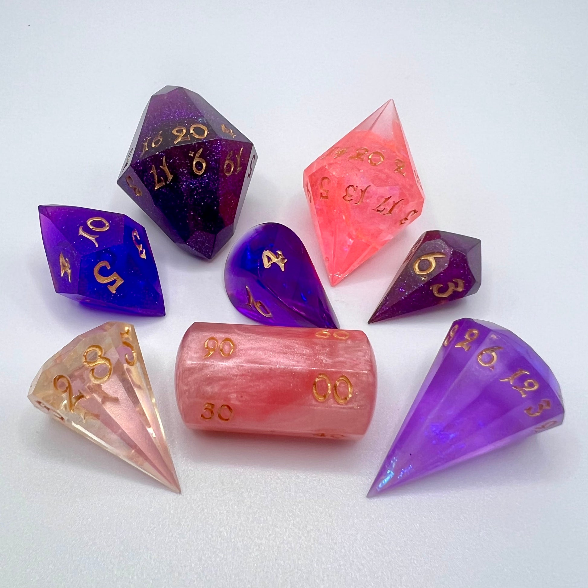 Faerie's Hoard dice gleam with vibrant pinks and purples. These treasure-style dice look like they were taken from a faerie's secret stash, adding a touch of Feywild magic to your rolls.
