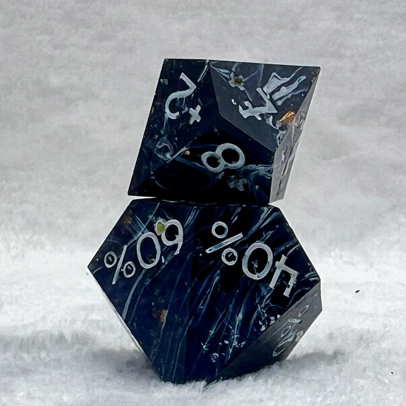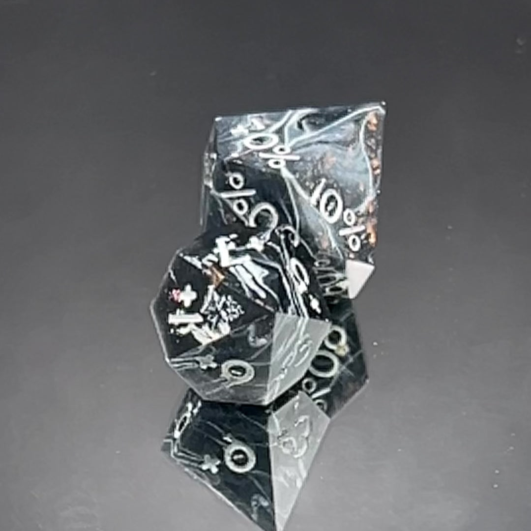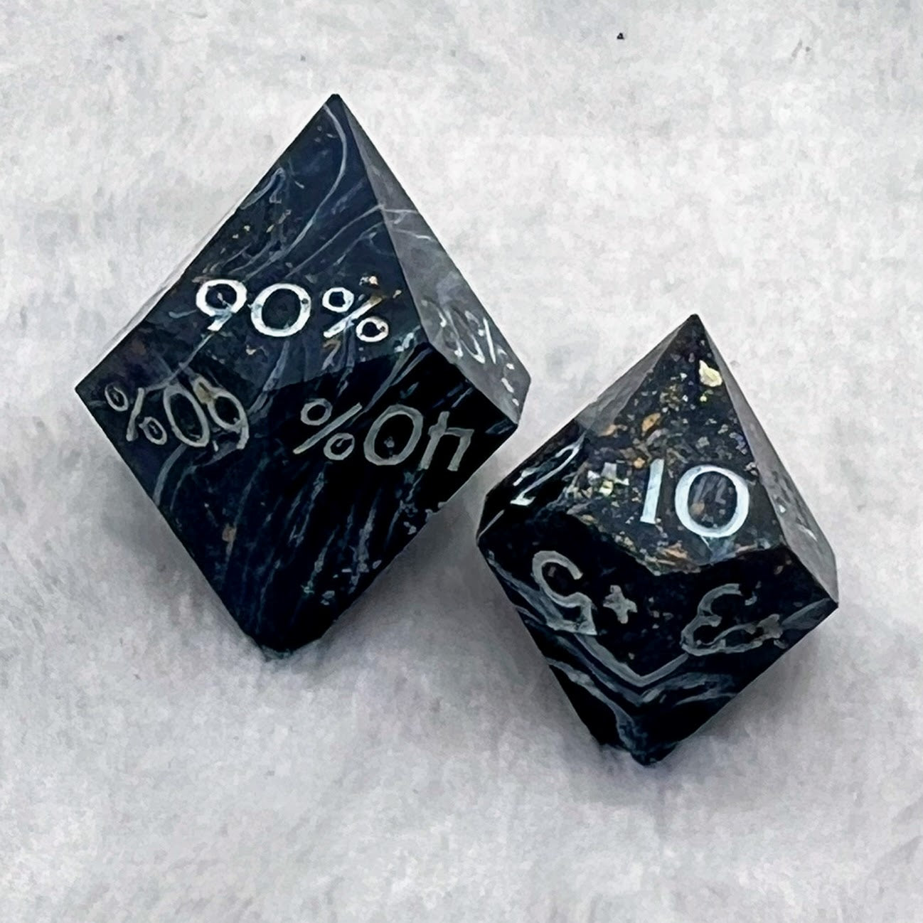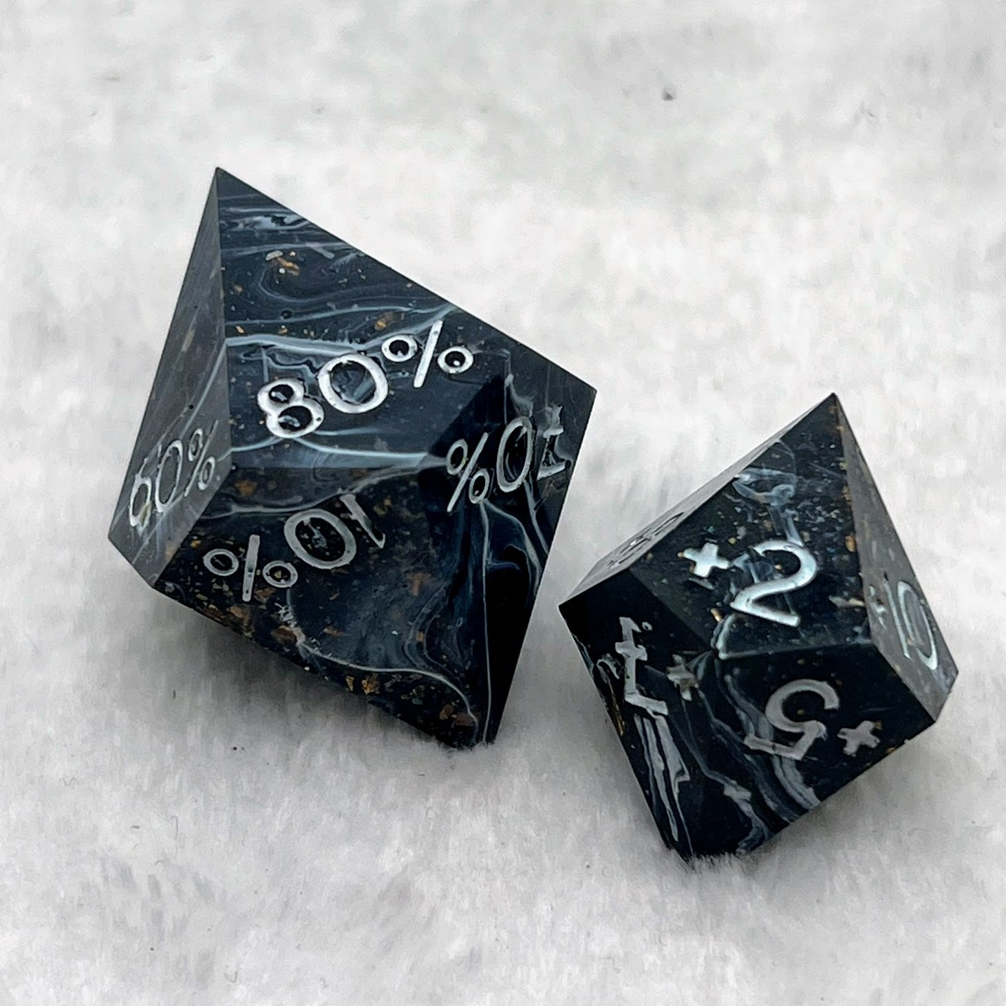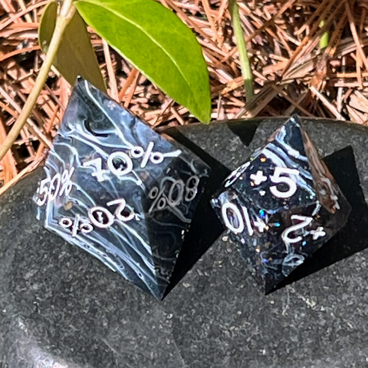 This black marble-look percentile pair is designed to keep things simple—bold white ink, clean layout, and no confusion about how to read your roll. Because Laura Bailey is a very smart woman, and she should never have to ask how her dice work.