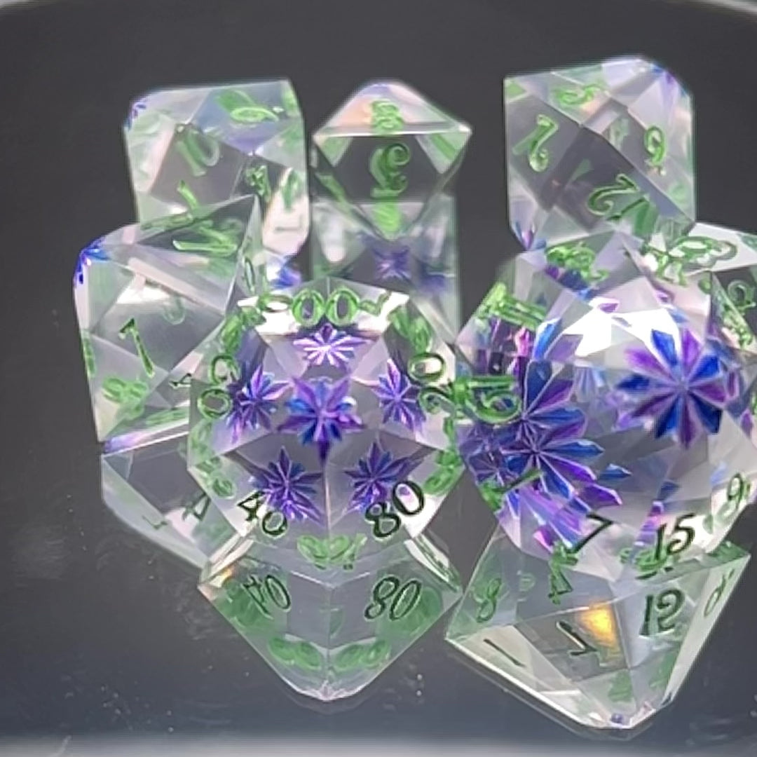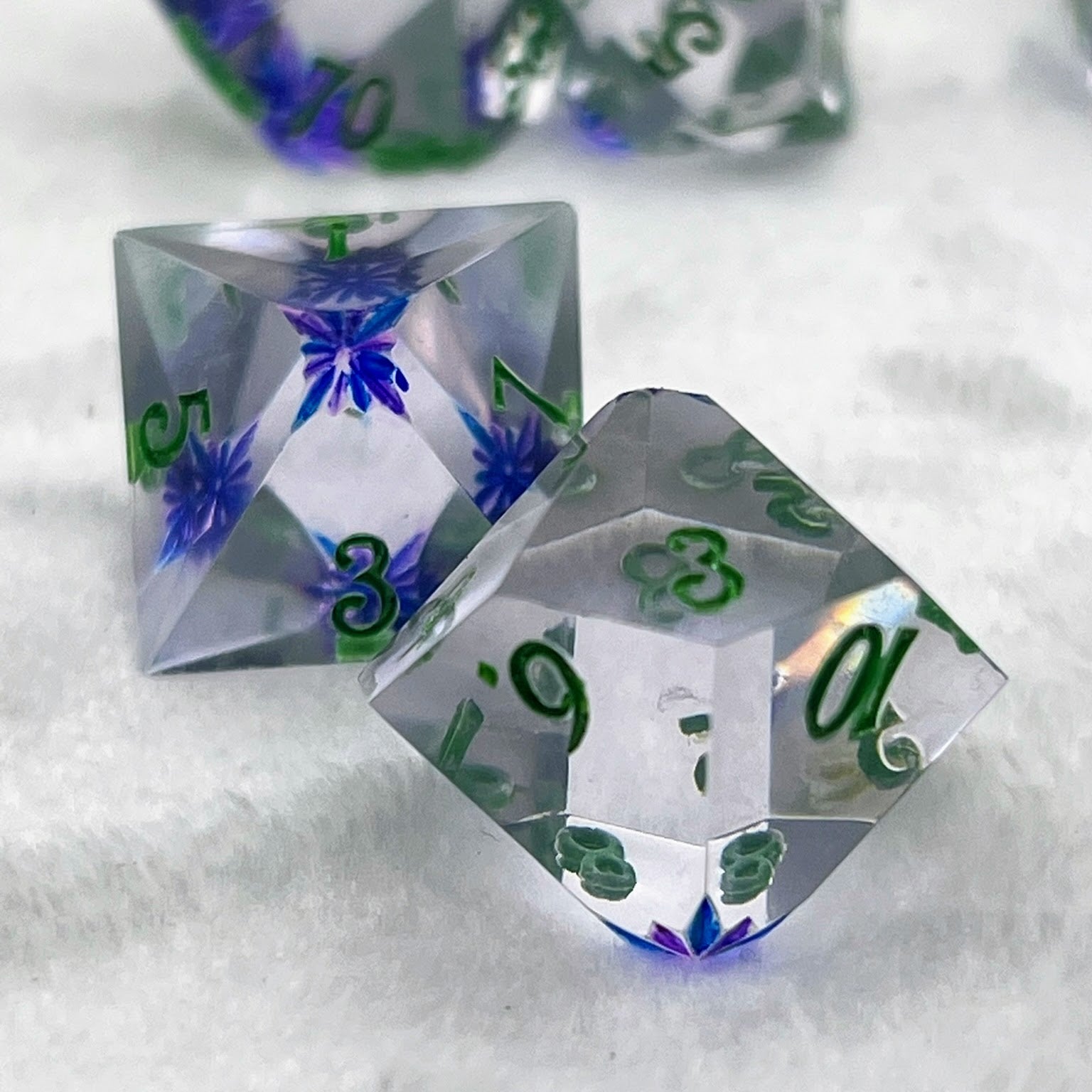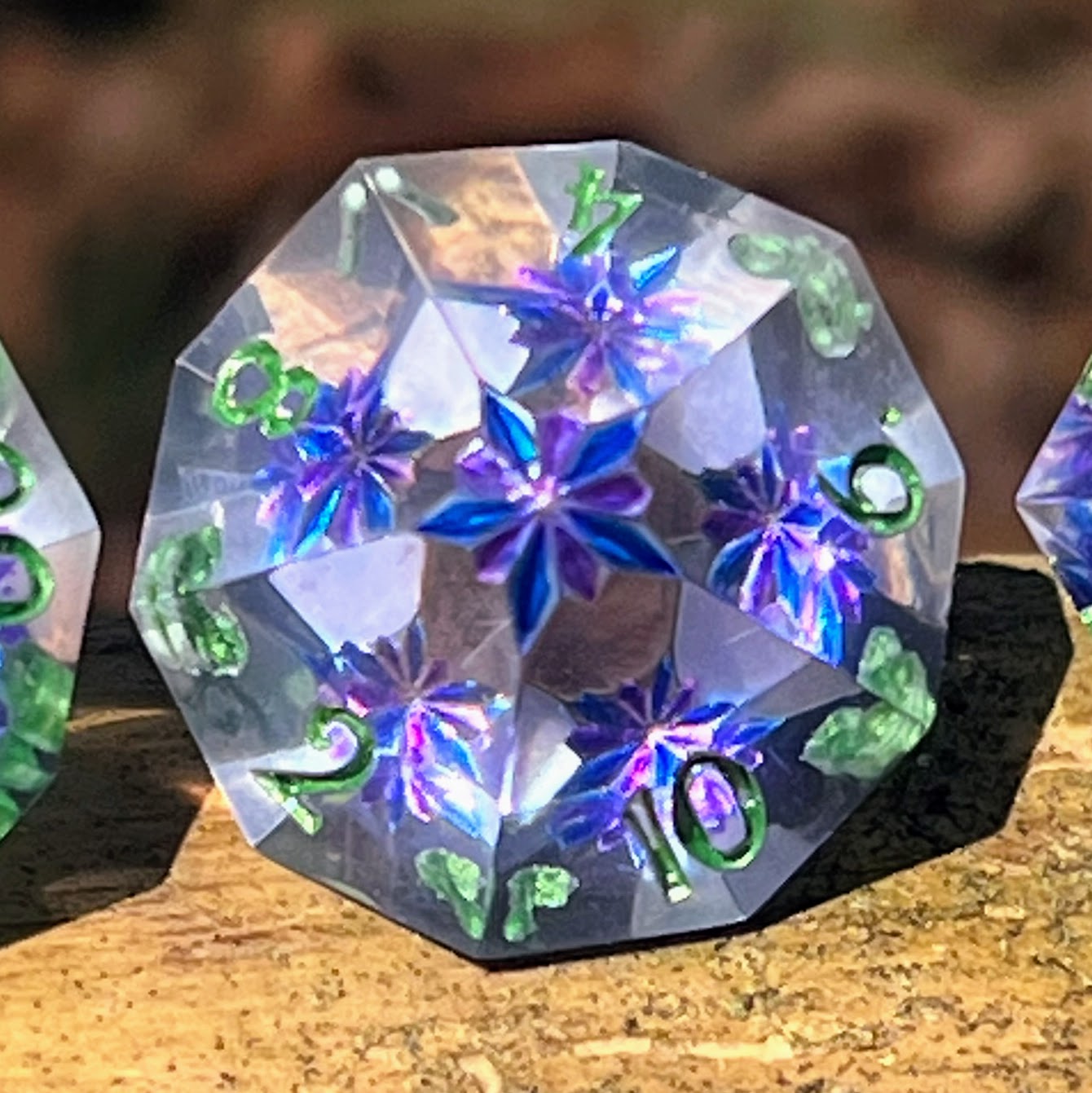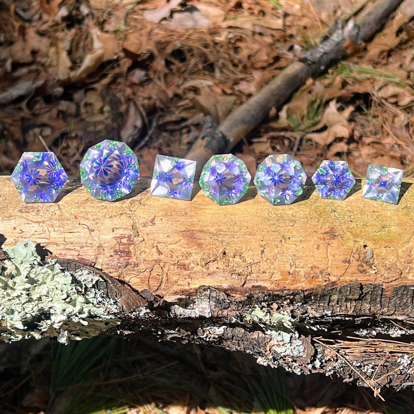 From one side, they’re crystal clear. From another, they explode with color. Inspired by crocuses, violets, and other early spring blooms, these kaleidoscope-style dice reveal layered floral reflections beneath the surface—like catching a garden in a shard of glass.