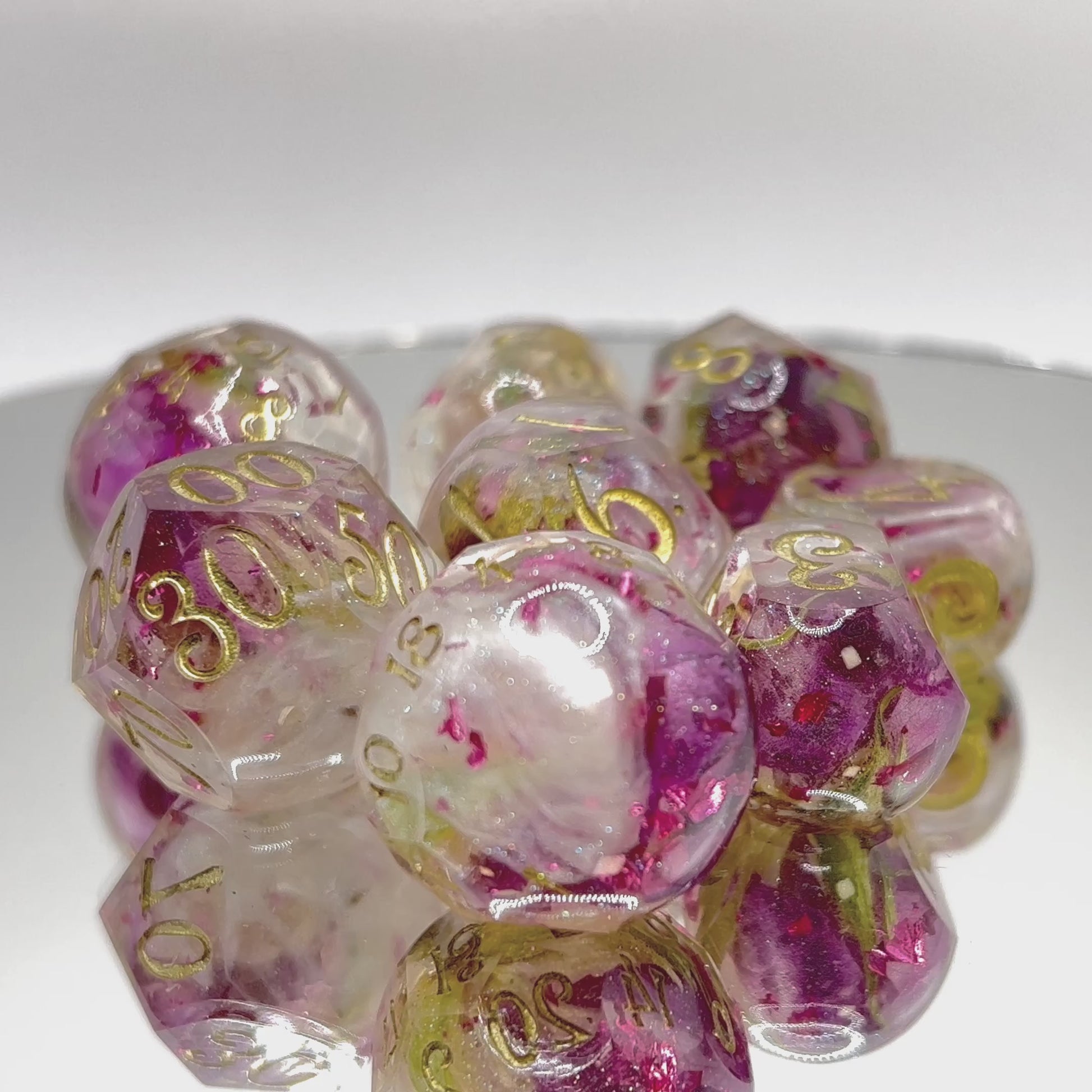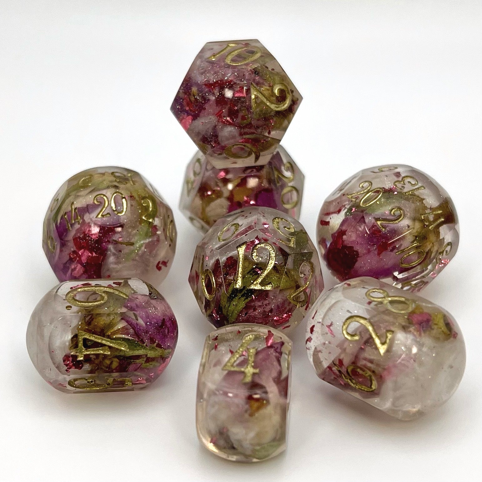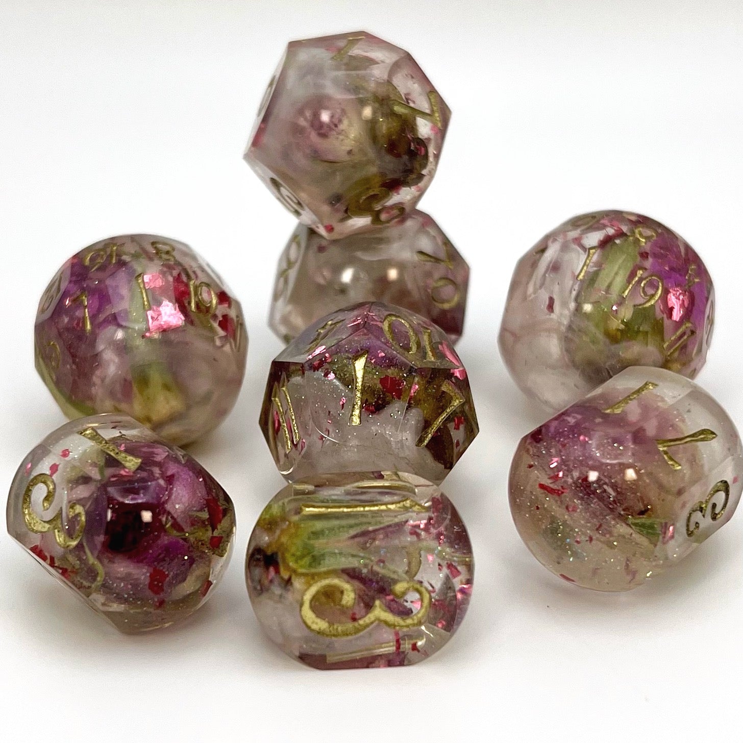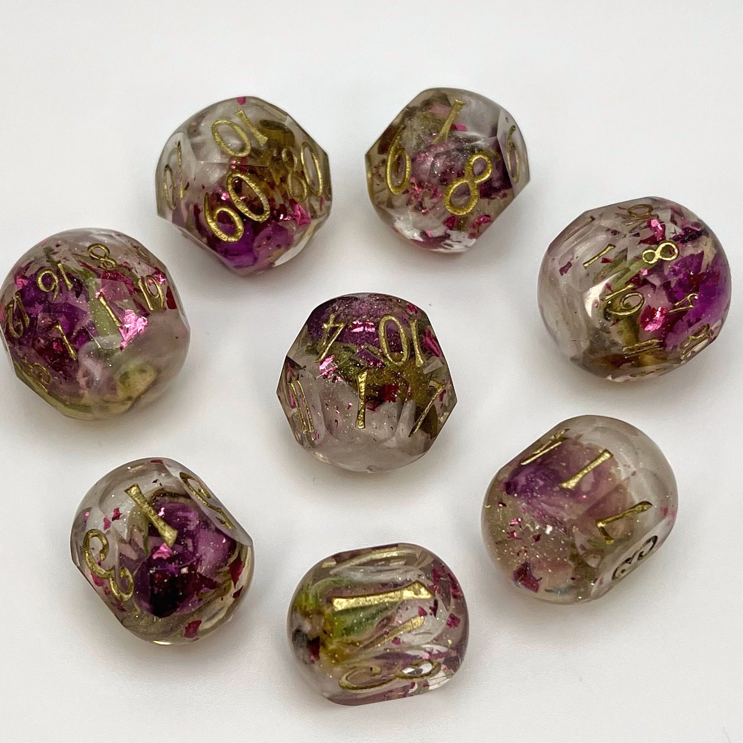 Rosebuds float in a sea of white and clear resin, laced with green sparkles and rose-pink foil. These dice are so elegant that if you stare at them for too long, you may find yourself captivated by their frosty beauty.