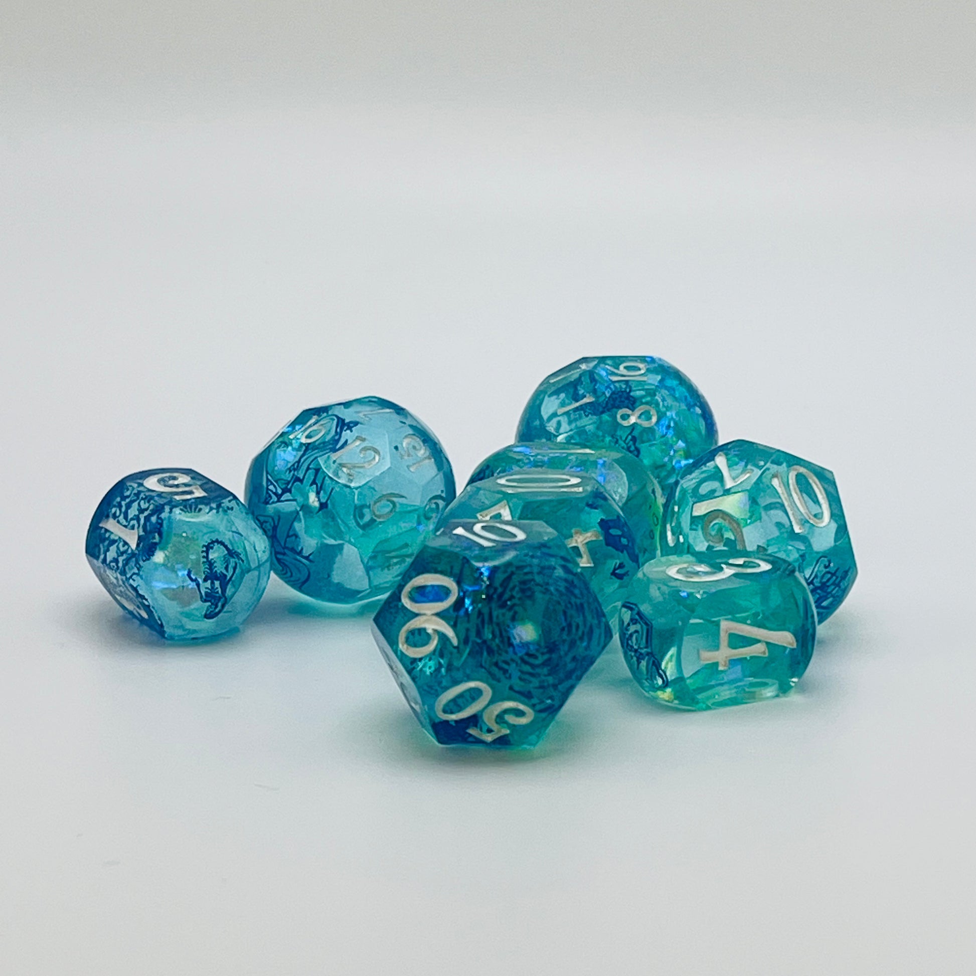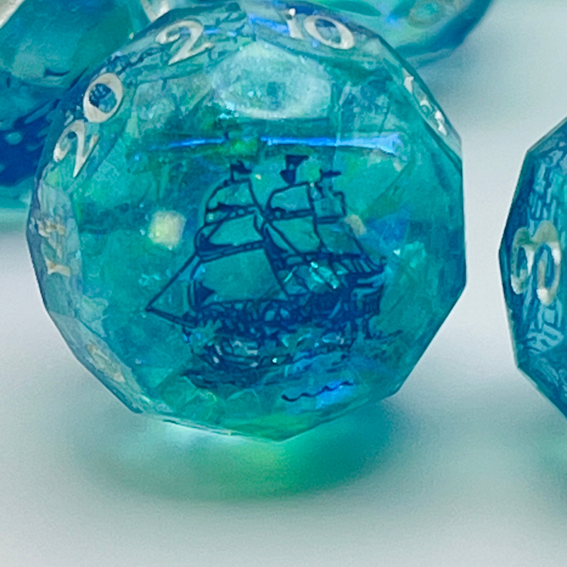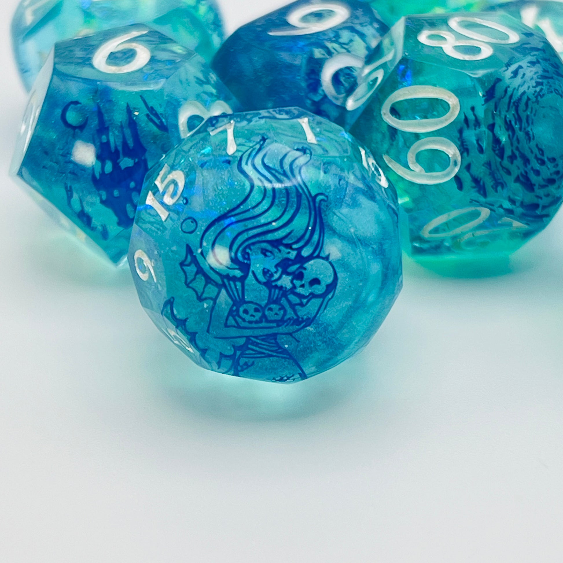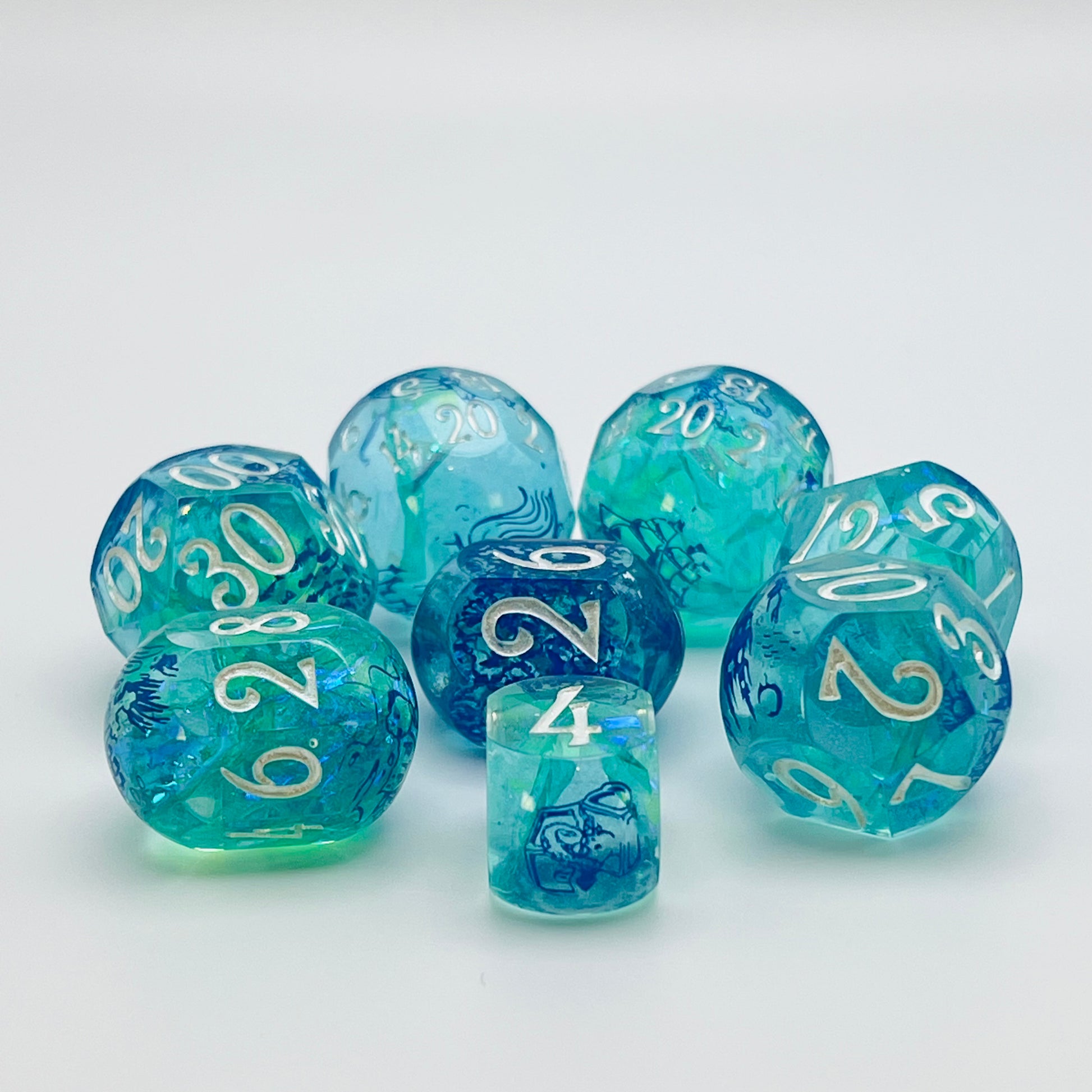 Unravel the legends of the deep with Mariner’s Myth. These mesmerizing orb-style dice hold the secrets of the ocean within their sparkly blue-green depths. With scenes of treasure, skeletal mermaids, and legendary ships, each roll beckons you into an unforgettable adventure beneath the waves.