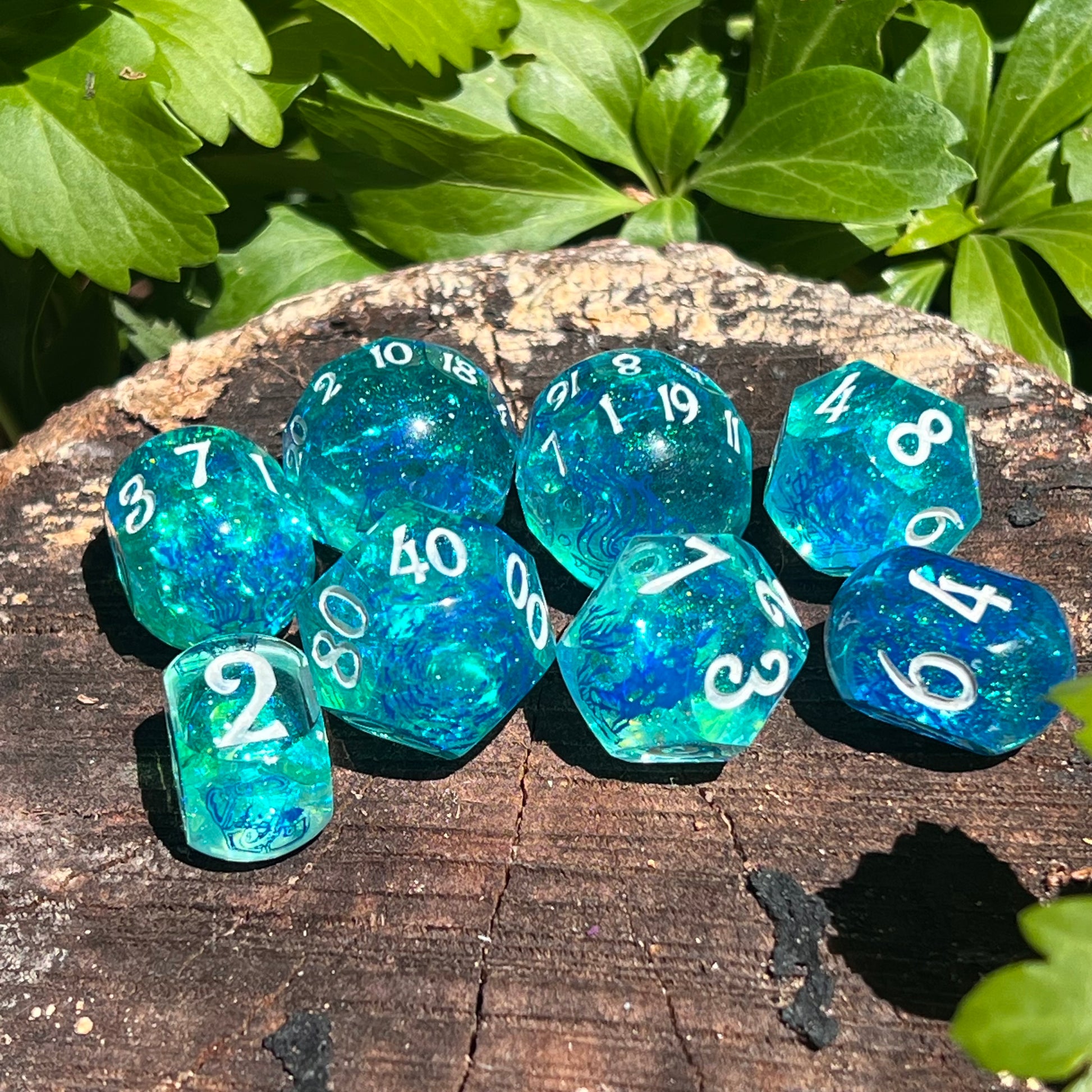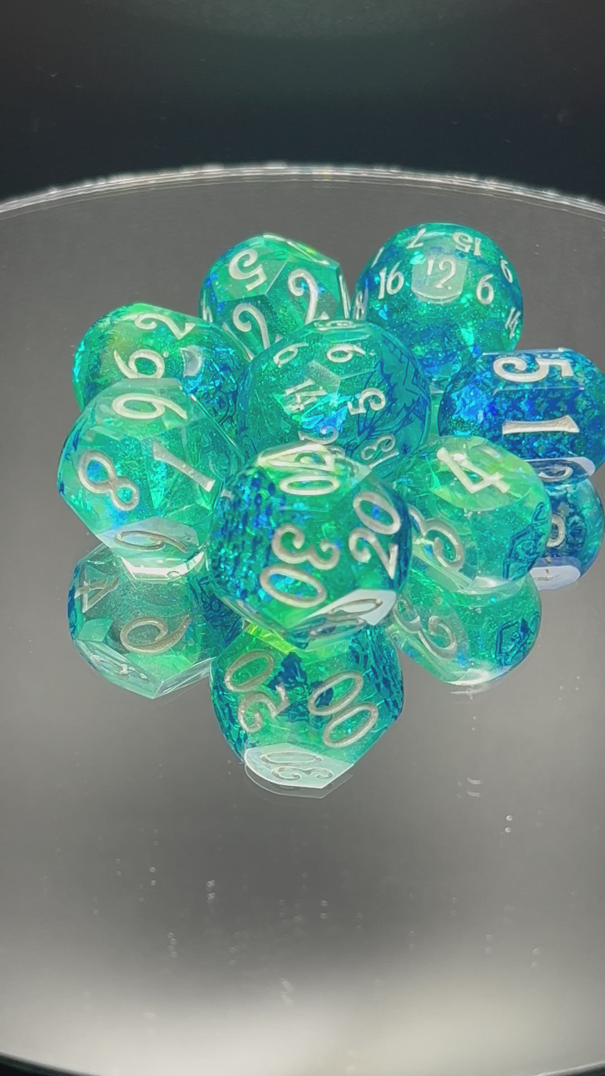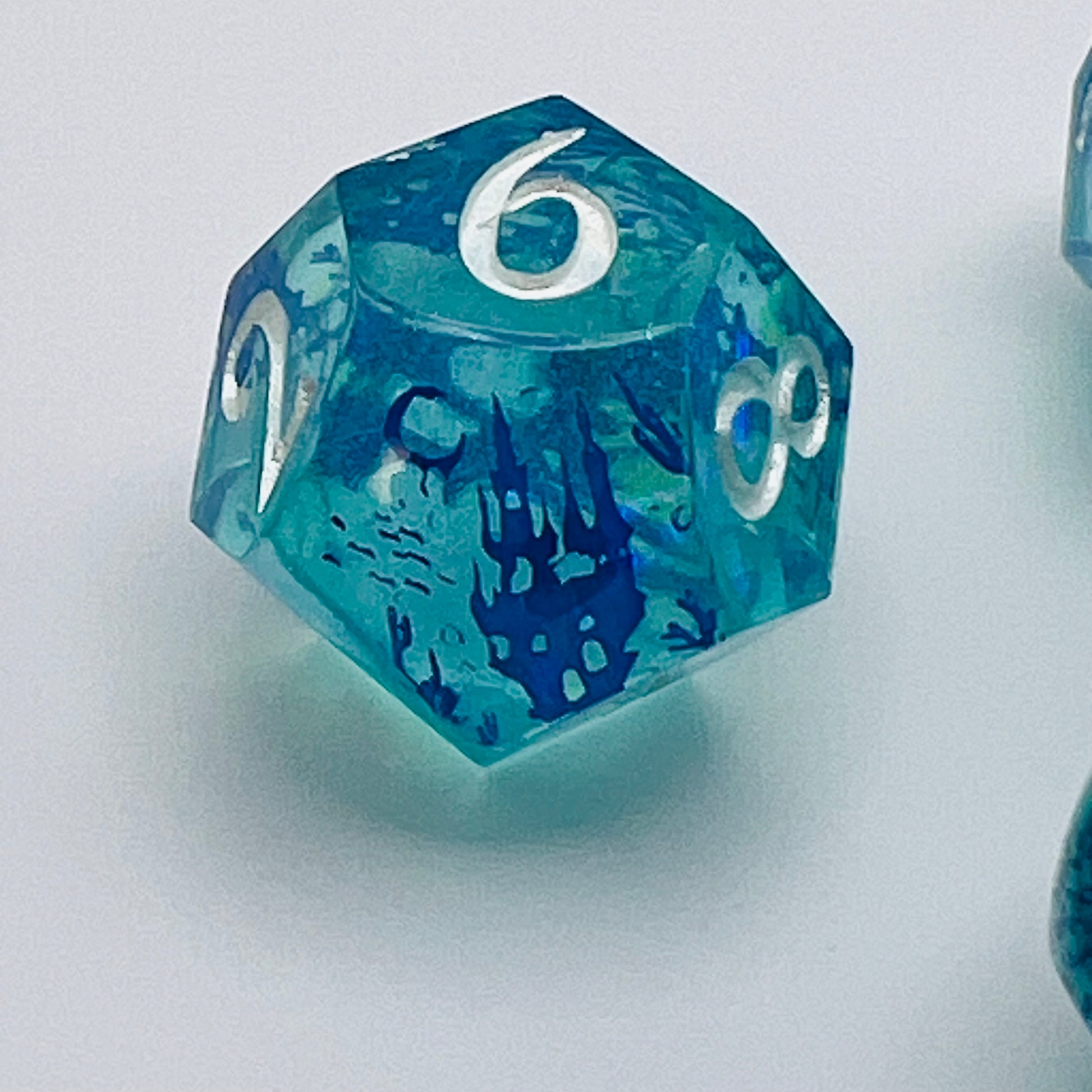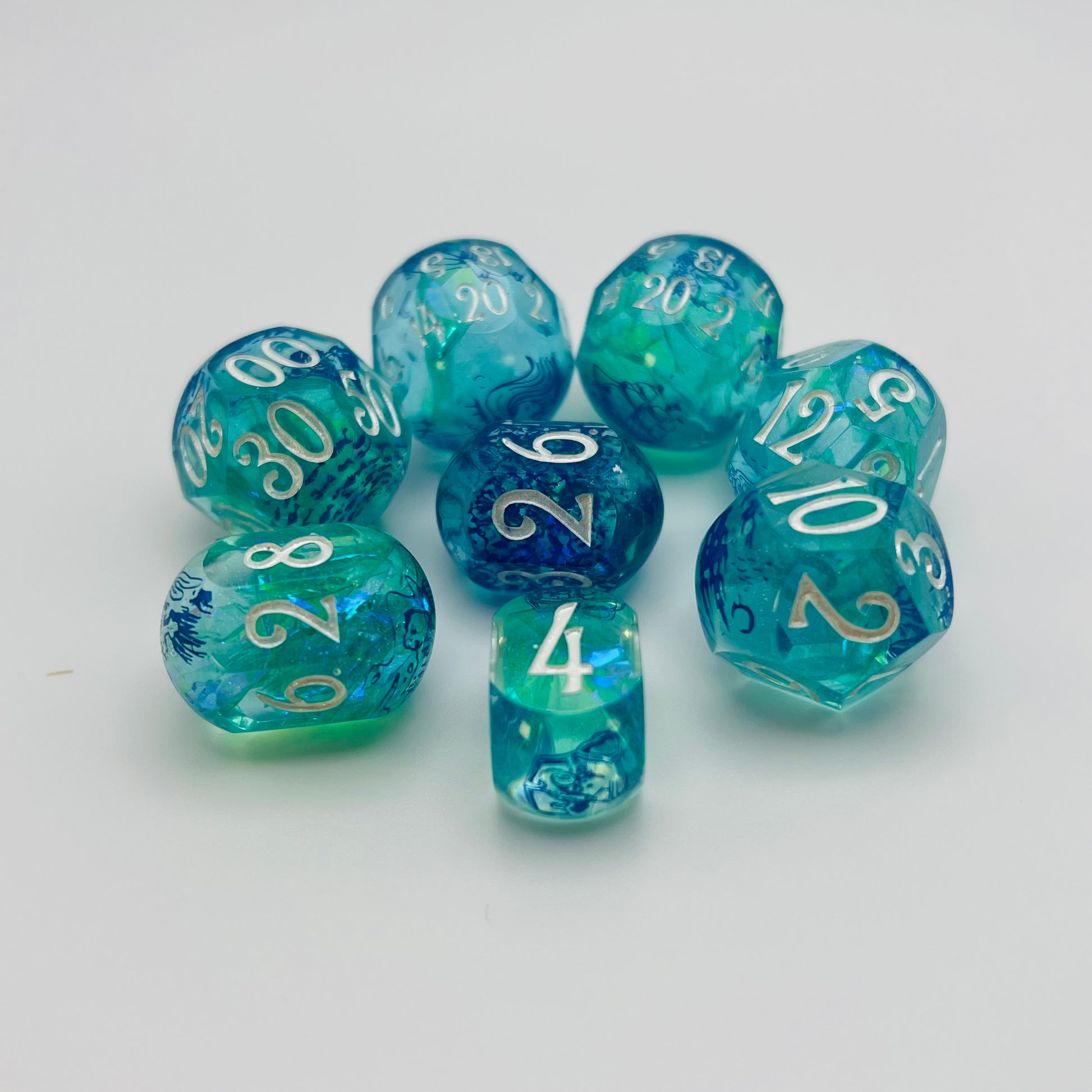 Unravel the legends of the deep with Mariner’s Myth. These mesmerizing orb-style dice hold the secrets of the ocean within their sparkly blue-green depths. With scenes of treasure, skeletal mermaids, and legendary ships, each roll beckons you into an unforgettable adventure beneath the waves.