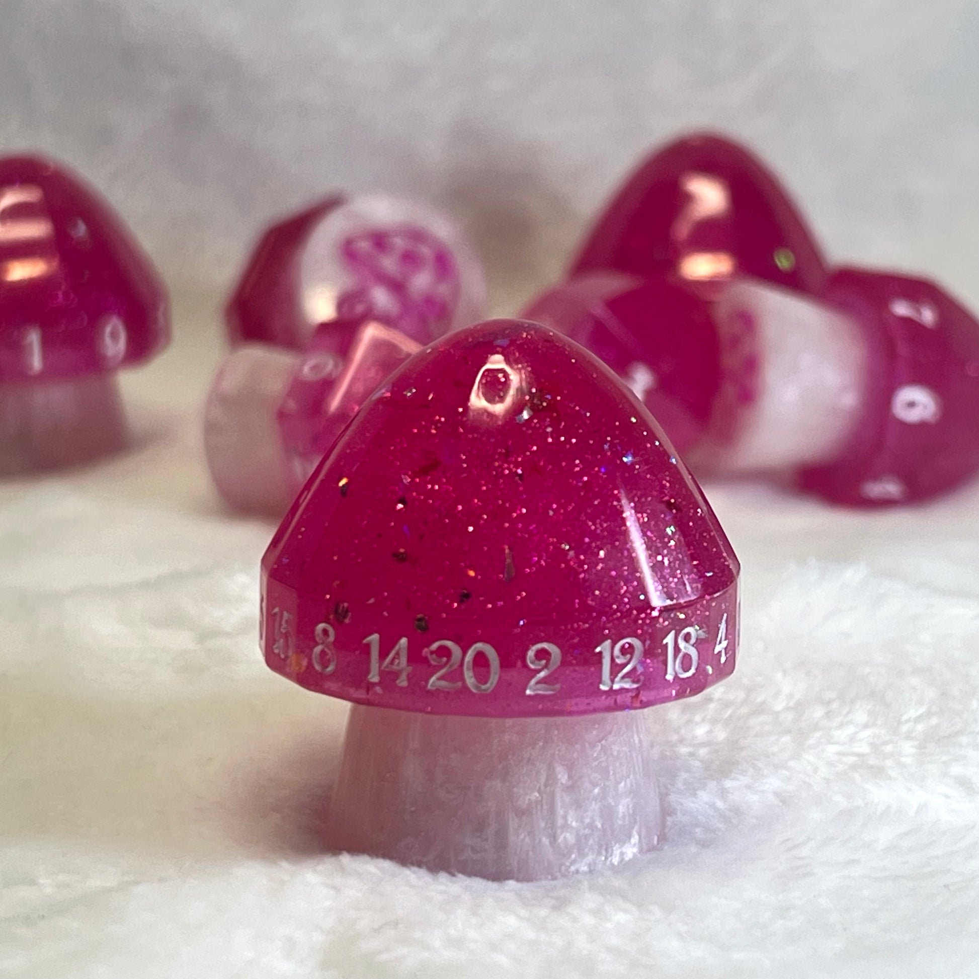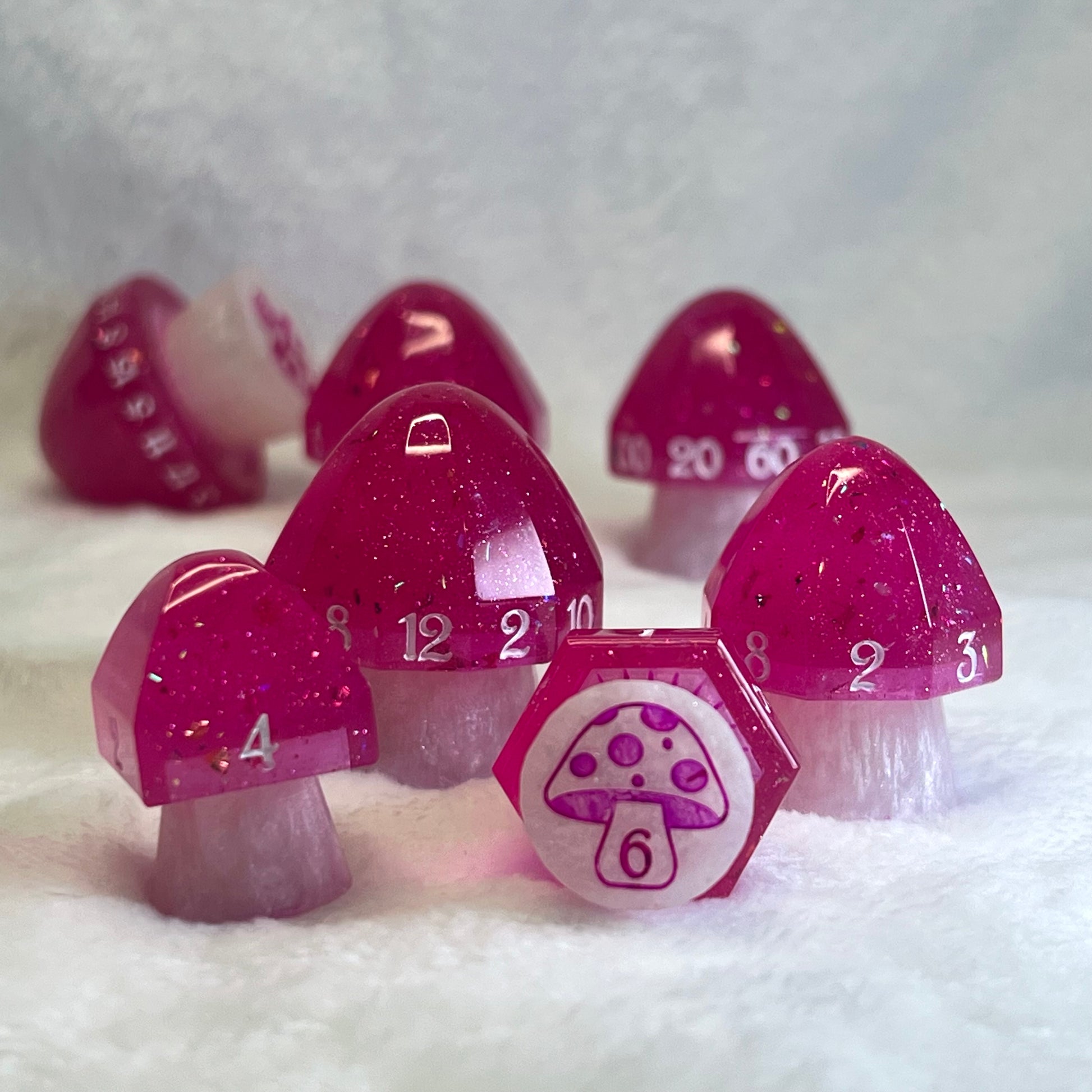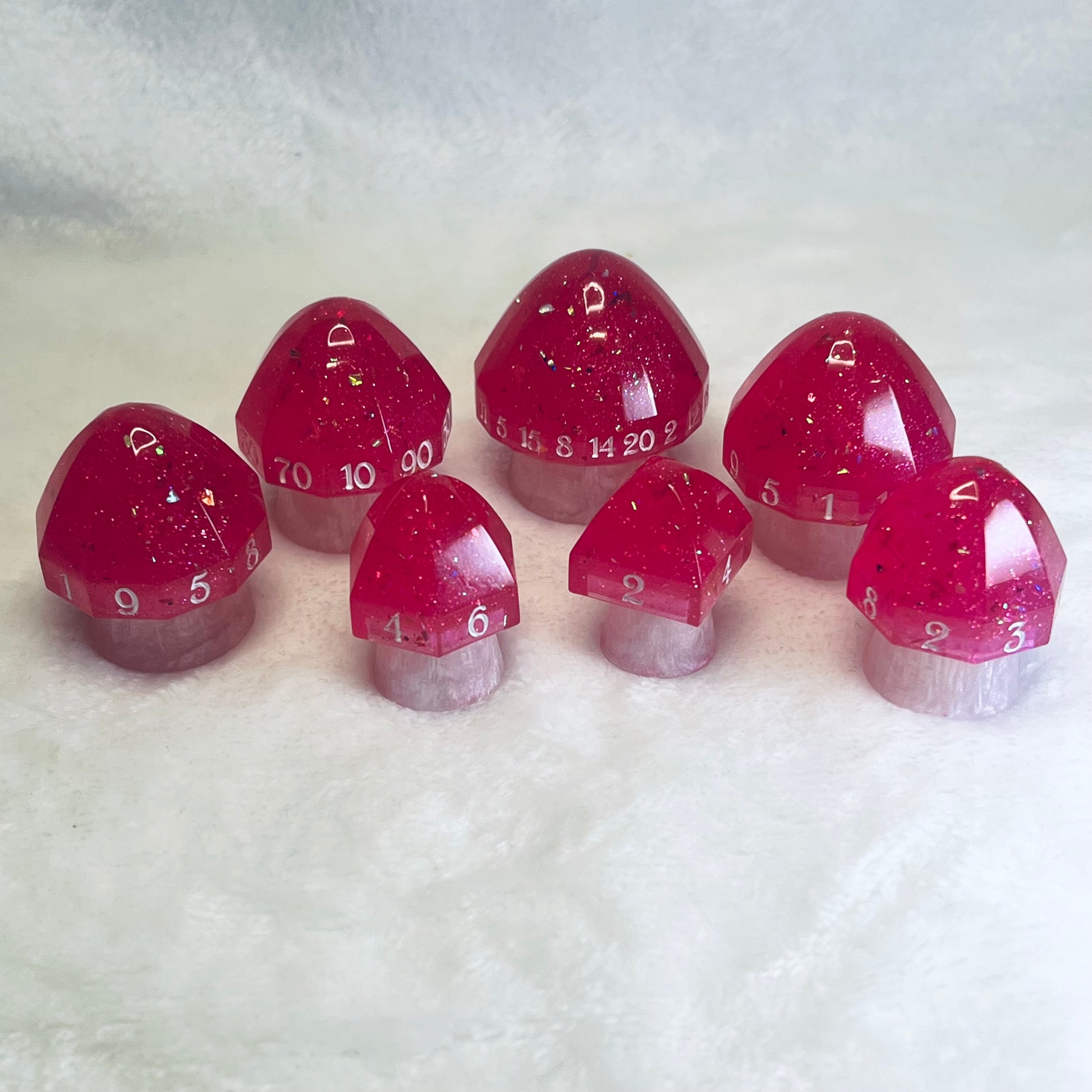 These whimsical mushroom dice sparkle with hot pink caps and white stems, as if plucked from a pixie’s favorite tea party. Enchanting yet practical, each die has a label on the bottom—because even in fairy mischief, a little clarity goes a long way.