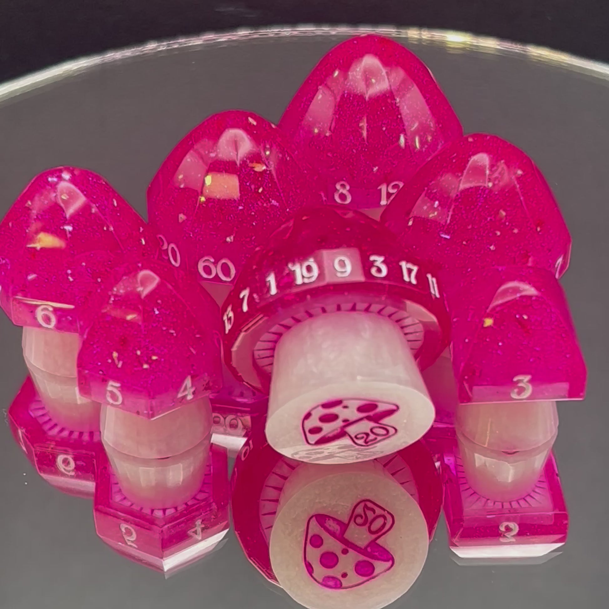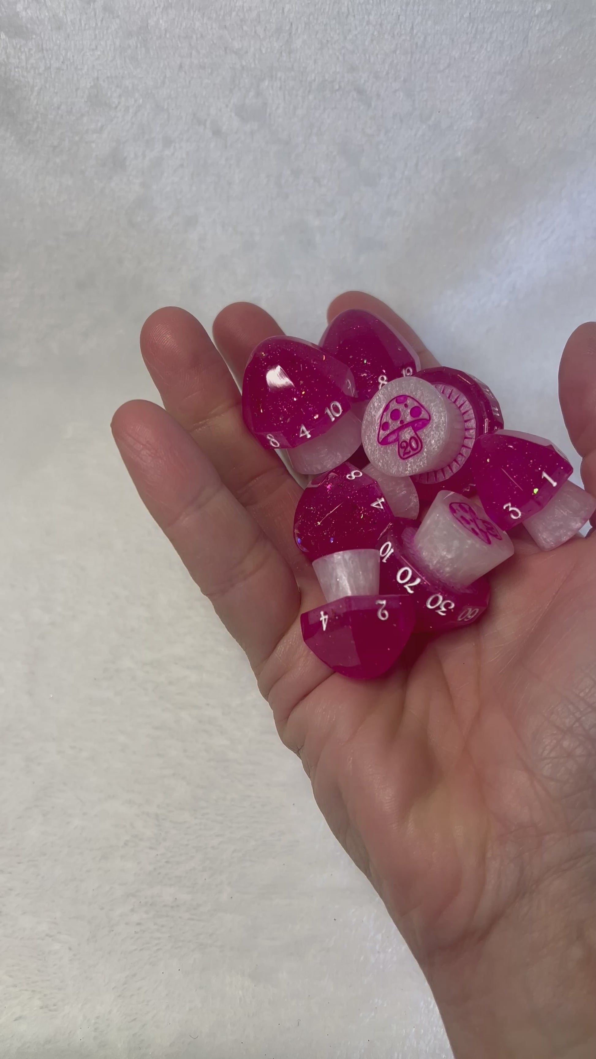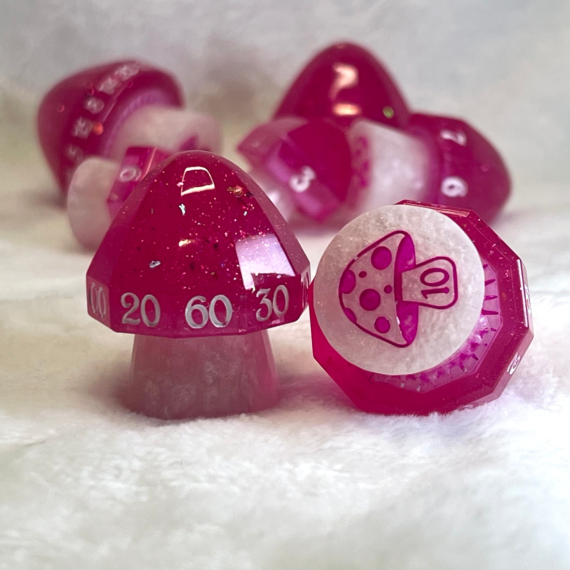 These whimsical mushroom dice sparkle with hot pink caps and white stems, as if plucked from a pixie’s favorite tea party. Enchanting yet practical, each die has a label on the bottom—because even in fairy mischief, a little clarity goes a long way.