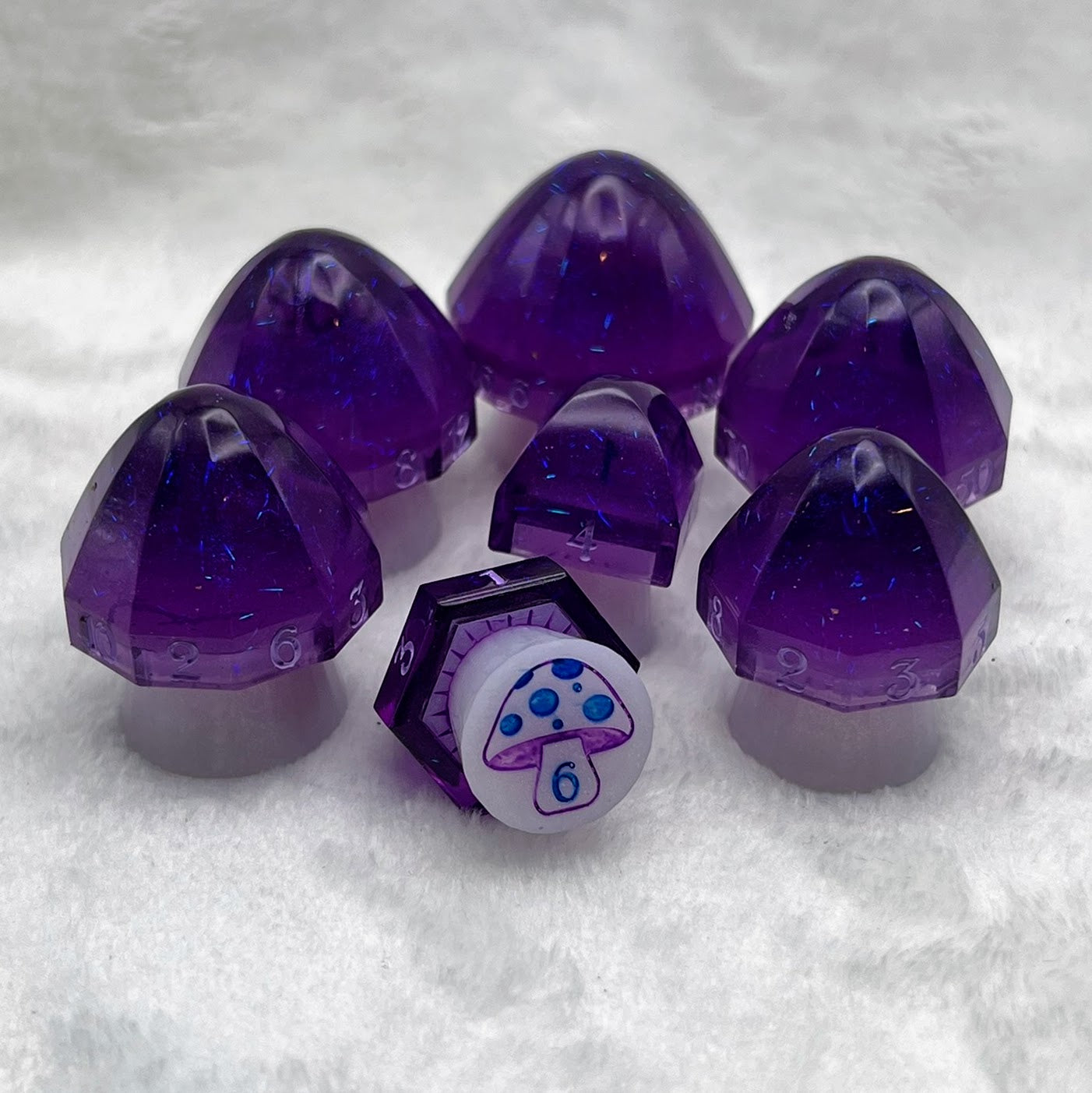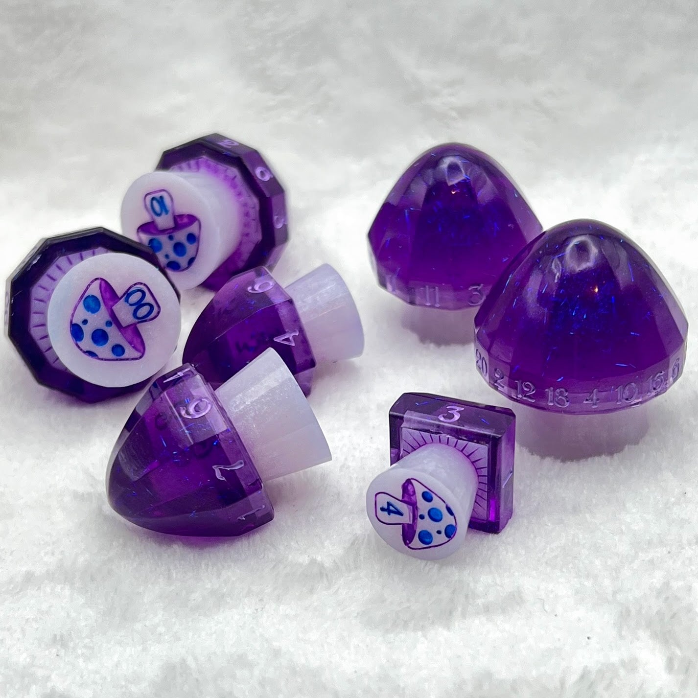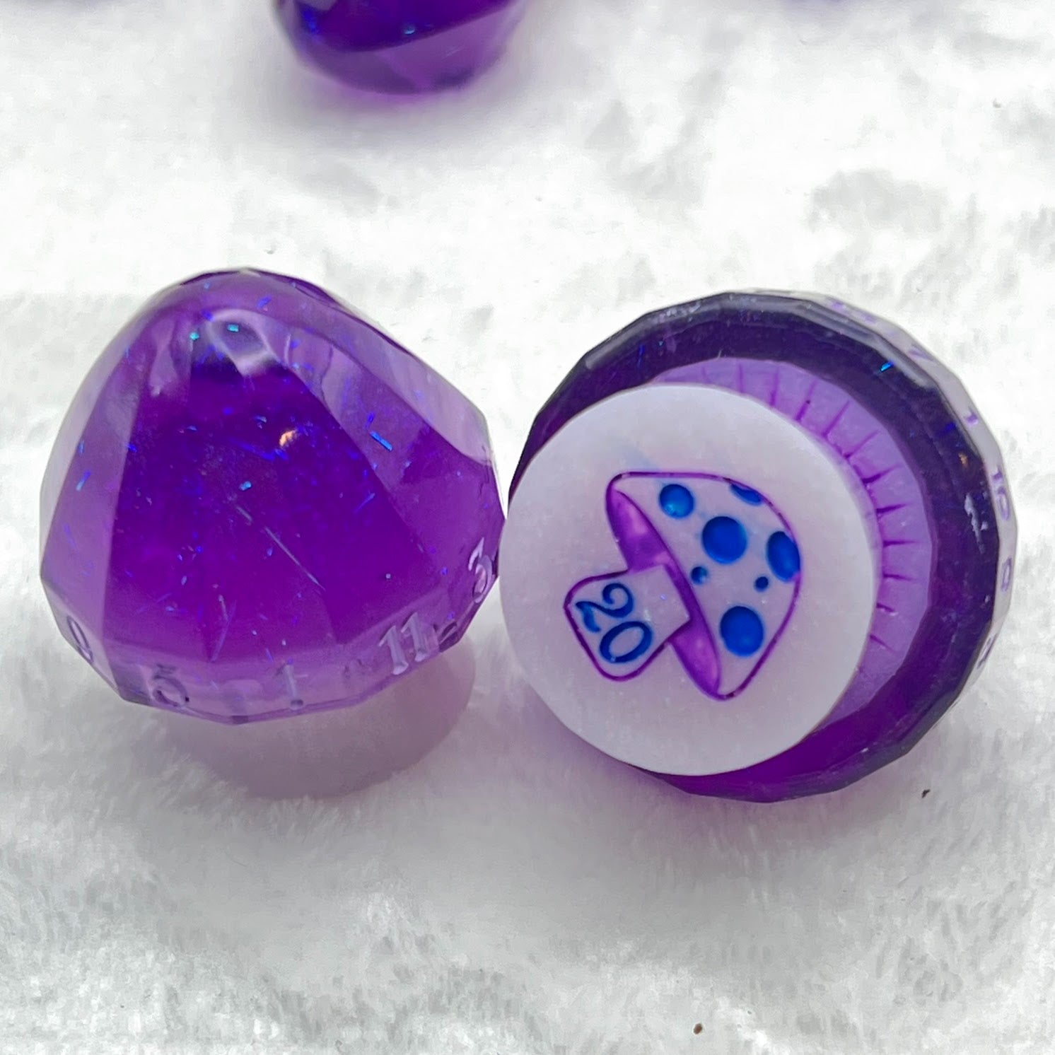 These purple-capped mushroom dice shimmer with electric blue sparkles and just a hint of trouble. Hand-shaped and full of personality, they’re perfect for forest tricksters, potion-brewers, or anyone who knows better than to trust a mushroom—but might do it anyway.