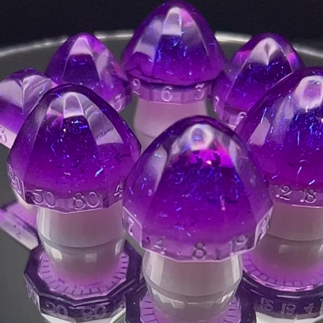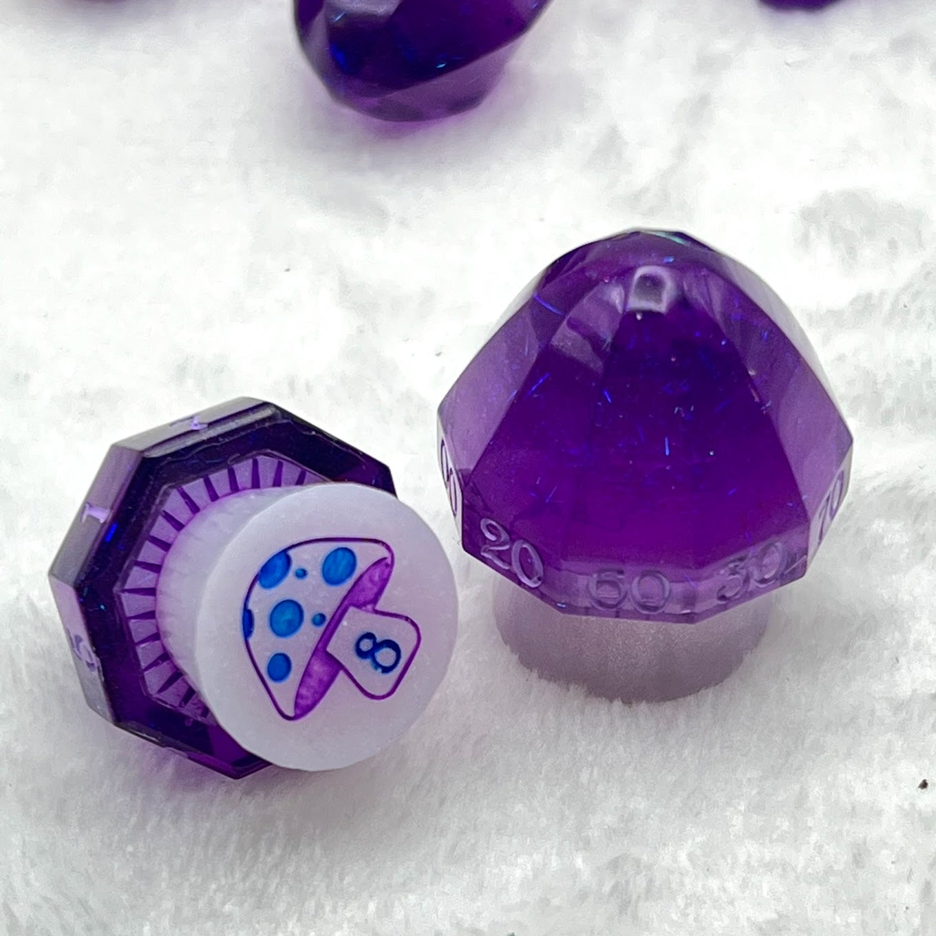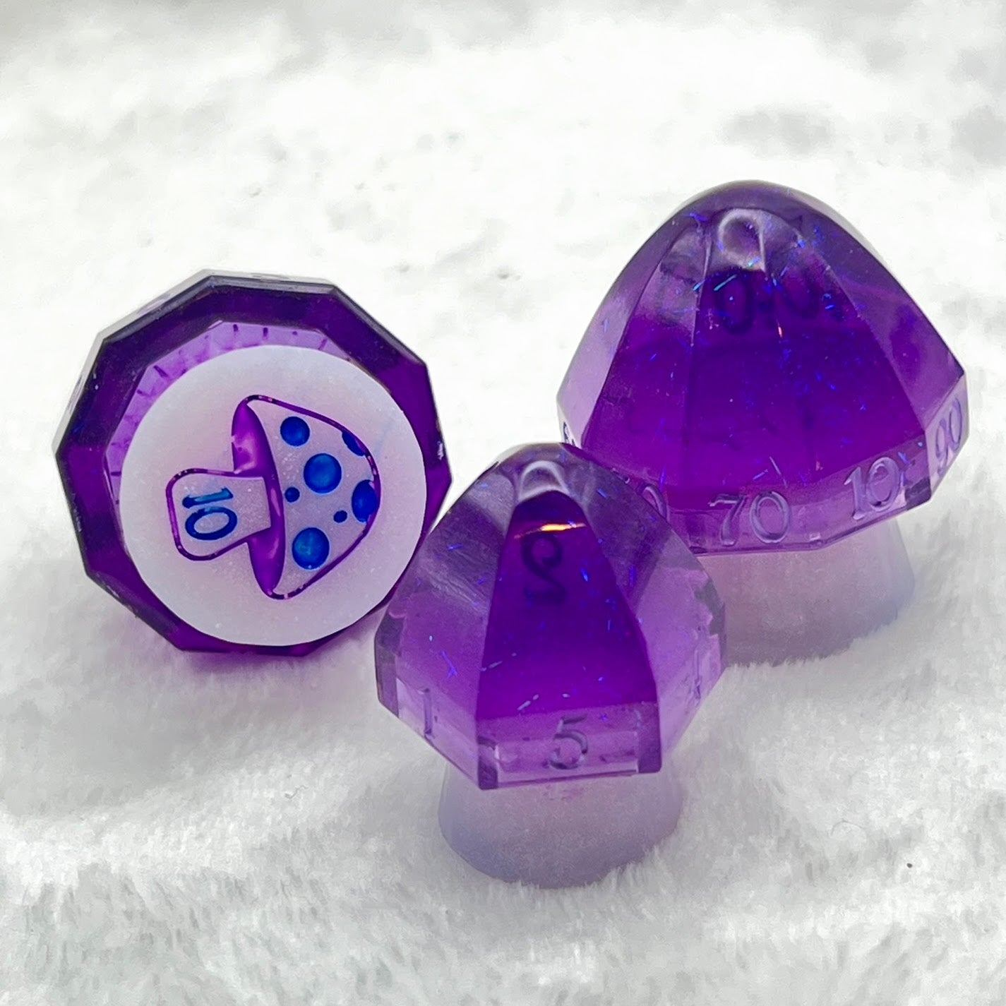 These purple-capped mushroom dice shimmer with electric blue sparkles and just a hint of trouble. Hand-shaped and full of personality, they’re perfect for forest tricksters, potion-brewers, or anyone who knows better than to trust a mushroom—but might do it anyway.