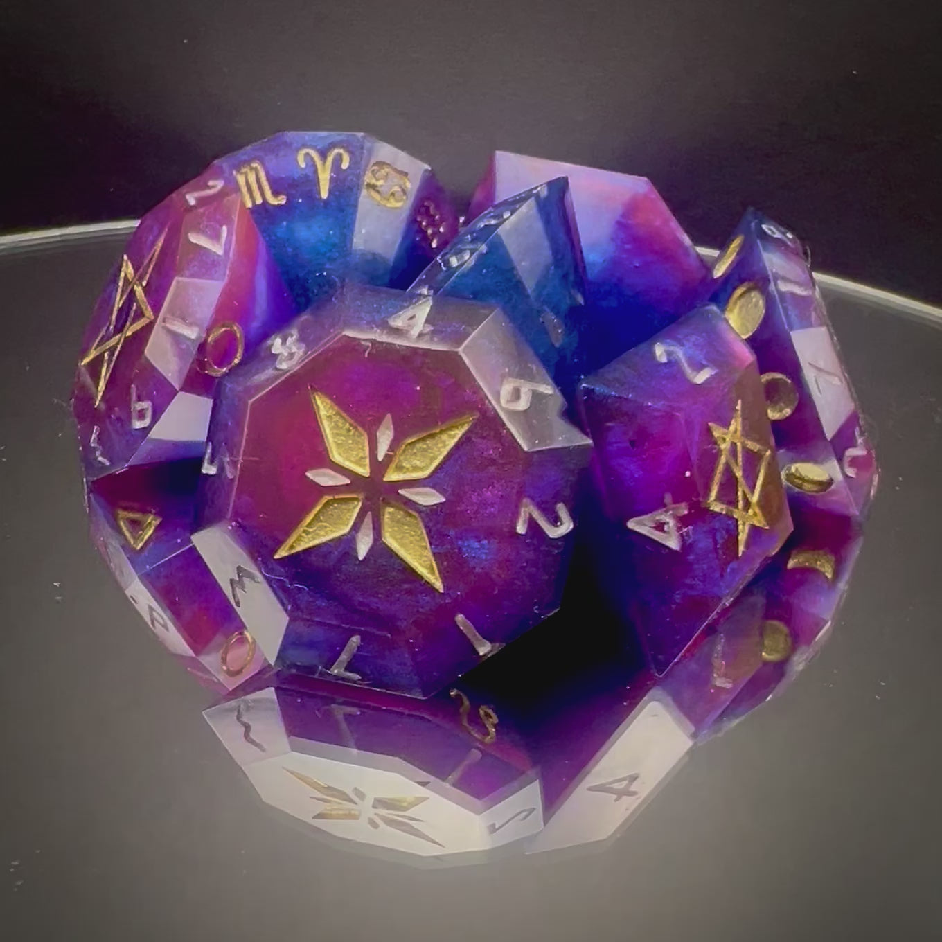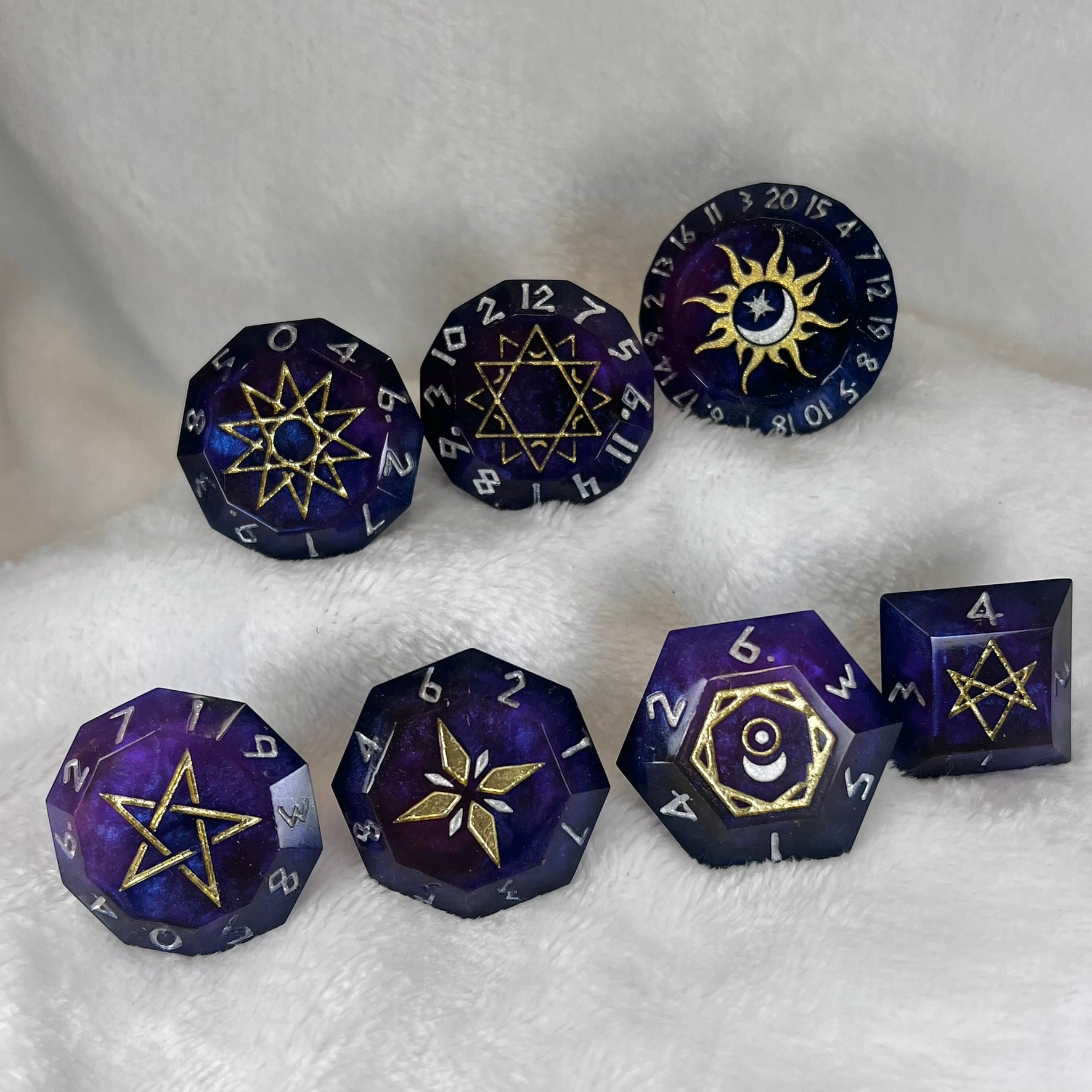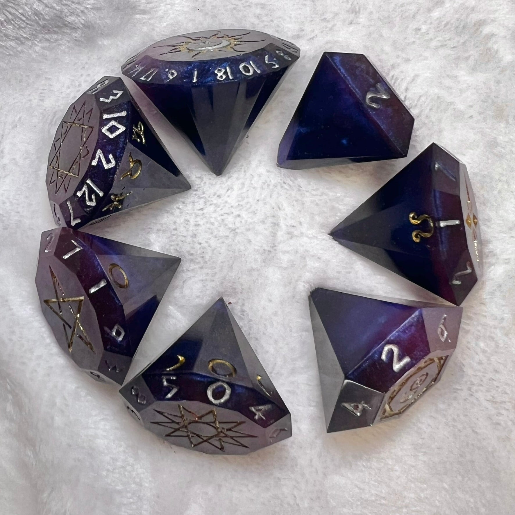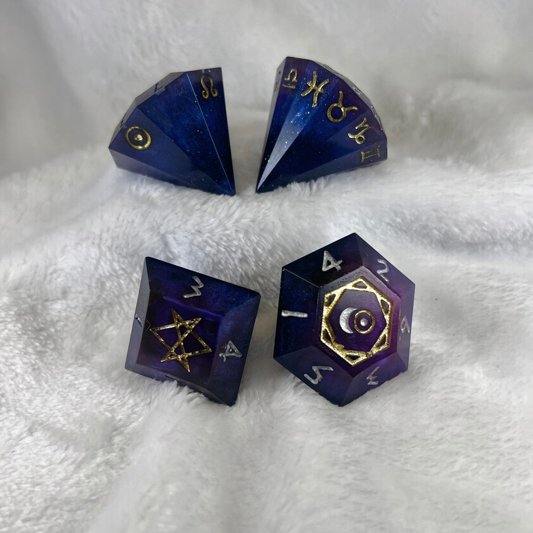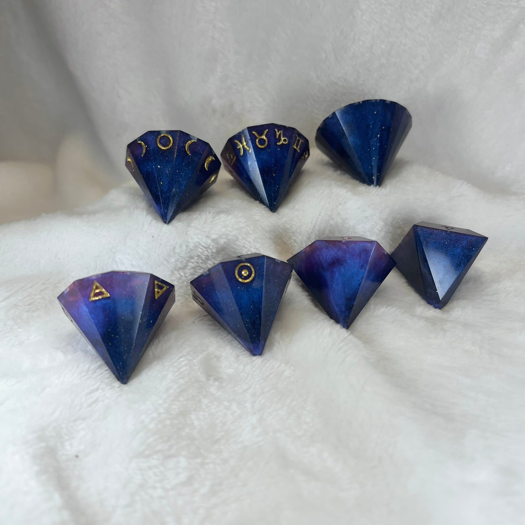 - Shaped like giant diamonds and etched with ancient symbols of the cosmos and arcane magic, cosmic crystal style dice make a statement at the table.