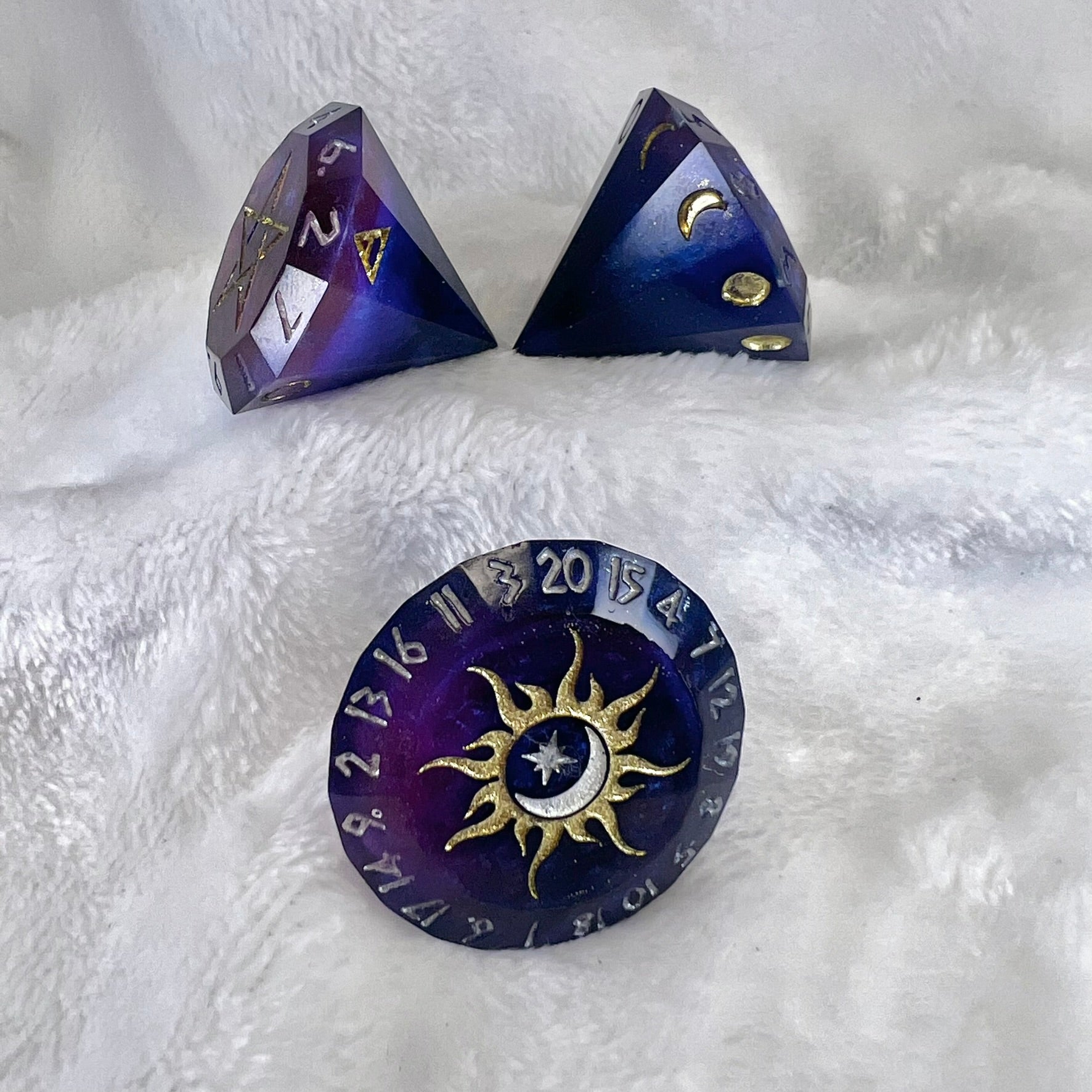 These oversized diamond crystal dice bring the heavens to your table. Each die is a gateway to the stars, featuring cosmic symbols and arcane designs that shimmer in gold and pearl. The galaxy-style pour gives them a depth as infinite as the night sky, and their unique shape offers a whirling roll unlike any other. Perfect for those who walk between the worlds of magic and mystery.