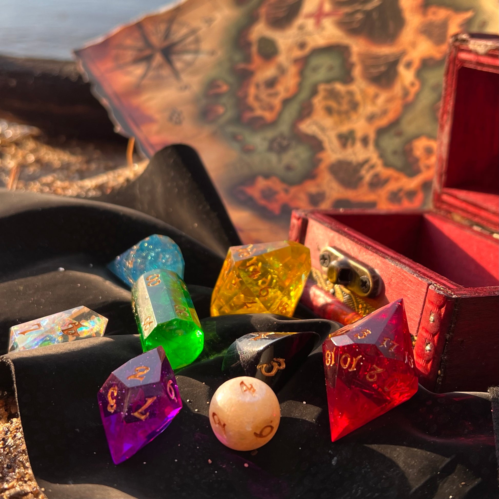 Delve into the Captain's Cache and uncover a set of dice as varied and vibrant as the ocean’s bounty. These unique gem-shaped dice, reminiscent of precious stones, are perfect for any pirate looking to add a touch of treasure to their game.