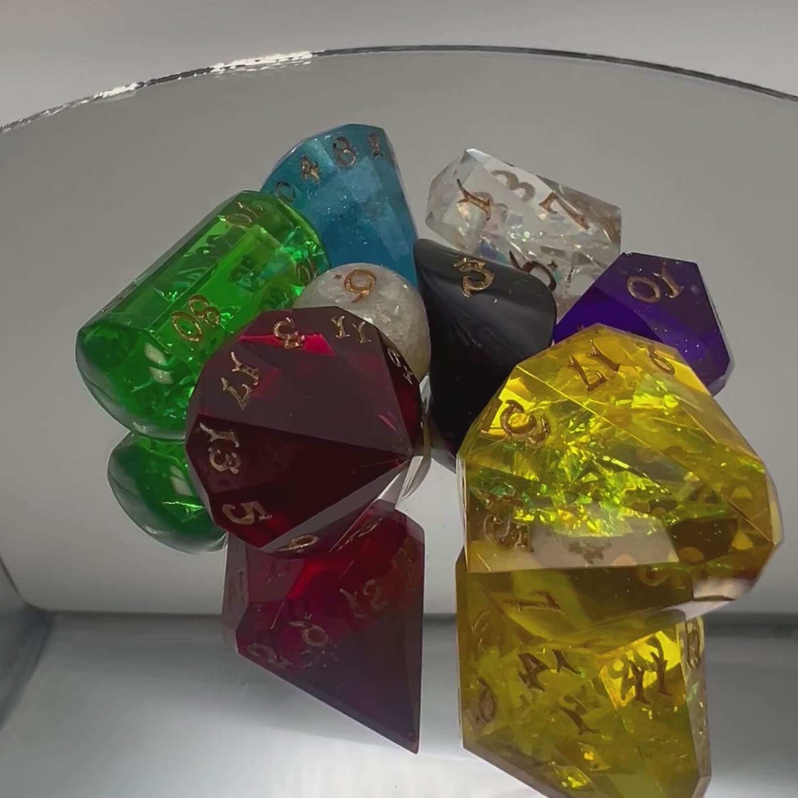 - Obviously these aren’t real gems. Like most of my dice, they are made of resin. Their color comes from ink or dye, and the inner sparkle comes from mylar film and/or color-shifting powders.